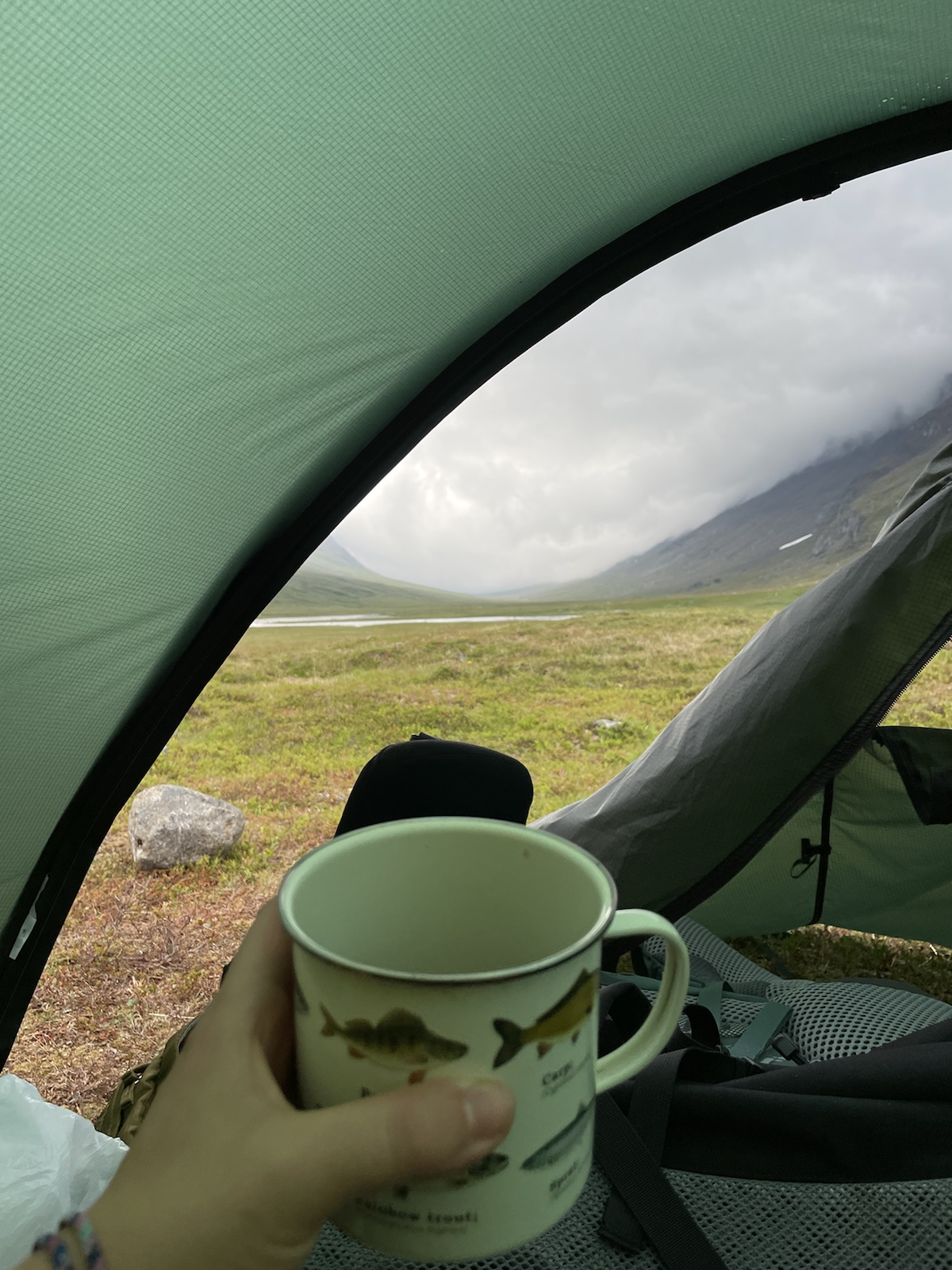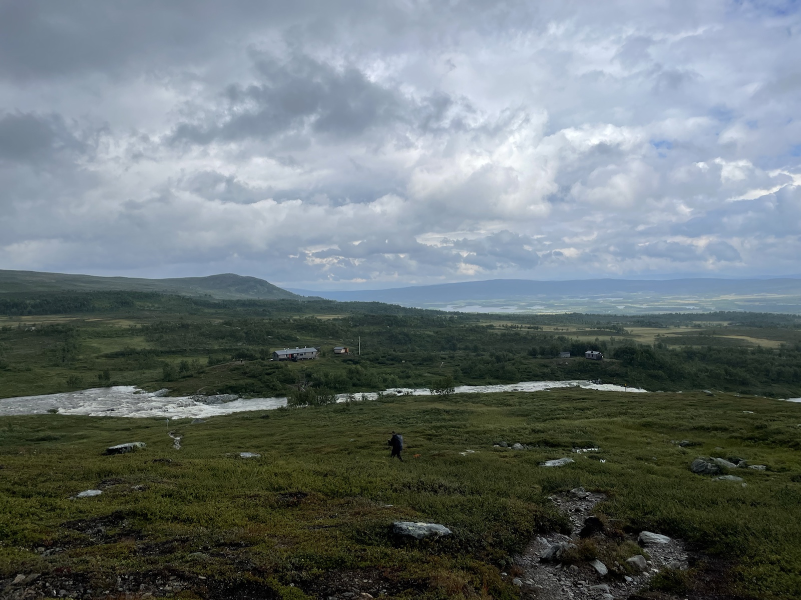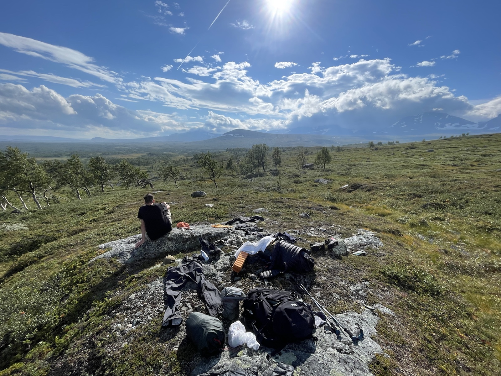 Der Tag begann nach einer von Windböhen geprägten Nacht mit einem leichten Nieselregen. Als wir babei waren, unser Zelt einzupacken, begann es in strömen zu regnen. Die teure Regenjacke, welche ich mich in der Hoffnung auf Trockenheit gekauft hatte, liess innert kürzester Zeit durch und auch die Schuhe gaben irgendwann auf.Der Weg verwandelte sich irgendwann in einen Fluss und wir gingen eige tlich nur noch neben dem Weg. Hinzu kamen starke Windböhen, welche unser Fortkommen erschwerten. Unterwegs trafen wir einen – ebenfalls durchnässten aber sehr heiteren – Engländer, welcher uns informierte, dass in ca. 20 Minuten eine Nothütte stehe, wobei er annehme, dass diese ziemlich voll sein werde. Natürlich bin ich auf dem Schlamm ausgerutsch (s.U. Verletzungscorner).Als wir dort ankamen, war es nazürlich voll. Ich bestand jedoch darauf, dass wir kurz reingehen, weil gerade ein pasr Leute dabei waren, ihre Sachen zu packen. Vor der Tür versperrte ein sehr unsympatischer Schwede (bisher der einzige unsympatische Mensch auf unserer Reise) den Eingang und wir mussten ihn fast zur Seite schieben um reinzukommen. Drinnen war die luft muffig und die Stimmung angespannt. Wir machten uns schnell Kaffee, um uns aufzuwärmen und verliessen die Hütte schnellstmöglichh wieder (es kamen auch immer mehr Leute rein, welche ebenfalls dirchnässt waren).Oben auf dem Hügel angekommen, erwartete uns auf der andere Seite wunderbares Wetter. Auf der Terasse der STF-Hütte (siehe unten) durften wir kurz unsere Kleider trocknen. Als jedoch der unsympatische Schwede ebenfalls ankam und seine Nassen Sachen über unsere legte, beschlossen wir weiterzugehen.Schliesslich fanden wir einen guten Platz, um unsere Rucksäcke zu öffnen und zu schauen, was alles noch trocken war. Abgesehen von den Daunenjacken, welche wir nicht in einem Drybag hatten, waren unsere Sache trocken, die Rucksäcke und alles was wir anhatten jedoch nass.Also packten wir alles nasse aussen an unsere Rucksäcke.Bei diesem Wasser aus dem See haben wir zum ersten Mal unseren Wasserfilter benutzt. Zuvor haben wir das Wasser immer direkt aus den Flüssen getrunken. Fühlte sich zunächst eigenartig an, aber bisher ist es uns gut ergangen.Nach wunderschönem Wetter bahnte sich ein Gewitter an. Welches uns zum Glück nur streifte und schnell vorüberzog.