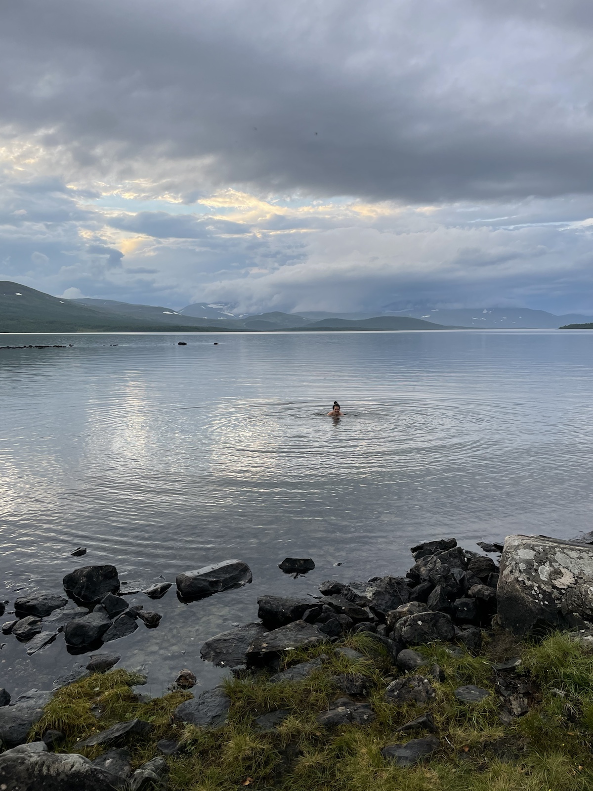 Schliesslich fanden wir – dank dem Jedermannsrecht (s.U.) – einen Zeltplatz direkt am See, wo wir kurz baden konnten, bevor das zweite Gewitter kam, welchem nächtlicher Dauerregen folgte.