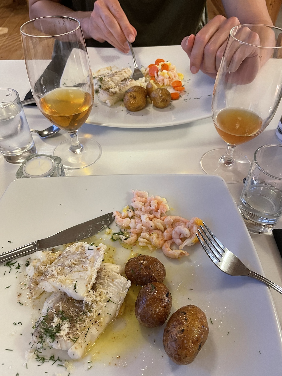 Auf google Maps hatten wir gelesen, dass das Nachtessen in der Unterkunft gut sein soll, jedoch stand nurgends der Preis. Wir reservierten auf Anraten des Rezeptionisten. Am Abend setzten wir uns und es wurde uns mitgeteilt, dass es ein Dreigangmenü sein würde. Von da an wussten wir, dass es ein Fehler gewesen war und es Teuer werden würde (100.- ). Es gab randen mit Chèvre, Honig und Nüssen. Fisch (versalzen) und zum Nachtisch Vanilleeis mit Beeren. Eigentlich war es nicht schlecht, nur es reute uns das Geld. Am Abend platen wir unsere kommenden Etappen, bei denen wir keine bewirteten STF Hütten haben würden, was nucht schlimm war, zumal wir bisher immer im Zelt übernachtet und unser eigenes Essen getragen hatten. 91 km in viert Tagen war der Plan.