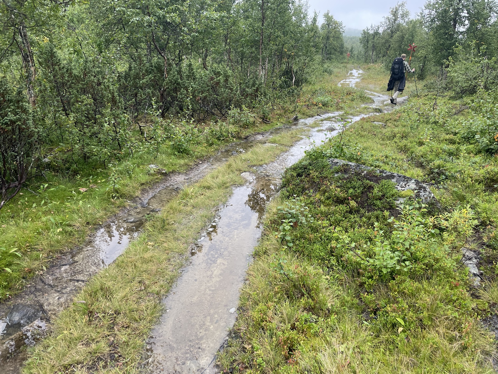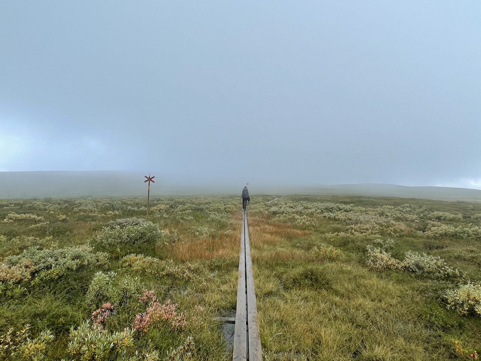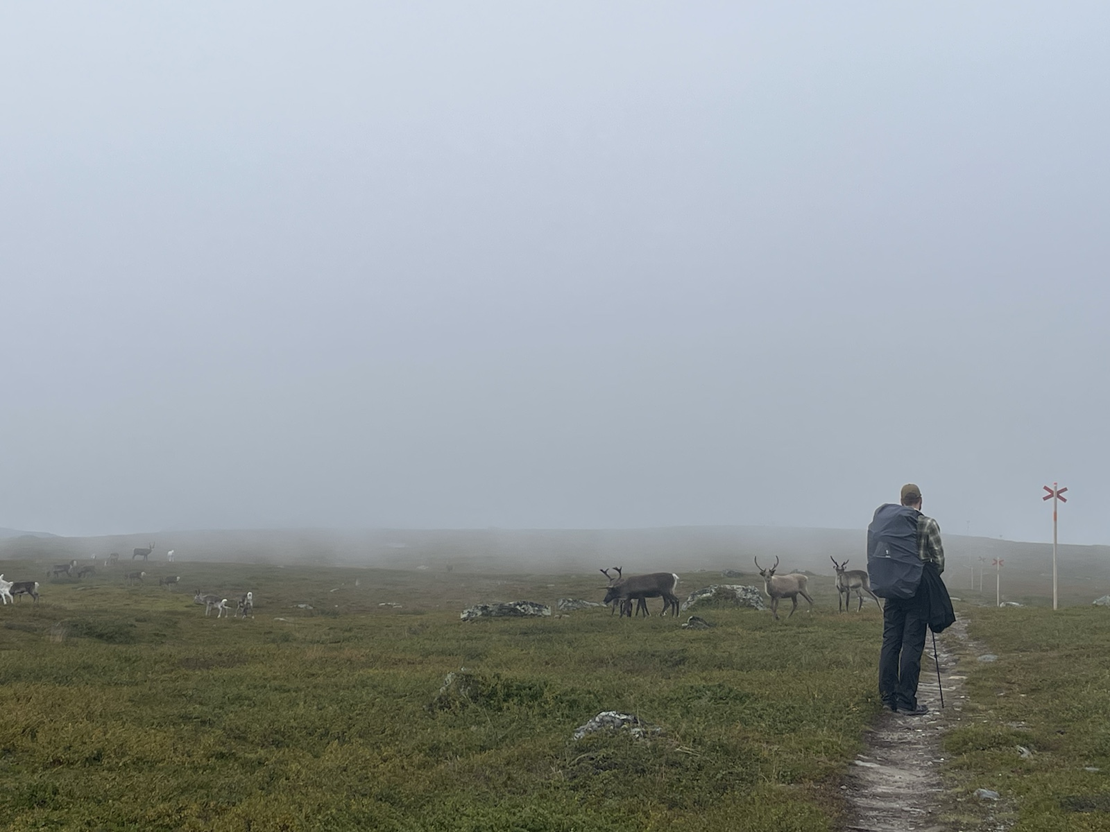 Der zweite Teil begann mit einem langen Aufstieg (ca. 600m). Es war erstaunlich kalt und neblig.Oben angekommen begann die Nässe. Der Regen hatte sich oben gesammelt. Es gab Pfützen überall und teilweise wurde der Weg einfach von einem kleinen See geteilt. Ich weiss nicht genau, wann unsere Schuhe wieder durchnässt waren, jedoch dauerte es nicht lange.Als wir unsere Wasserflascheb nach dem Aufstieg wieder auffüllen wollten entdeckten wir eine kleine Fischerhhütte, bei der sich ein paar Fischer befanden. Ebenso hatte es ein Plumpsklo, was für ein Glück (die Standards sinken SEHR schnell beim Wandern).Einer der vielen Pfützen, welche wir umgehen mussten. Auch war der Weg grössenteils – wie bereits am zeiten Tag – eigentlich ein Fluss.Dann ging die Wolkendecke auf. Die ersten herbstlichen Farben machten sich erkennbar. Ich machte gefühlt tausend Wolkenfotos.Oben auf dem Hochplateau wieder ein Hochmoor und Wind. Damals fanden wir noch, dass es ein starker Wind war, da wir nicht wussten, was folgen würde.Auf dem Plateau gab es viele Rentiere. Da sie schlecht sehen, bemerken sie einen bei den richtigen Windverhältnissen erst spät und kommen sehr nahe, wenn man sich nicht bewegt.Nach dem Aufstieg folgt der Abstieg. Mein schräger Rucksack (wegen der Schaumstoffmatte, welche in hinten aussen befestigt habe).Wieder unten in einem Tal kommen wir an eine leere STf Hütte an. Eine Frau, welche wir jnterwegs tragen, erklärte uns, dass man einen Schlüssel im Ammarnäs holen muss, um Zugang zu haben. Sie hätte glück gehabt, dass jemand den Schlüssel gehabt hatte, da sie ihre Wanderung wegen dem starken Regen unterbrechen und im Haus Schutz suchen mussten. Als wir dort waren, war niemand im Haus. In der Nacht war es auch etwas unheimlich. Immerhin: Plumpsklos. Neben unserem Zelt, welches wir im Wald aufstellten, befand sich noch ein zweites Zelt dort. In der Nacht hatten wir noch keinen Kontakt, jedoch würden wir den Franzosen am nächsten Tag in einer Nothütte wieder treffen. Auf der anderen Seite der Brücke entdeckten wir „pools“ neben dem reissenden Fluss. Die zwar kalt waren, aber keine Strömung hatten. Darin reinigten wir unser Geschirr und uns selbst.