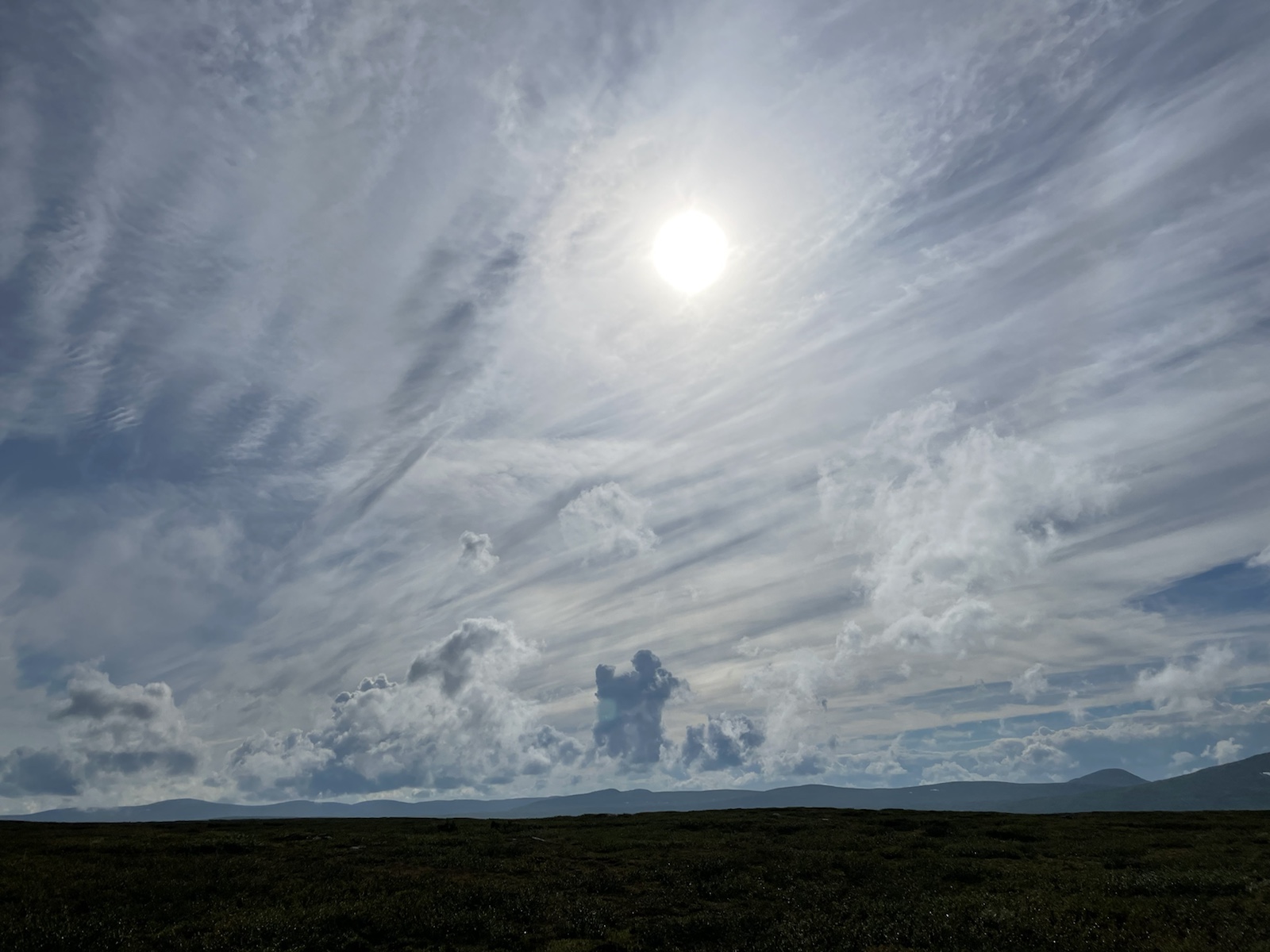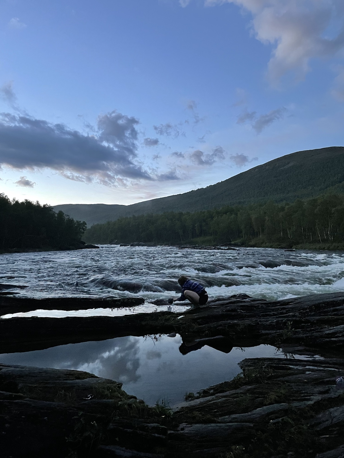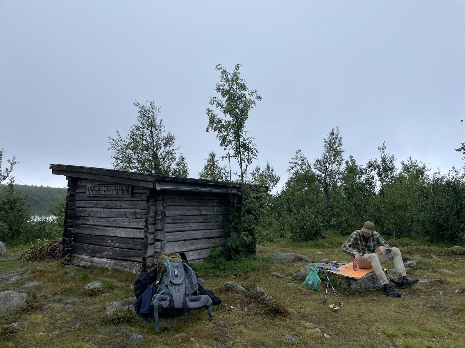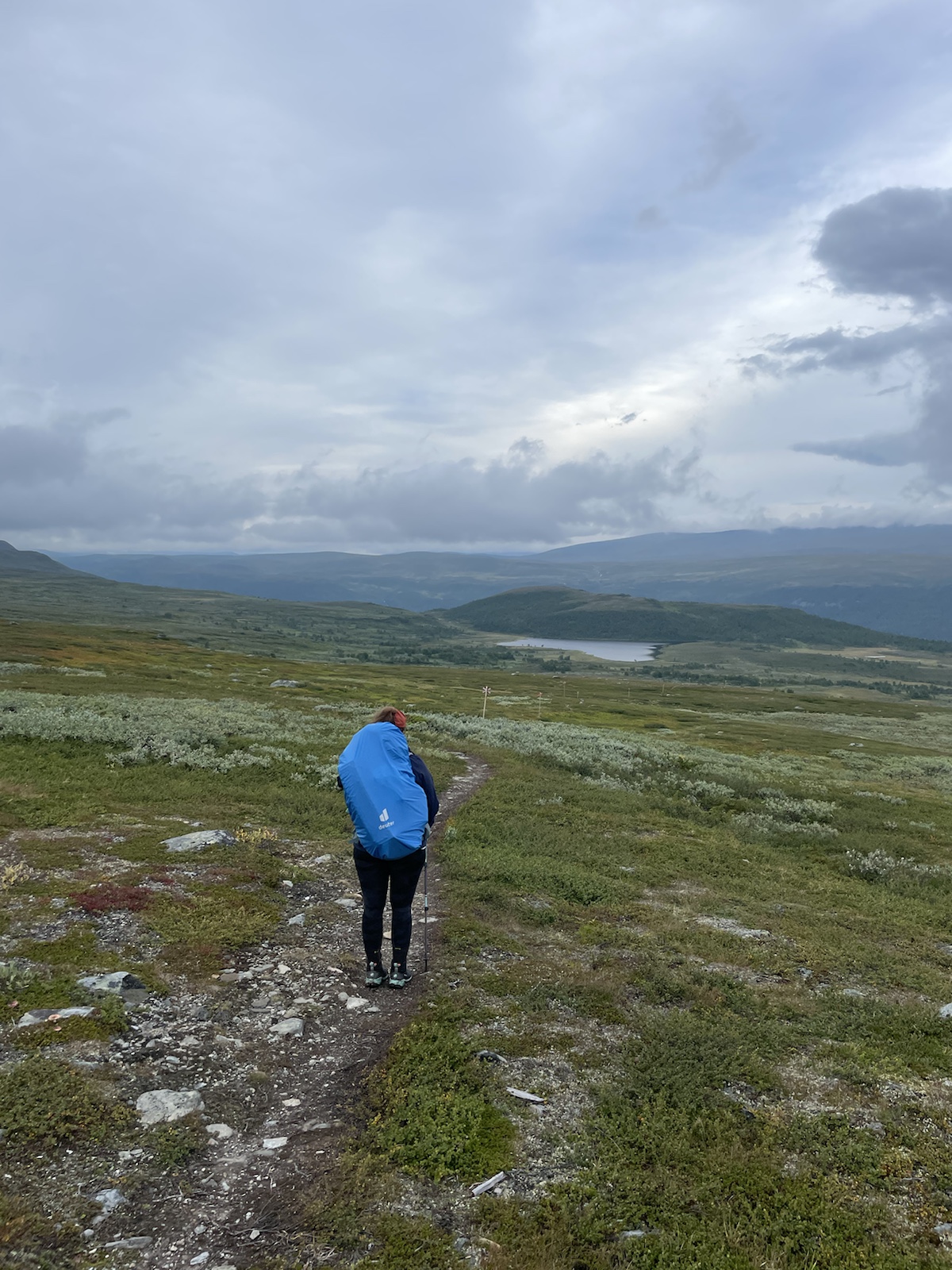 Der zweite Teil begann mit einem langen Aufstieg (ca. 600m). Es war erstaunlich kalt und neblig.Oben angekommen begann die Nässe. Der Regen hatte sich oben gesammelt. Es gab Pfützen überall und teilweise wurde der Weg einfach von einem kleinen See geteilt. Ich weiss nicht genau, wann unsere Schuhe wieder durchnässt waren, jedoch dauerte es nicht lange.Als wir unsere Wasserflascheb nach dem Aufstieg wieder auffüllen wollten entdeckten wir eine kleine Fischerhhütte, bei der sich ein paar Fischer befanden. Ebenso hatte es ein Plumpsklo, was für ein Glück (die Standards sinken SEHR schnell beim Wandern).Einer der vielen Pfützen, welche wir umgehen mussten. Auch war der Weg grössenteils – wie bereits am zeiten Tag – eigentlich ein Fluss.Dann ging die Wolkendecke auf. Die ersten herbstlichen Farben machten sich erkennbar. Ich machte gefühlt tausend Wolkenfotos.Oben auf dem Hochplateau wieder ein Hochmoor und Wind. Damals fanden wir noch, dass es ein starker Wind war, da wir nicht wussten, was folgen würde.Auf dem Plateau gab es viele Rentiere. Da sie schlecht sehen, bemerken sie einen bei den richtigen Windverhältnissen erst spät und kommen sehr nahe, wenn man sich nicht bewegt.Nach dem Aufstieg folgt der Abstieg. Mein schräger Rucksack (wegen der Schaumstoffmatte, welche in hinten aussen befestigt habe).Wieder unten in einem Tal kommen wir an eine leere STf Hütte an. Eine Frau, welche wir jnterwegs tragen, erklärte uns, dass man einen Schlüssel im Ammarnäs holen muss, um Zugang zu haben. Sie hätte glück gehabt, dass jemand den Schlüssel gehabt hatte, da sie ihre Wanderung wegen dem starken Regen unterbrechen und im Haus Schutz suchen mussten. Als wir dort waren, war niemand im Haus. In der Nacht war es auch etwas unheimlich. Immerhin: Plumpsklos. Neben unserem Zelt, welches wir im Wald aufstellten, befand sich noch ein zweites Zelt dort. In der Nacht hatten wir noch keinen Kontakt, jedoch würden wir den Franzosen am nächsten Tag in einer Nothütte wieder treffen. Auf der anderen Seite der Brücke entdeckten wir „pools“ neben dem reissenden Fluss. Die zwar kalt waren, aber keine Strömung hatten. Darin reinigten wir unser Geschirr und uns selbst.