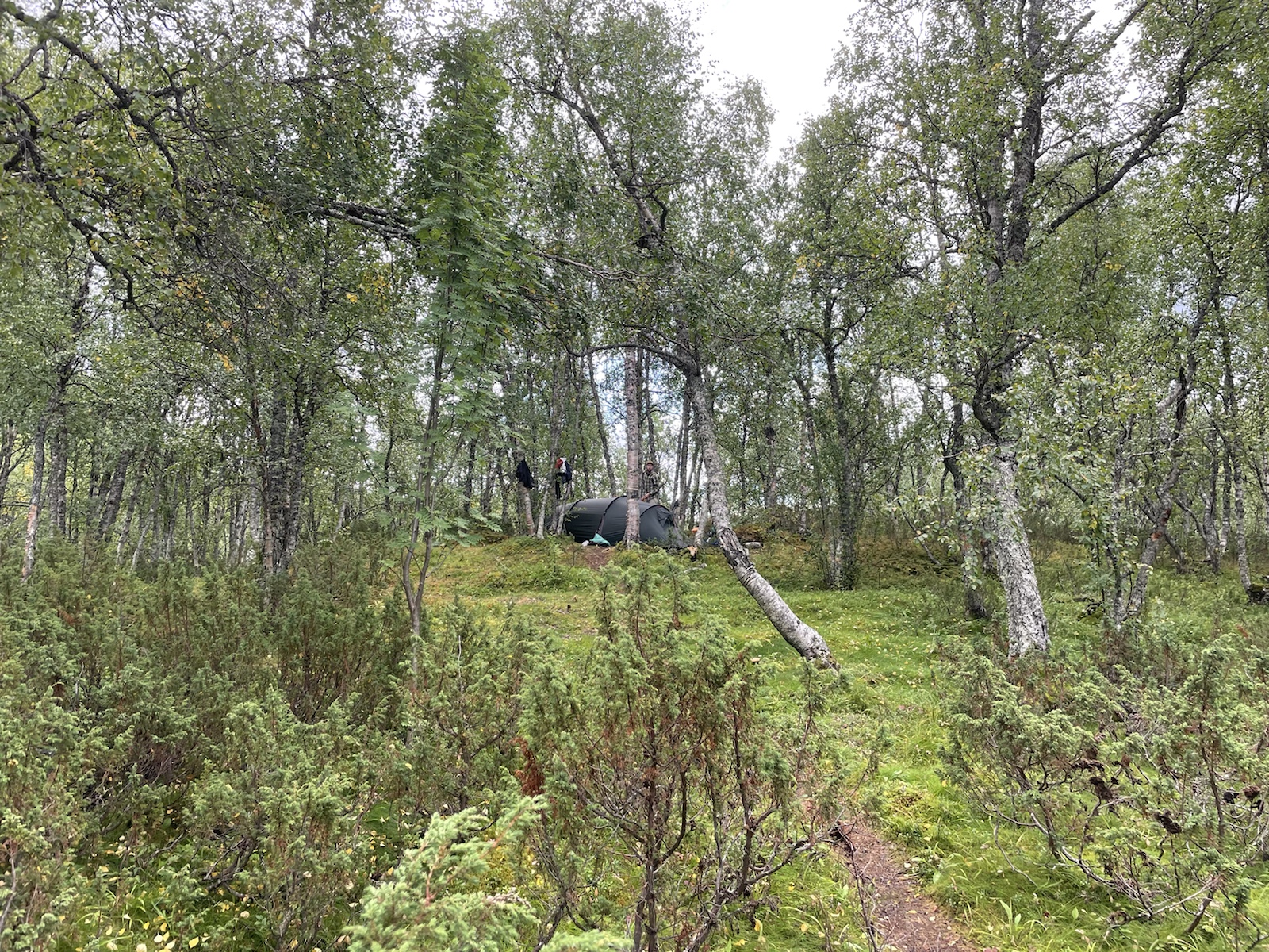 Gute Augen könnten den gut getarnten Döös neben unserem Zelt entdecken. Um ca. 10.25 Uhr (viel zu spät für die geplante 27 km Strecke) starteten wir in drn Tag. Guten Mutes begannen wir mit dem 550m Aufstieg zunächt mit Sonne, gefolgt von leichtem Regen und külem Wetter. Ich hatte die Regensachen, Kappe und Handschuhe ziemlich tief im Rucksack verstaut, weil mein Vater mir mitteilte, dass abmontag Mittag ein Hochdruckgebiet mit scjönem Wetter herrschen Würde (stellt sich heraus, dass er Recht hatte, sich jedoch um einen Tag vertat).