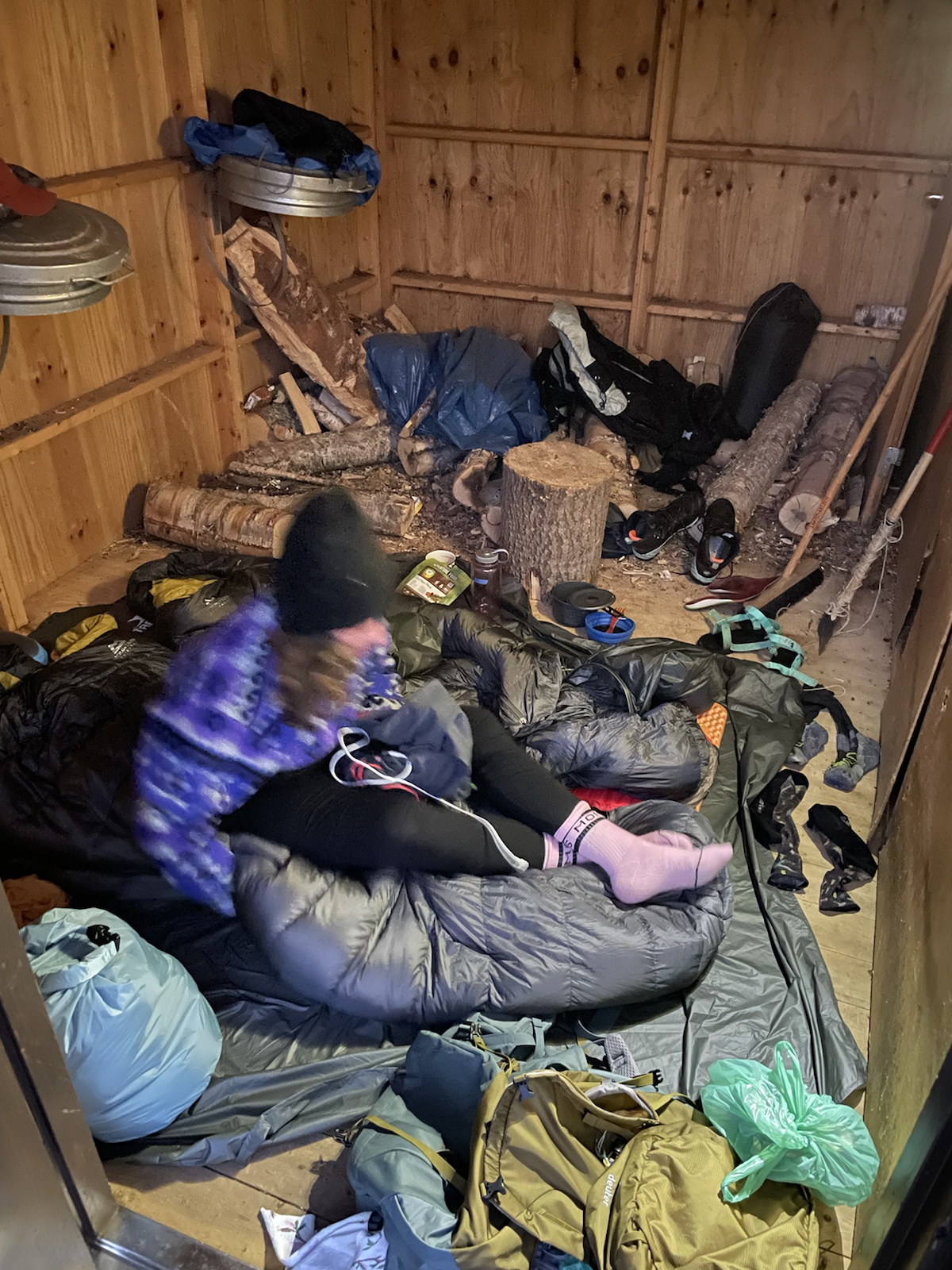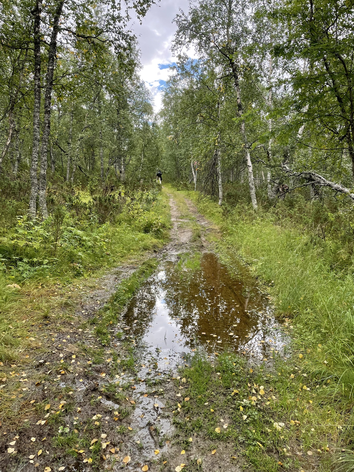 Das blöde war jedoch, dass die im Reiseführer beschriebene Zeltmöglichkeit sich als kleiner Teich entpuppte, da der ganze Teil überflutet war. Wir gingen daher auf der Suche nach einem Zeltplatz weiter durch einen Birkenwald, wobei wir einen vor uns gehenden Wanderer fast einholten. Es stellte sich später heraus, dass es der Franzose war, der in der vergangenen Nacht sein Zelt neben unserem hatte. Plötzlich sahen wir ihn nicht mehr und kamen zu einem Wegweiser, der eine Nothütte bezeichnete. Wir folgten diesem Nebenpfad in der Hoffnung auf Zeltmöglichkeiten neben der Notfallhütte und trafen dort auf den Franzosen. Aus der Nothütte schaute eine Frau raus, welche und fragte, ob wir Deutsche seien. Wir verneinten und erklärten, dass wir Schweizer seien, „Ah dir sit Schwizer, mir o“, zwei sehr nette und hilfsbereite Bernerinnen hatten bereits in der Nothütte Schutz gesucht. Wir suchten nach möglichen Zeltplätzen, während die Schweizerinnen uns erzählten, dass sie 45 Minuten lang erfolglos versucht hätten, ihr Zelt aufzubauen. Der Franzose trat schliesslich nach erfolgloser Suche zu und und erklärte, dass alle Plätze zu exponiert seien und die Zelte, falls man sie überhaupt aufstellen könnte allefalls reissen könnten. Wie gesagt, es waren mittlerweile Sturmböhen. Später würden noch ein Italiener und ein weiterer Franzose zu uns stossen, welche ebenfalls zunächst erfolglos nach einem Zeltplatz suchen, nur um sich schliesslich erfolglos zu uns in die Hütte zu setzen. Die Information, unser Zelt könnte dem Wind nicht standhalten machte uns – nicht nur wegen unseres ultrateuren Zeltes – nervös. Jedoch wollten wir auch nichr im kleinen Raum der Notfallhütte übernachten, der schon mit 5 Personen gefüllt gewesen wäre und jeztzt 7 Personen beherbergte. Ausserdem waren wir alle mindestens zwei Tage ohne Waschmaschine und frische Kleider unterwegs. Insbesondere die Socken rochen entsprechen, was die Luft in der Hütte nicht hilfreich war. Ausserdem fürchteten wir nebem Platzmangel und dem Geruch Schnarchgeräusche. Neben der Hütte hatte es einen kleinen Holzschuppen. Dieser hatte genau Platz für ungefähr zweu Matten.