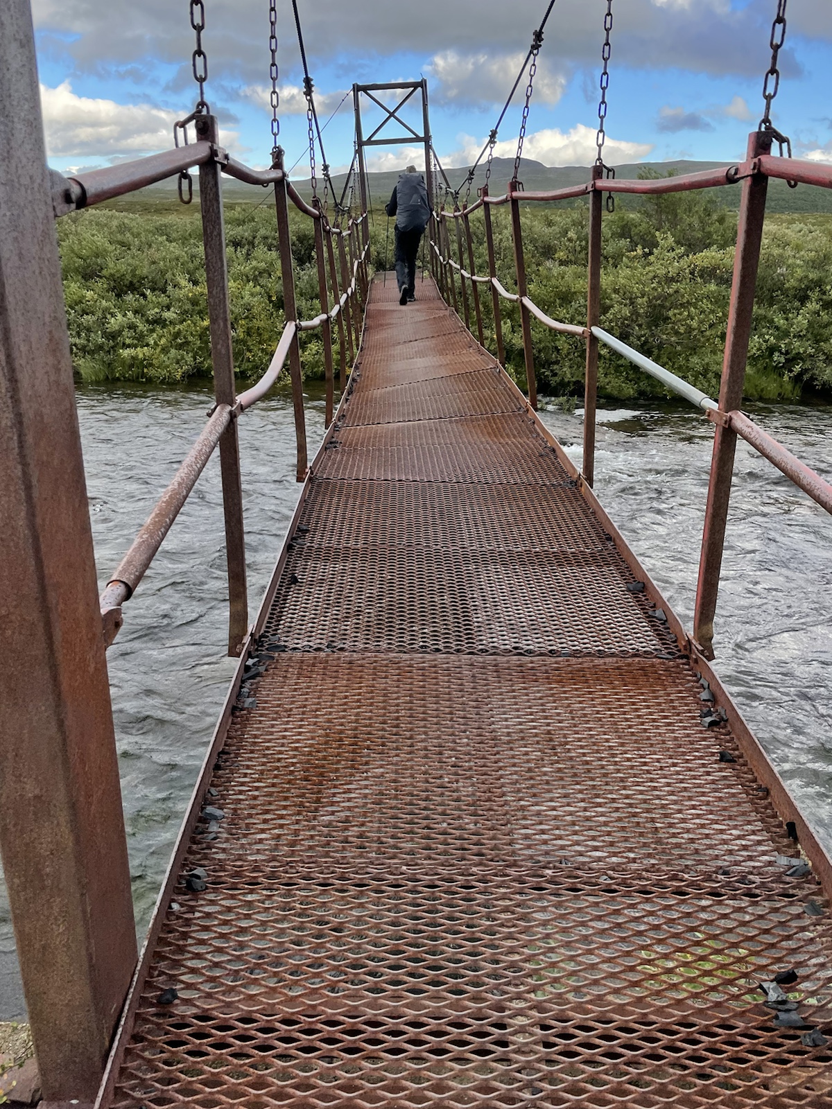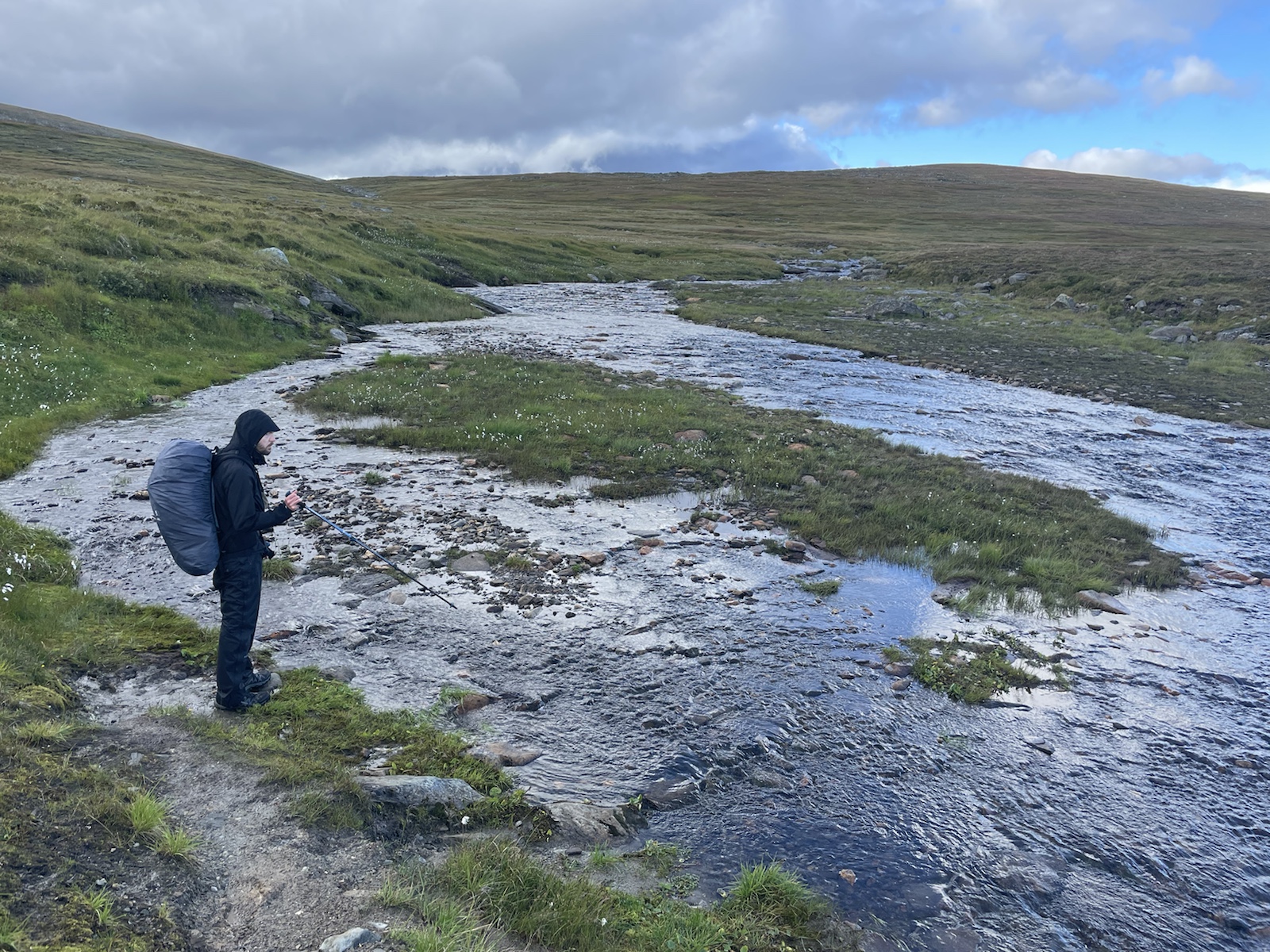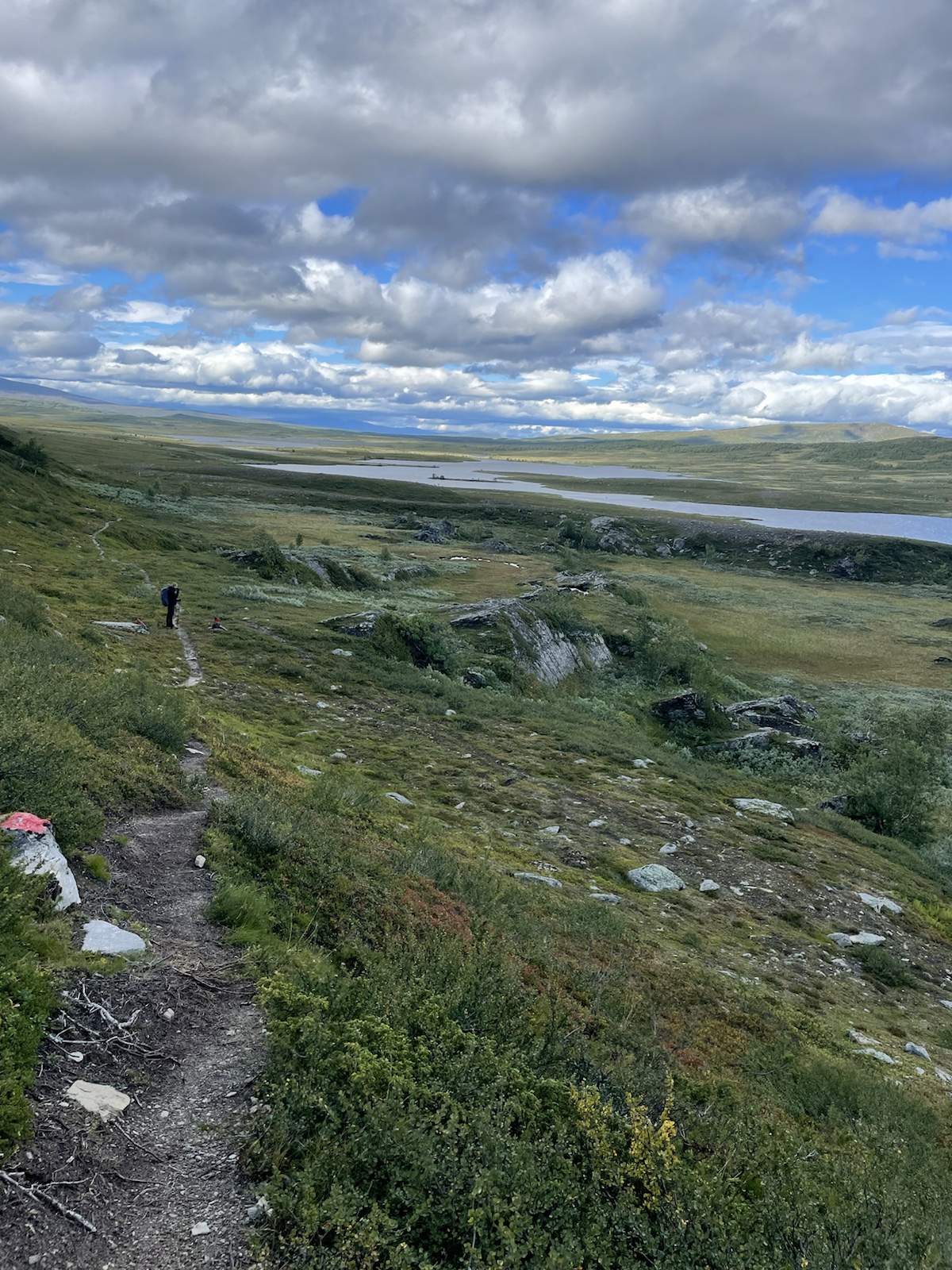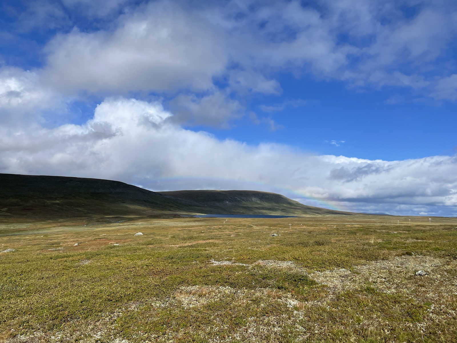 Nach dem Aufstieg erreichten wir ein Hochplateau. Es hatte erneut Rentiere, aber weil wir des öfteren bereits welche gesehen hatten, wodurch es weniger sketskulär war, haben wir nicht einmal mehr Fotos gemacht (selbiges gilt für die Regenbögen. Mehr dazu später). Auf drm Hochplateau herrschte starker Wind. Zum Glück wehte dieser in unsere Richtung. Jedoch war er kalt uny ziemlich unsngenehm. Das Mittagessen nahmen wir stehend und schnell zu uns, da wir sonst zu kalt gehabt hätten. In der Ferne erntdeckte ich dann eine Hütte, von welcher ich glaubte, es sei eine STF Notfallhütte. Aufgrund des zunehmend starken Windes, wollte ich in diese gehen, um eine kurze Windpause zu habrn und einen wärmenden Kaffee zu machen. Döös war (zu Recht) davon überzeugt, dass es sich dabei um eine private Hütte handle, zumal bisher alle Hütten mit Wegweisern gut ausgeschildert gewesen seien und Trampelpfade gehabt hätten. Ich glaubte weiter daran also stampften wir durch das hügelige hochmoor und gingen, an diesen so schon langen Tag, 1 km vergebrns (sorry Döös).