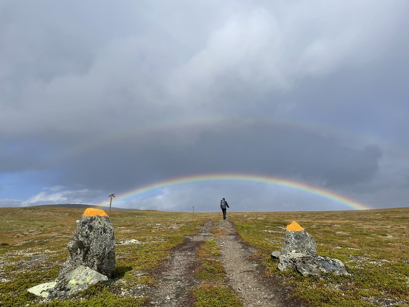 An diesem Tag sahen wir wetterbedingt ca 7 Regenbögen, wobei dieser der mit Abstand am beeindruckendste war. Wie auch bei den Rentieren fotografierten wir die ersten 3 mit begeisterung und die letzen nahem wir nur noch zur Kenntnis. Dies könnte jedoch auch an der Erschöpfung liegen, da der zunehmende ab uns zehrte. Die orangen Steine sind die Wegmarkierungen des Sommerkungsleden. Links auf dem Bild die Holzpfosten markieren den Winterkungsleden (der teilweise einen anderen Steckenverlauf hat und auch bei Schnee sichtbar sein muss, obwohl die Holzpfosten auf den Fotos etwas unästhetisch sind und den Eindruck von Zivilisation vermitteln – wobei Letztere nicht vorhanden war).