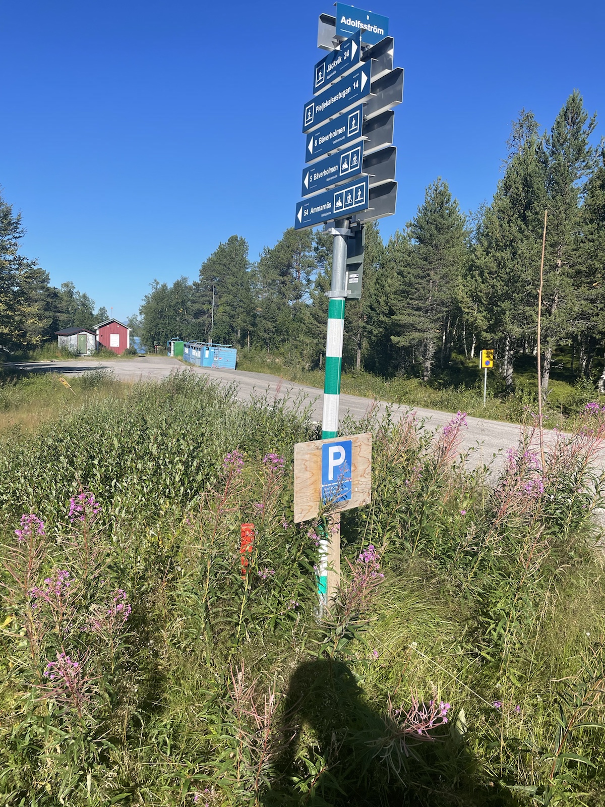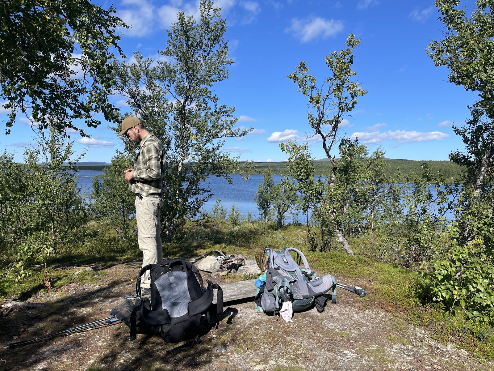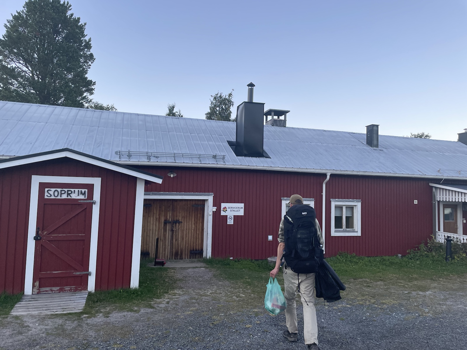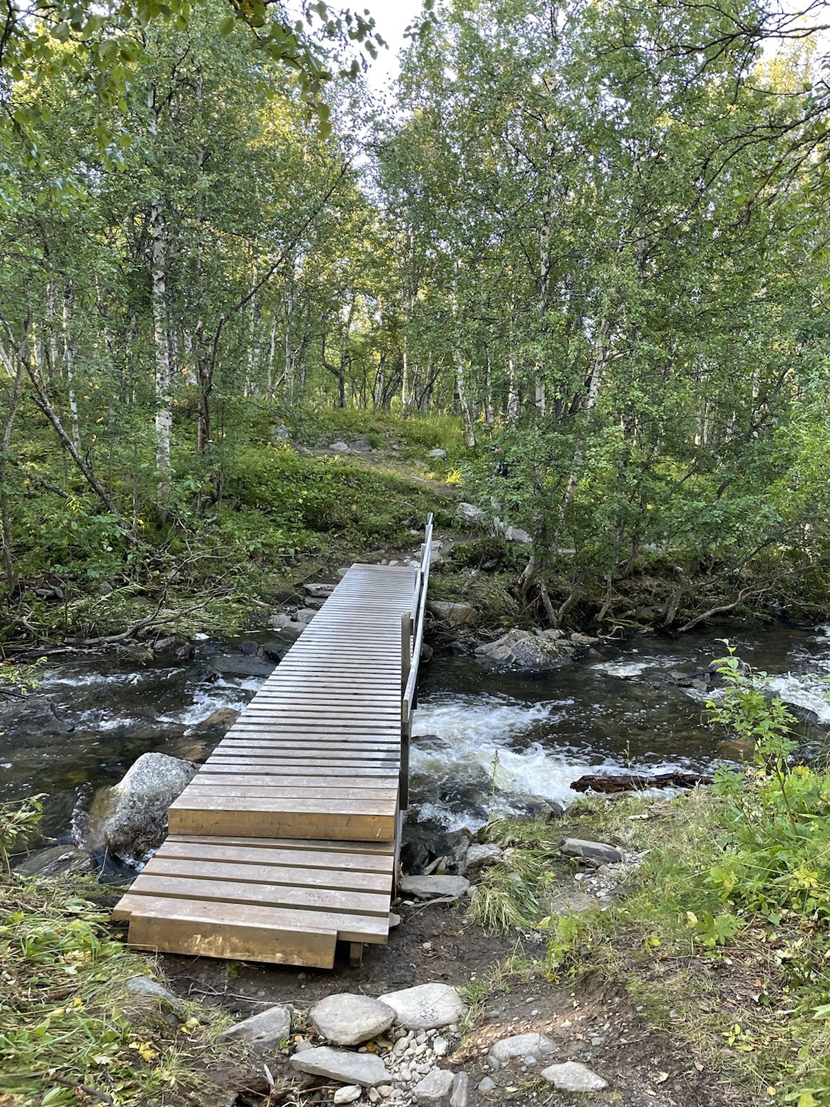 Die Wanderung hatte perfektes Wetter. Alles war toll. Nur noch wenig Schlamm. Nur leicht feuchte Wanderschuhe. Eigentlich alles gut, eigentlich. Ich hatte unglaublich schlechte Laune und war einfach erschöpft. Die Wanderung kam mir endlos vor. Meine Motivation war abwesend. Döös hatte die Theorie, das wir bisher jeden Tag wiedrige Umstände gehabt hätten, was uns immer vom Gewicht des Rucksacks, unseren Müden Gliedern und sonstigen Unanehmlichkeiten abgelenkt hätten. Ich glaube, er hatte teilweise Recht. Denke aber, dass ich einfach erschöpft war, ich freute mich einfach nur noch auf die Waschmaschine (???), welche es den Bernerinner zufolge in der Unterkunft in Jäckvik geben soll und auf die Sauna. Um ca 16.00 Uhr hatte ich kurz Empfang und sah auf google Maps, dass der Super akt nur bis 19.00 Uhr offen hatte. Von da an stressten wir, um anzukommen, bevor dieser schliesst. Schliesslich kamen wir bei der Brücke an, welche wieder stand. Jedoch sahen wir am Ufer, dass das Wasser sehr viel höher gewesen war.Ich weiss nicht, wie gut man es erkennt, aber das Gras rechts ist plattgedrückt. Links ist ein Flusslauf zu erkennen und der Birkenstamm, war wohl eine Hilfe, um die Stelle zu überqueren. Der ganze Abstieg schien vom Wasser abgetragn worden zu sein und war relativ steil. Als wir in Jäckvik ankamen, gingen wir direkt an der Unterkunft vorbei in den Supermarkt. Ich war absolut überfordert und fühlte mich fehl ab Platz. Der Laden in Ammarnäs war wie ein Volg, mit viel Werkezug. Dieser Laden war wie ein grosser Coop. Die Auswahl überforderte uns. Ich liebe die Oatly Auswahl. Sie haben sogar Joghurt, welches wirklich gut ist.Bei der Unterkunft angekommen, warteten wir zunächst beim Eingang, weil niemand in der Rezeption war. Es stamd zwar, man könne anrufen, aber weil Telefonieren im Ausland teuer ist, wollten wir abwarten. Wir trafen dort auf einen der beiden Franzosen, der überrascht war, dass wir schon hier sind, weil er uns am Vortag nicht in Adolfström angetroffen hatten. Er erzählte, dass er nicht wie wir einen Pausentag einlegen, sondern direkt weiterwandern werde, da er bereits die Bootsfahrt für den nächsten Tag reserviert habe. So lernten wir, dass auch wir dem Bootsführer bescheid geben müssen, damit dieser uns 18km von Jäckvik entfehrnt über den See fahren wird.