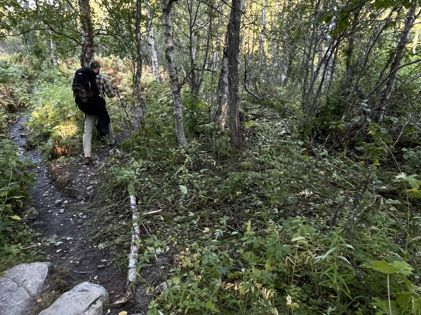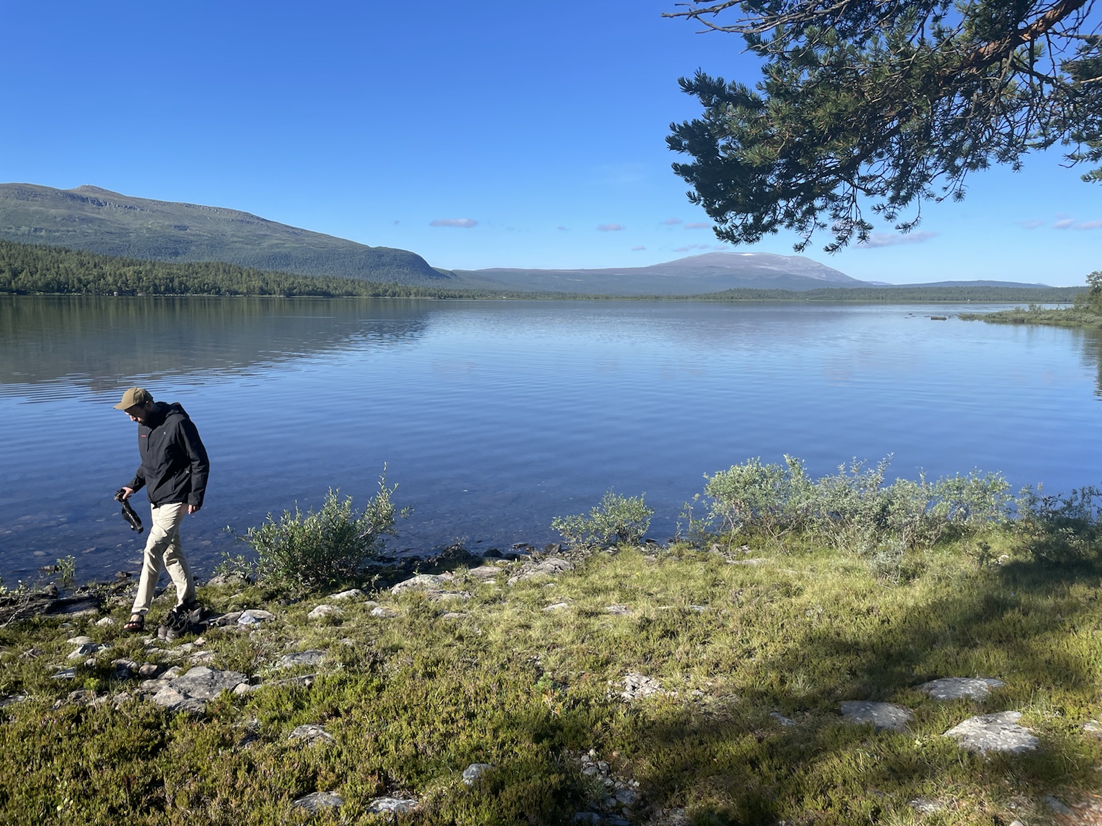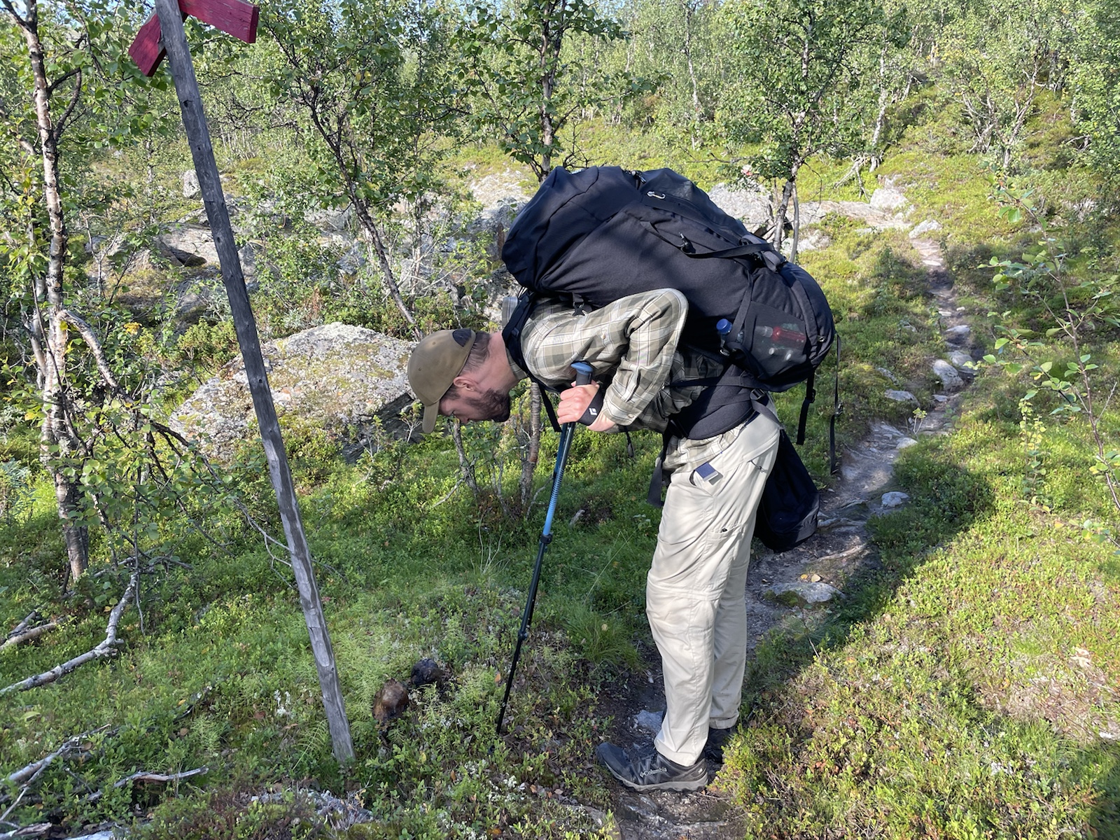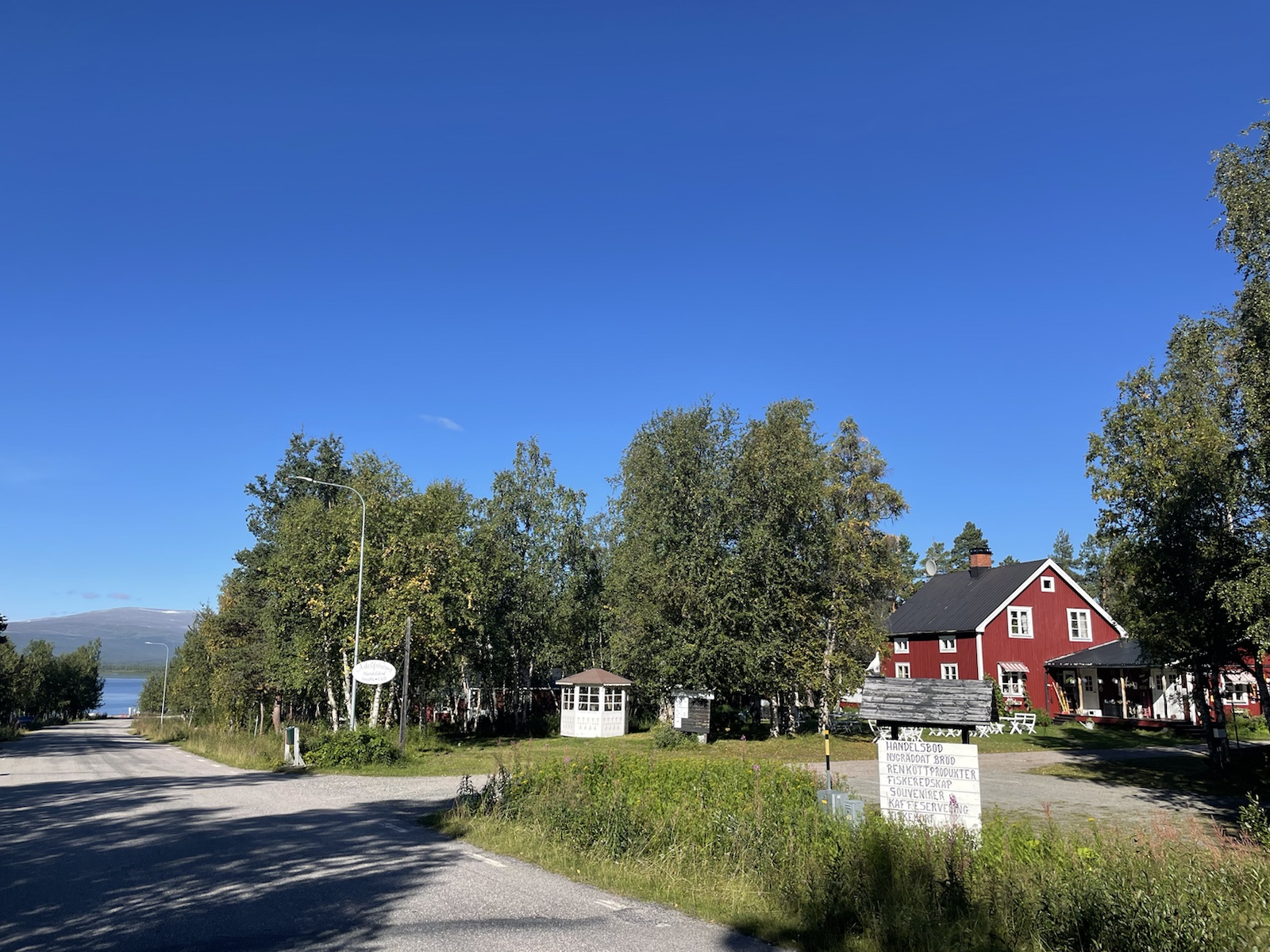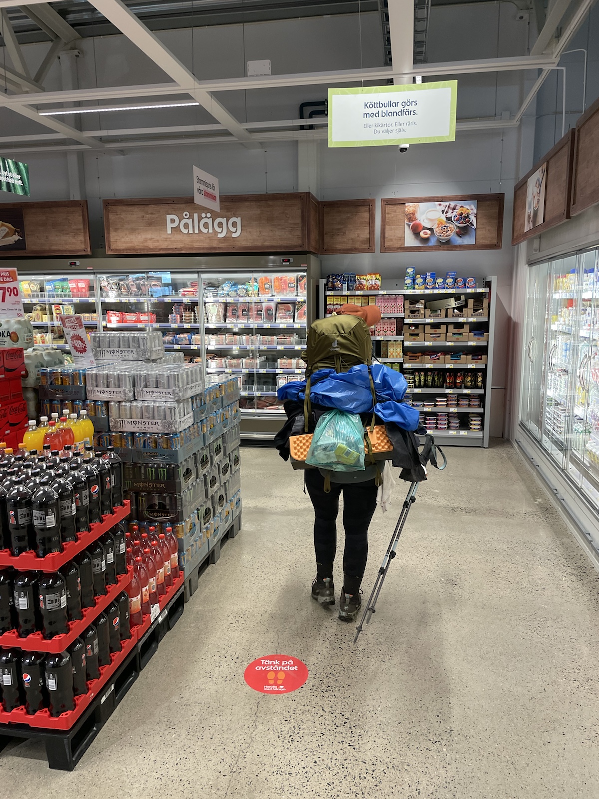 Die Wanderung hatte perfektes Wetter. Alles war toll. Nur noch wenig Schlamm. Nur leicht feuchte Wanderschuhe. Eigentlich alles gut, eigentlich. Ich hatte unglaublich schlechte Laune und war einfach erschöpft. Die Wanderung kam mir endlos vor. Meine Motivation war abwesend. Döös hatte die Theorie, das wir bisher jeden Tag wiedrige Umstände gehabt hätten, was uns immer vom Gewicht des Rucksacks, unseren Müden Gliedern und sonstigen Unanehmlichkeiten abgelenkt hätten. Ich glaube, er hatte teilweise Recht. Denke aber, dass ich einfach erschöpft war, ich freute mich einfach nur noch auf die Waschmaschine (???), welche es den Bernerinner zufolge in der Unterkunft in Jäckvik geben soll und auf die Sauna. Um ca 16.00 Uhr hatte ich kurz Empfang und sah auf google Maps, dass der Super akt nur bis 19.00 Uhr offen hatte. Von da an stressten wir, um anzukommen, bevor dieser schliesst. Schliesslich kamen wir bei der Brücke an, welche wieder stand. Jedoch sahen wir am Ufer, dass das Wasser sehr viel höher gewesen war.Ich weiss nicht, wie gut man es erkennt, aber das Gras rechts ist plattgedrückt. Links ist ein Flusslauf zu erkennen und der Birkenstamm, war wohl eine Hilfe, um die Stelle zu überqueren. Der ganze Abstieg schien vom Wasser abgetragn worden zu sein und war relativ steil. Als wir in Jäckvik ankamen, gingen wir direkt an der Unterkunft vorbei in den Supermarkt. Ich war absolut überfordert und fühlte mich fehl ab Platz. Der Laden in Ammarnäs war wie ein Volg, mit viel Werkezug. Dieser Laden war wie ein grosser Coop. Die Auswahl überforderte uns. Ich liebe die Oatly Auswahl. Sie haben sogar Joghurt, welches wirklich gut ist.Bei der Unterkunft angekommen, warteten wir zunächst beim Eingang, weil niemand in der Rezeption war. Es stamd zwar, man könne anrufen, aber weil Telefonieren im Ausland teuer ist, wollten wir abwarten. Wir trafen dort auf einen der beiden Franzosen, der überrascht war, dass wir schon hier sind, weil er uns am Vortag nicht in Adolfström angetroffen hatten. Er erzählte, dass er nicht wie wir einen Pausentag einlegen, sondern direkt weiterwandern werde, da er bereits die Bootsfahrt für den nächsten Tag reserviert habe. So lernten wir, dass auch wir dem Bootsführer bescheid geben müssen, damit dieser uns 18km von Jäckvik entfehrnt über den See fahren wird.