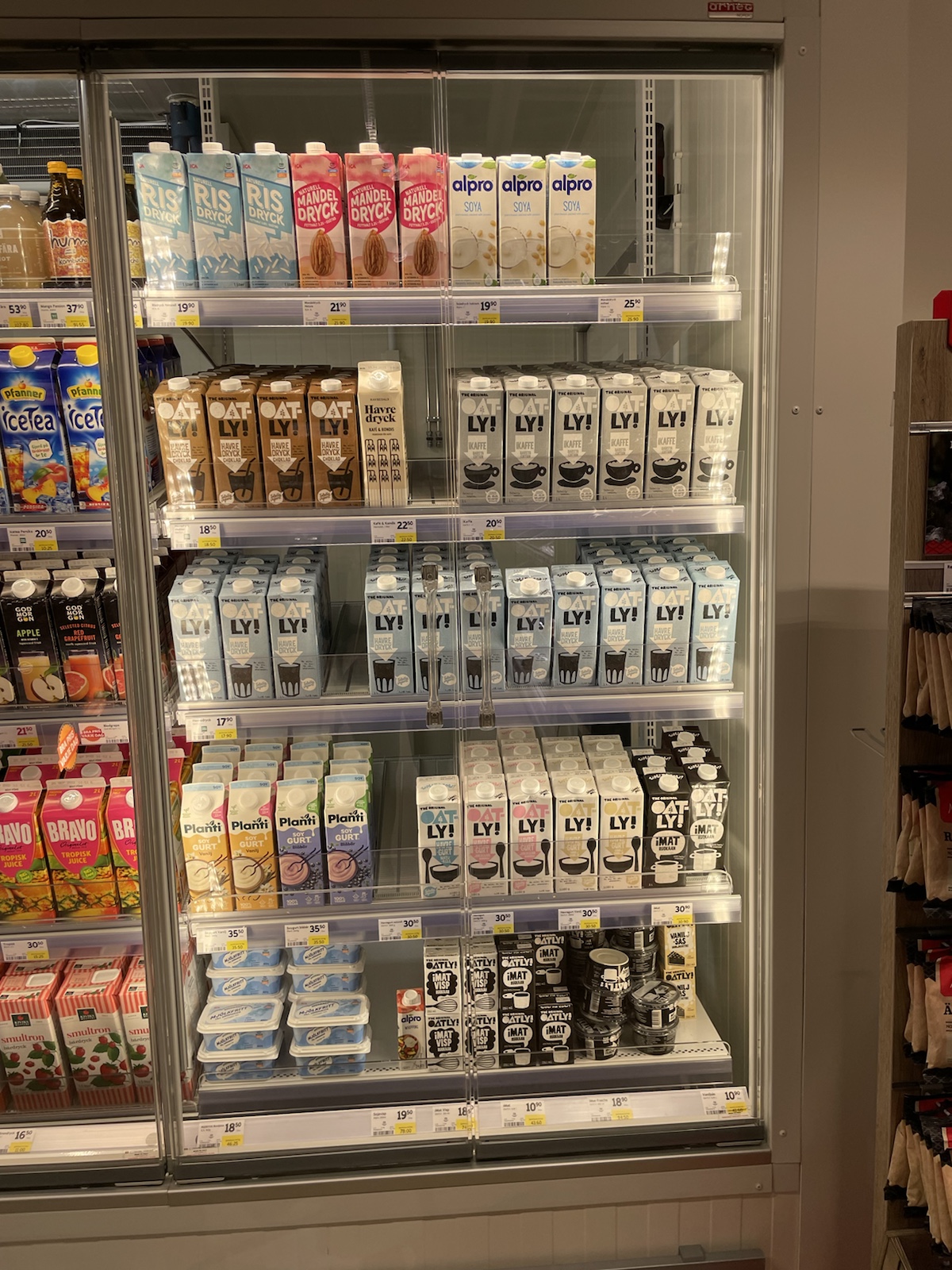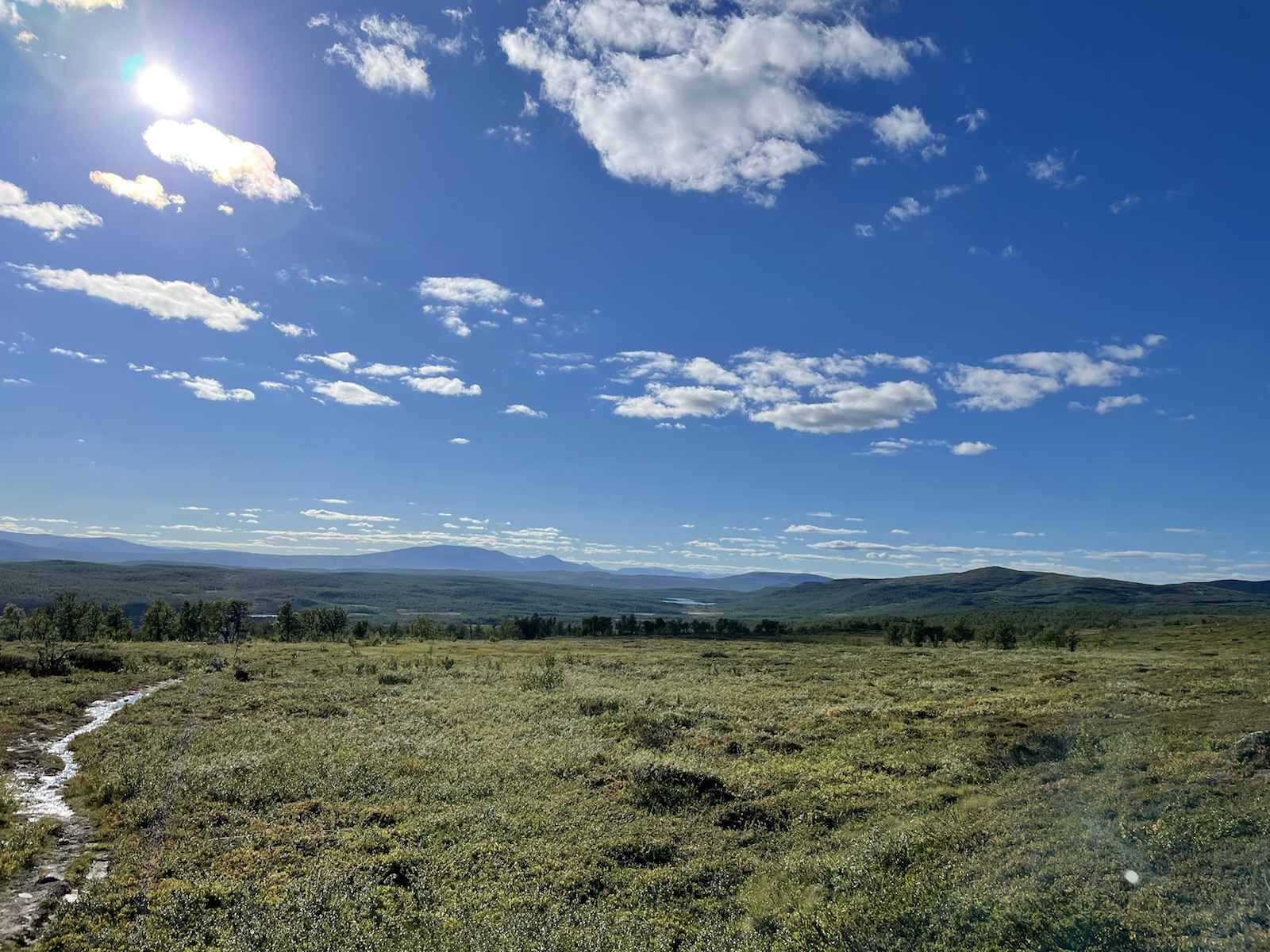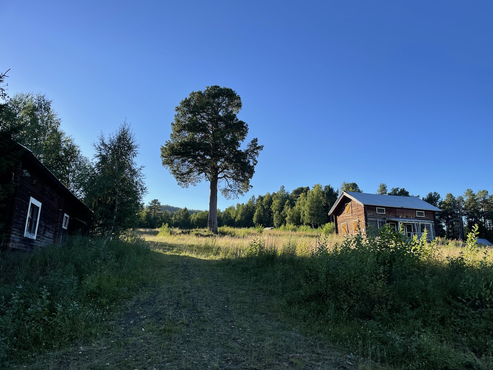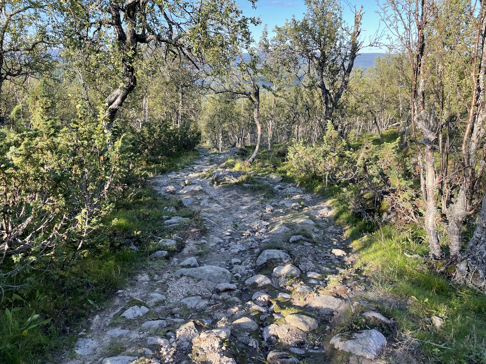 Die Wanderung hatte perfektes Wetter. Alles war toll. Nur noch wenig Schlamm. Nur leicht feuchte Wanderschuhe. Eigentlich alles gut, eigentlich. Ich hatte unglaublich schlechte Laune und war einfach erschöpft. Die Wanderung kam mir endlos vor. Meine Motivation war abwesend. Döös hatte die Theorie, das wir bisher jeden Tag wiedrige Umstände gehabt hätten, was uns immer vom Gewicht des Rucksacks, unseren Müden Gliedern und sonstigen Unanehmlichkeiten abgelenkt hätten. Ich glaube, er hatte teilweise Recht. Denke aber, dass ich einfach erschöpft war, ich freute mich einfach nur noch auf die Waschmaschine (???), welche es den Bernerinner zufolge in der Unterkunft in Jäckvik geben soll und auf die Sauna. Um ca 16.00 Uhr hatte ich kurz Empfang und sah auf google Maps, dass der Super akt nur bis 19.00 Uhr offen hatte. Von da an stressten wir, um anzukommen, bevor dieser schliesst. Schliesslich kamen wir bei der Brücke an, welche wieder stand. Jedoch sahen wir am Ufer, dass das Wasser sehr viel höher gewesen war.Ich weiss nicht, wie gut man es erkennt, aber das Gras rechts ist plattgedrückt. Links ist ein Flusslauf zu erkennen und der Birkenstamm, war wohl eine Hilfe, um die Stelle zu überqueren. Der ganze Abstieg schien vom Wasser abgetragn worden zu sein und war relativ steil. Als wir in Jäckvik ankamen, gingen wir direkt an der Unterkunft vorbei in den Supermarkt. Ich war absolut überfordert und fühlte mich fehl ab Platz. Der Laden in Ammarnäs war wie ein Volg, mit viel Werkezug. Dieser Laden war wie ein grosser Coop. Die Auswahl überforderte uns. Ich liebe die Oatly Auswahl. Sie haben sogar Joghurt, welches wirklich gut ist.Bei der Unterkunft angekommen, warteten wir zunächst beim Eingang, weil niemand in der Rezeption war. Es stamd zwar, man könne anrufen, aber weil Telefonieren im Ausland teuer ist, wollten wir abwarten. Wir trafen dort auf einen der beiden Franzosen, der überrascht war, dass wir schon hier sind, weil er uns am Vortag nicht in Adolfström angetroffen hatten. Er erzählte, dass er nicht wie wir einen Pausentag einlegen, sondern direkt weiterwandern werde, da er bereits die Bootsfahrt für den nächsten Tag reserviert habe. So lernten wir, dass auch wir dem Bootsführer bescheid geben müssen, damit dieser uns 18km von Jäckvik entfehrnt über den See fahren wird.