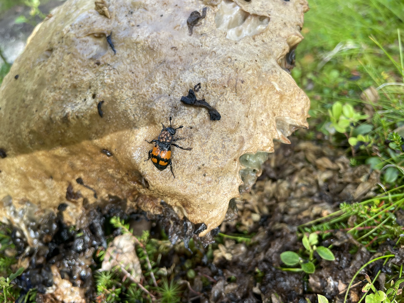 Okay falsch gedacht, wir haben recherchiert. Anscheinend leben die Milben mit dem Totengräber in Symbiose und unterstützen die Totengräber bei der Konkurrenz mit Schmeissfliegen. Die Natur. Crazy.