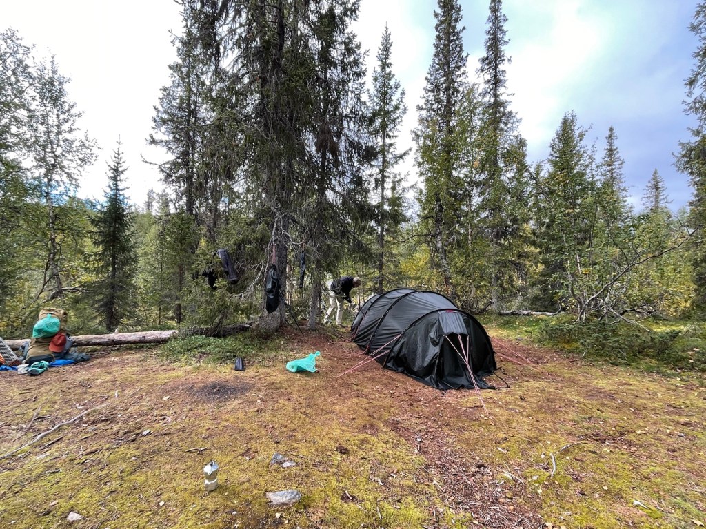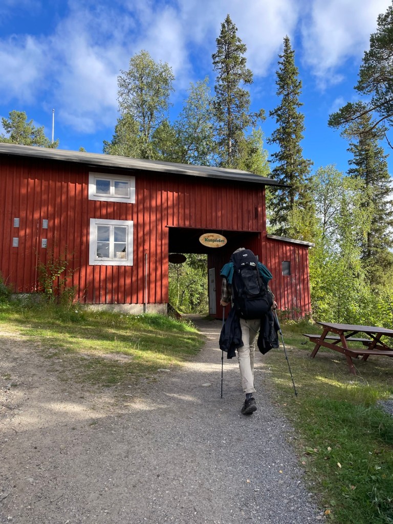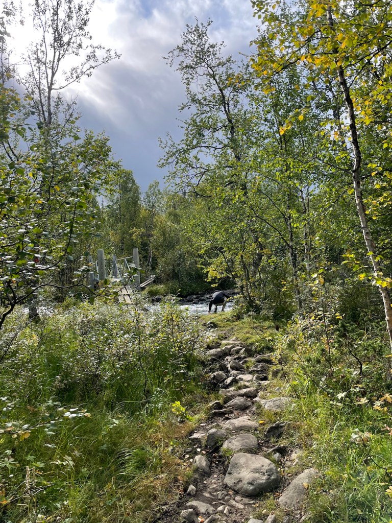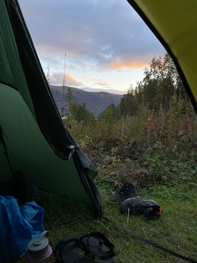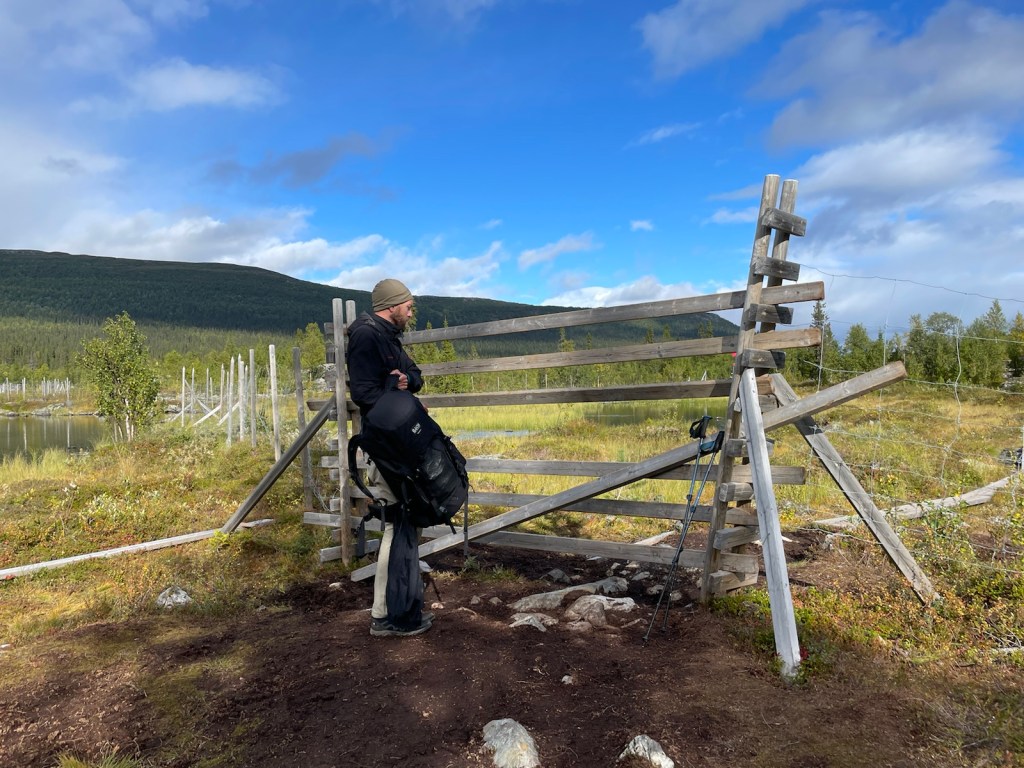 Ein letztes Mal die Nichtwandernahrung geniessen. Frühstück in Kvikkjock.Wir haben draussen eine Gepäckwaage entdeckt. Nur begann diese bei 64 kg.Demzufolge war Chrigis (Döös) Rucksack ca. 17 kg schwer (meiner ca. 14 kg). 4.1 kg von Chrigis Rucksack ist das Zelt. Eine Frau ging im Moment des Wägens an uns vorbei und starrte auf die Gewichtsanzeige. Etwas später kam sie zurück und erkundigte sich bei Chrigi, wie schwer denn sein Rucksack sei, sie habe 80 kg gelesen und könne es kaum glauben.Der Beginn der 4. Etappe war etwas harzig. Nach der Einsamkeit der 3. Etappe, bei der man am Tag maximal sechs Leute antraf, waren es hier alle 10 Minuten gefühlt sechs Leute. Es fühlte sich an, wie die 5-Seen-Wanderung (iykyk). Wir waren beide mässig begeister und genossen den ersten Tag kaum. Einmal kam mir ein lauthals telefonierende Niederländer entgegen. Ich konnte es kaum glauben, dass der hier mitten in der Natur telefonierend durch den Wald stampft. Werde ich etwa zu einer Puristin? Das Mittagessen war dafür ein Highlight. Chips, Knäckebrot und heisse (und kalte) Schokolade. Dieses nahmen wir an einem See ein, an dessen gegenüberliegendem Ende man den Sarek sehen könnte. Aufgrund der tiefliegenden Wolken leider nicht sichtbar.Wasser schöpfen. An diesem Tag habe ich erstaunlich wenig Fotos gemacht.Ein okayer Zeltplatz mit einer kühlen Nacht. Hier bereits der nächste Morgen. 2. Tag der vierten Etappe und wir hofften (vergebens) auf weniger Menschen.Durch Rentiergehege..… und Flüsse.Gefolgt von einem schnurgeraden steilen Aufstieg. Bitter erinnere ich mich an die wunderbaren Schweizer zig-zag Wanderwegsaufstiege.Dafür wurden wir mit einer schönen Aussicht belohnt. Beim Abstieg entschied ich mich dann spontan dazu: a) eine spontane Pause zu machen b) über etwas unbekanntes zu stolpern, mit dem Kopf fast auf einen Stein aufzuschlagen und einen „purzelbaum“ zu machen c) wir wissen alle, es ist b.