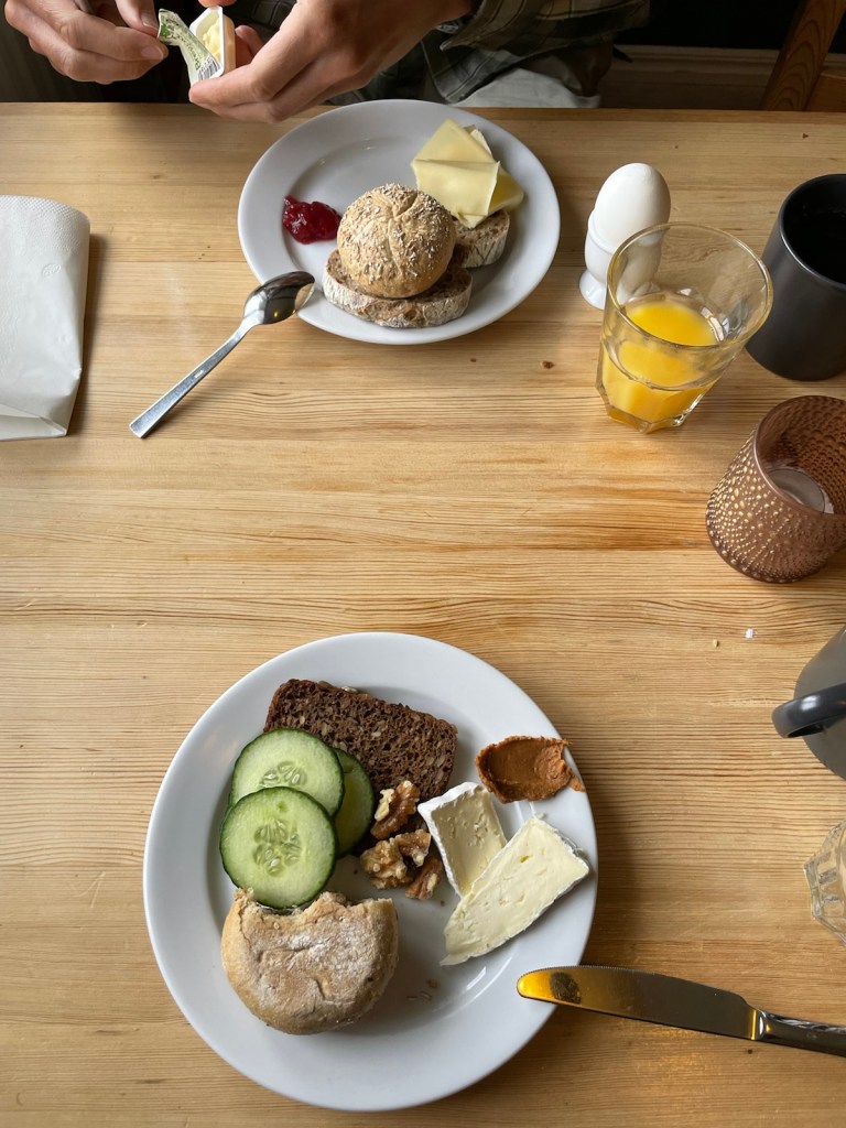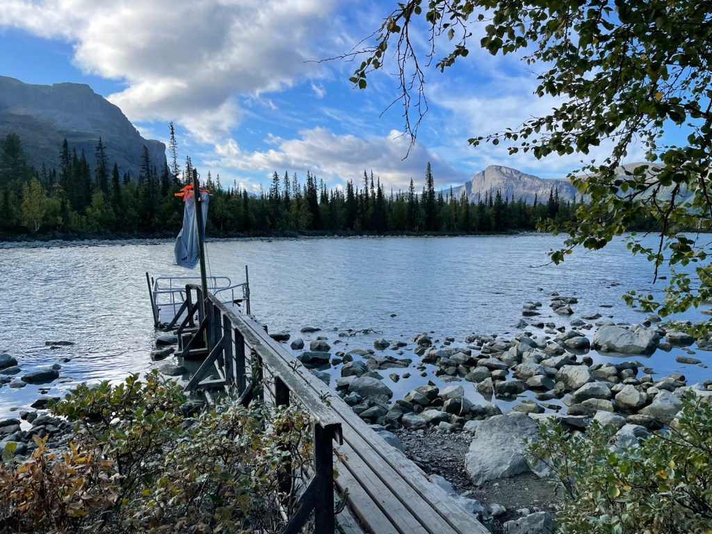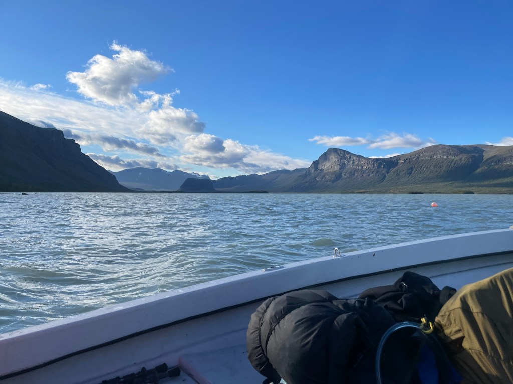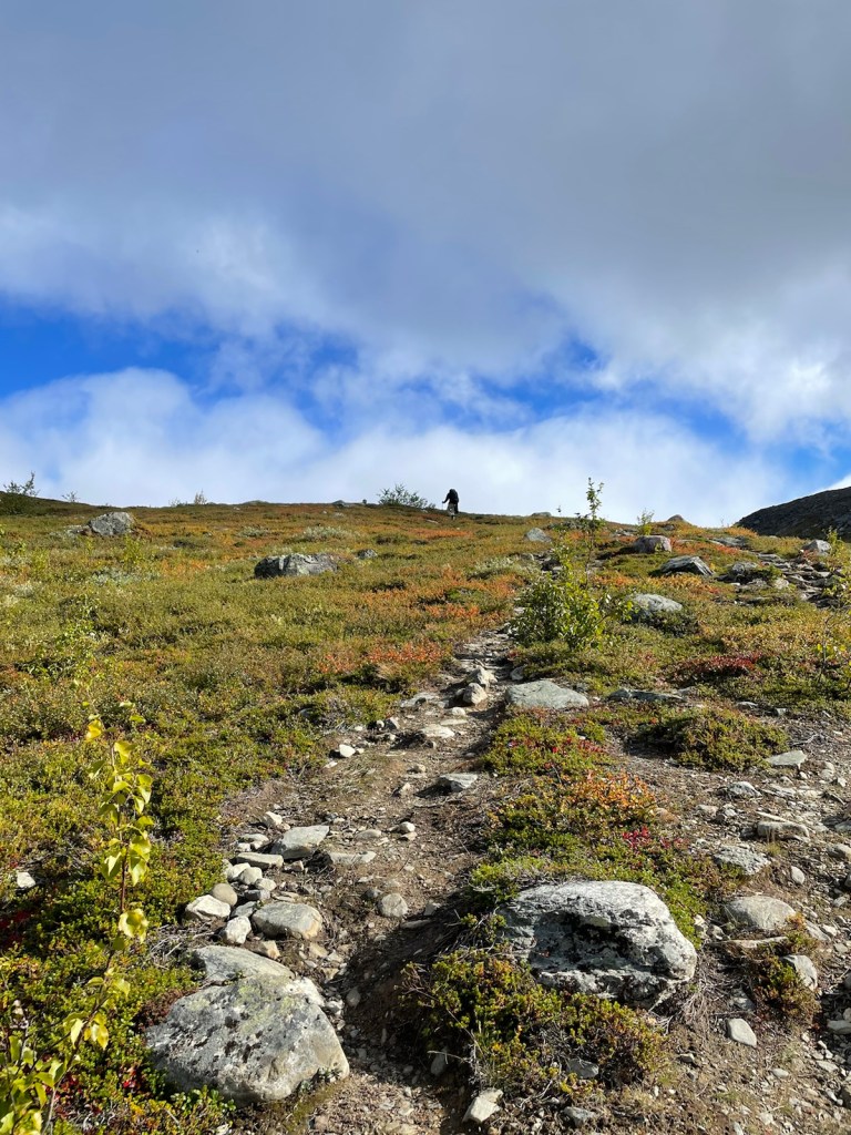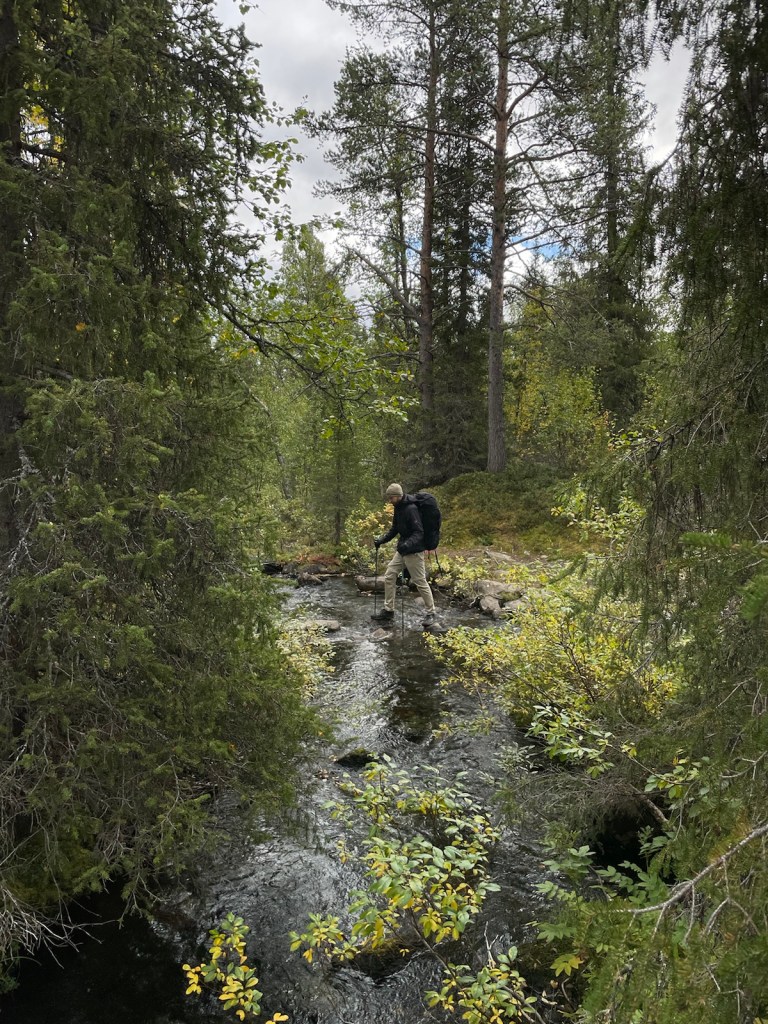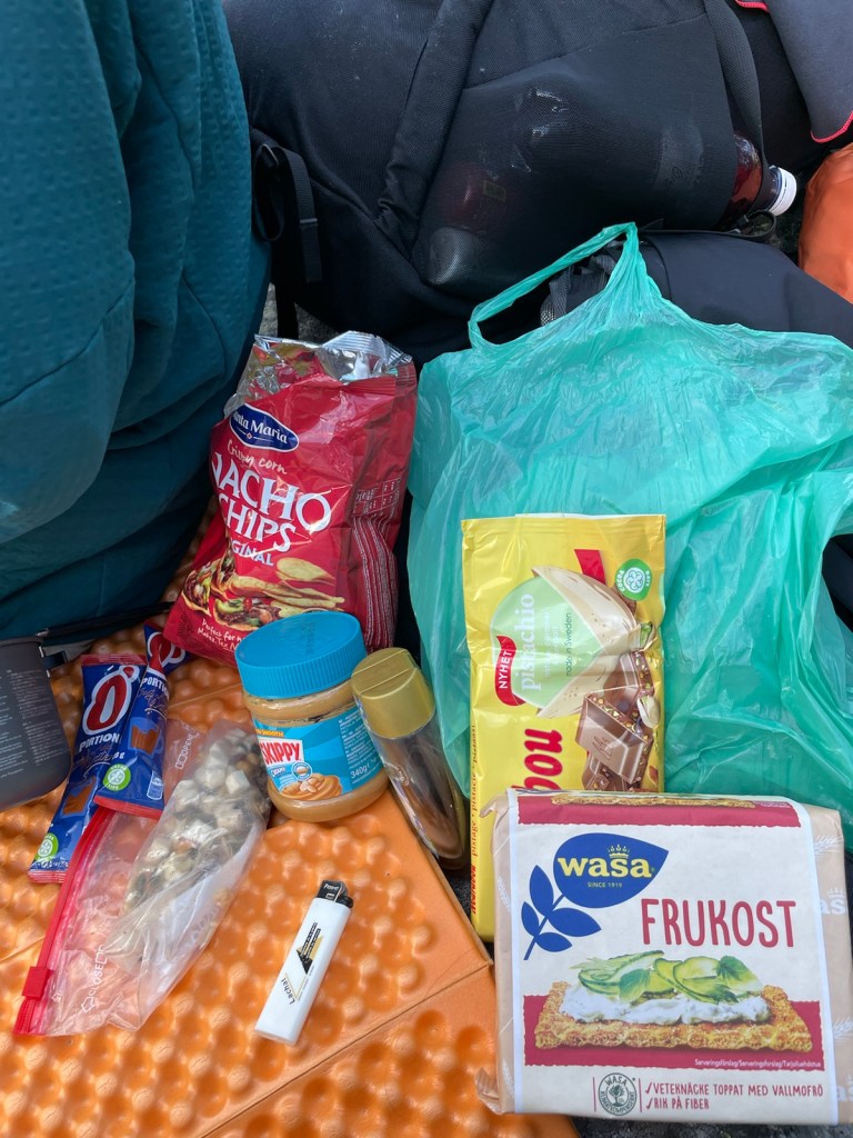 Ein letztes Mal die Nichtwandernahrung geniessen. Frühstück in Kvikkjock.Wir haben draussen eine Gepäckwaage entdeckt. Nur begann diese bei 64 kg.Demzufolge war Chrigis (Döös) Rucksack ca. 17 kg schwer (meiner ca. 14 kg). 4.1 kg von Chrigis Rucksack ist das Zelt. Eine Frau ging im Moment des Wägens an uns vorbei und starrte auf die Gewichtsanzeige. Etwas später kam sie zurück und erkundigte sich bei Chrigi, wie schwer denn sein Rucksack sei, sie habe 80 kg gelesen und könne es kaum glauben.Der Beginn der 4. Etappe war etwas harzig. Nach der Einsamkeit der 3. Etappe, bei der man am Tag maximal sechs Leute antraf, waren es hier alle 10 Minuten gefühlt sechs Leute. Es fühlte sich an, wie die 5-Seen-Wanderung (iykyk). Wir waren beide mässig begeister und genossen den ersten Tag kaum. Einmal kam mir ein lauthals telefonierende Niederländer entgegen. Ich konnte es kaum glauben, dass der hier mitten in der Natur telefonierend durch den Wald stampft. Werde ich etwa zu einer Puristin? Das Mittagessen war dafür ein Highlight. Chips, Knäckebrot und heisse (und kalte) Schokolade. Dieses nahmen wir an einem See ein, an dessen gegenüberliegendem Ende man den Sarek sehen könnte. Aufgrund der tiefliegenden Wolken leider nicht sichtbar.Wasser schöpfen. An diesem Tag habe ich erstaunlich wenig Fotos gemacht.Ein okayer Zeltplatz mit einer kühlen Nacht. Hier bereits der nächste Morgen. 2. Tag der vierten Etappe und wir hofften (vergebens) auf weniger Menschen.Durch Rentiergehege..… und Flüsse.Gefolgt von einem schnurgeraden steilen Aufstieg. Bitter erinnere ich mich an die wunderbaren Schweizer zig-zag Wanderwegsaufstiege.Dafür wurden wir mit einer schönen Aussicht belohnt. Beim Abstieg entschied ich mich dann spontan dazu: a) eine spontane Pause zu machen b) über etwas unbekanntes zu stolpern, mit dem Kopf fast auf einen Stein aufzuschlagen und einen „purzelbaum“ zu machen c) wir wissen alle, es ist b.