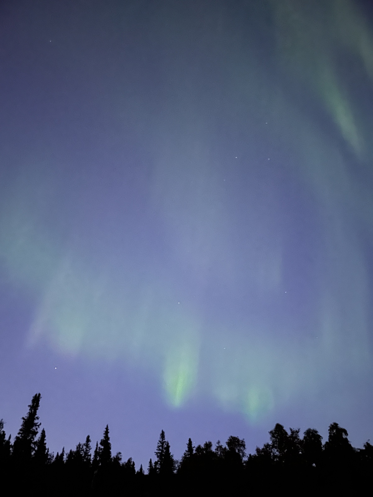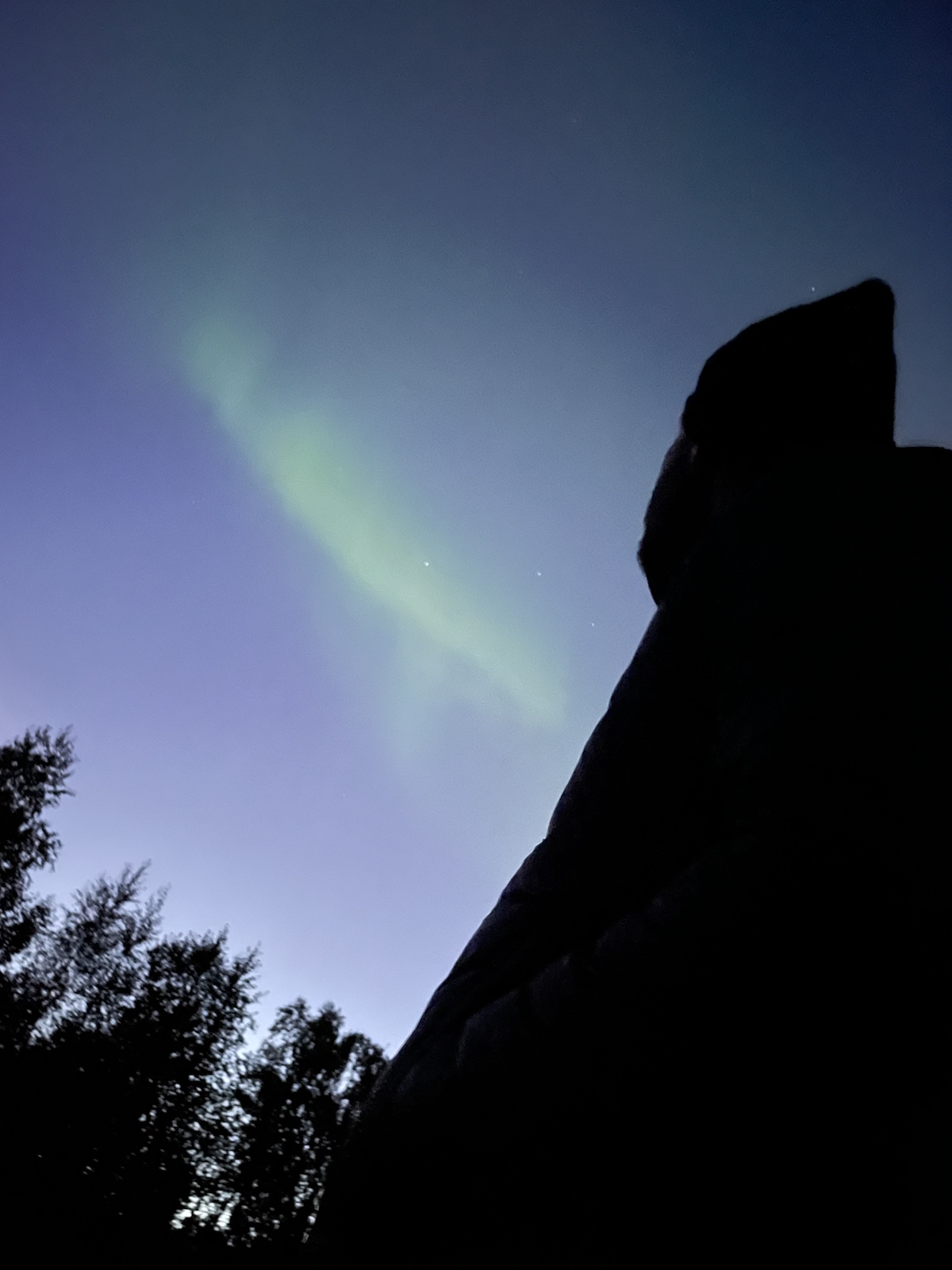 Ich hatte gehofft, wir würden sie mitte September ganz im Norden sehen. Jetzt sahen wir sie bereits Anfang September. Was für ein Geschenk.Weder Chrigi noch ich hatten in den Hinmel geschaut. Jedoch hatte er auf dem Weg zurpcknins Zelt zwei Schwedinnen überhört, die etwas in der Art von „Aurora jo“ gesagt hätten, weshalb er hoch geschaut habe. Es folgte eine sehr kalte Nacht.