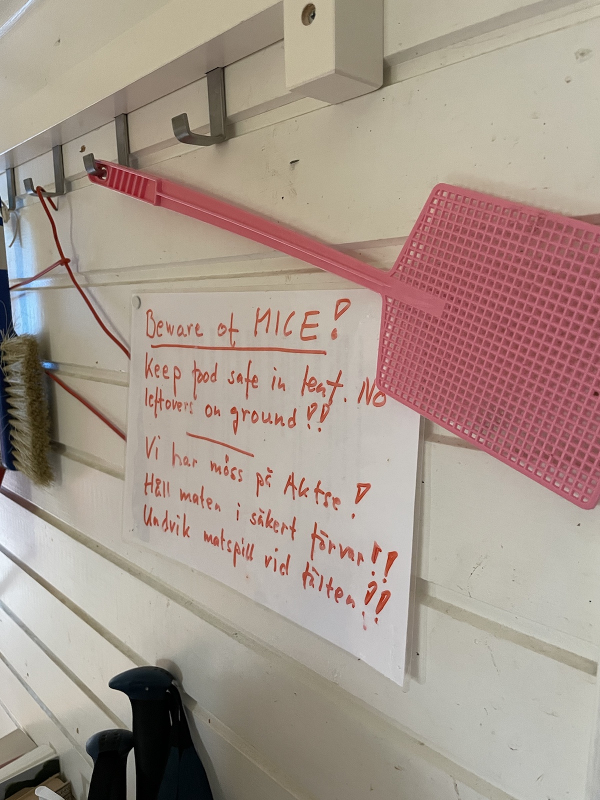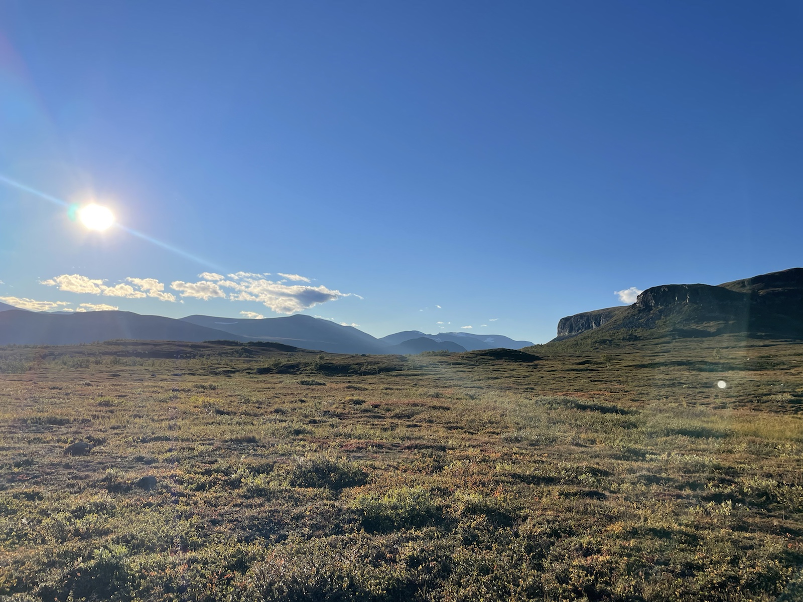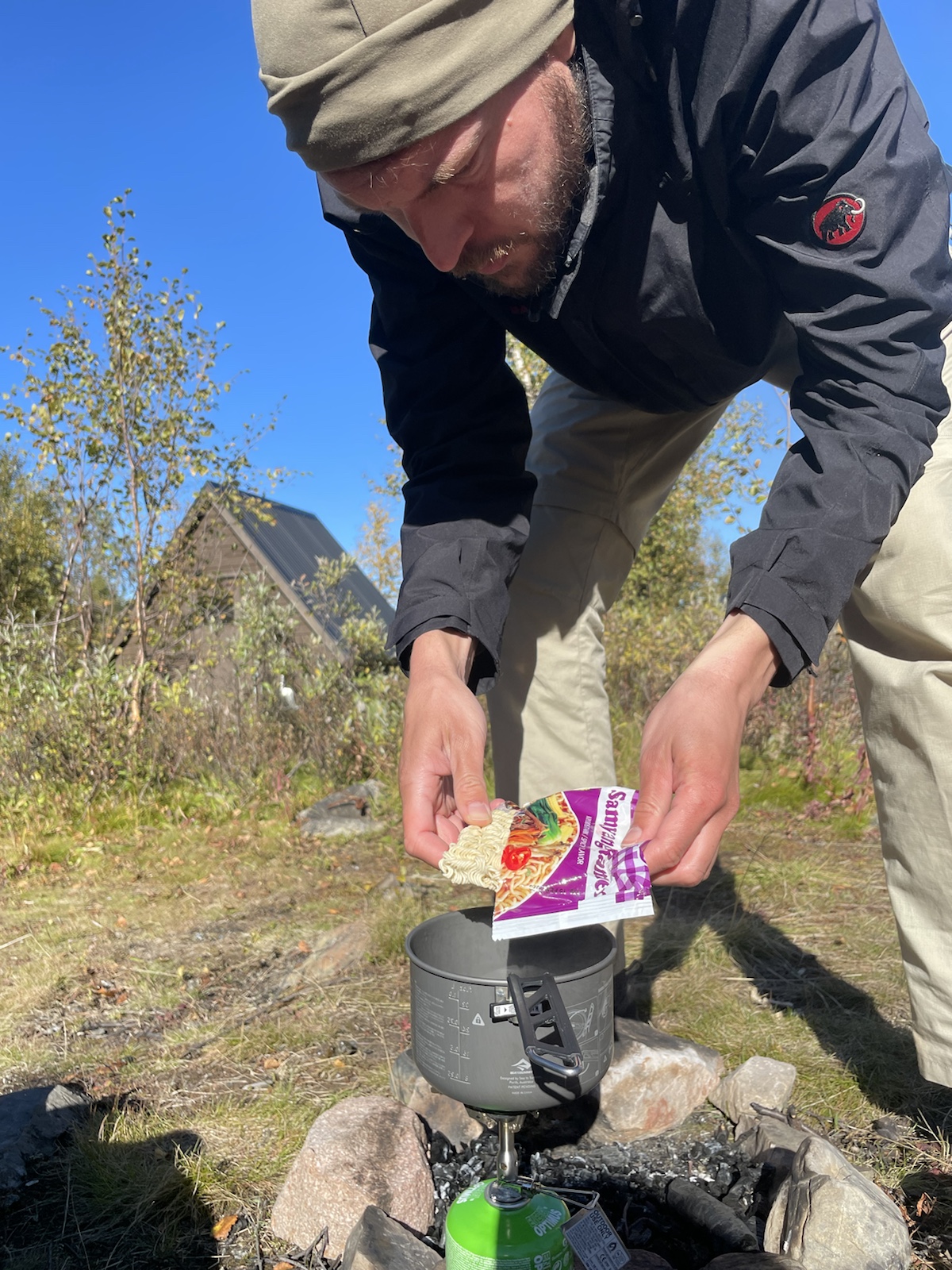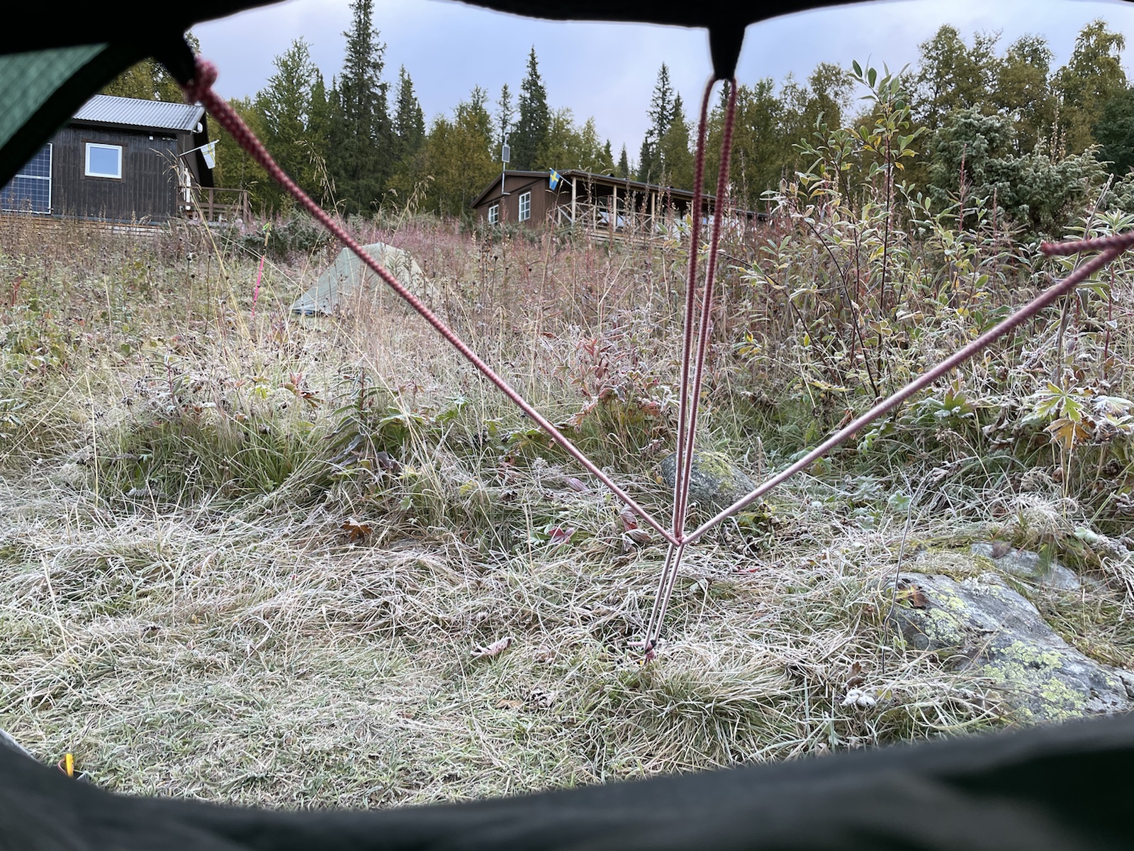 Nach einer eisigen Nacht folgte Raureif. Es war nicht der erste (das was drei Tage früher bereits der Fall).Um 8.00 Uhr war es 0.5 Grad Celsius. Leider schien die Sonne nicht. Es war bewölkt und es wärmte nicht richtig auf.Nach dem Frühstück sah ich beim Aufräumen im Vorzelt ei e Ziplock-bag mit gesalzenen Erdnüssen. Bevor ich sie in die Essenstasche tun wollte, wollte ich noch eine Handvoll davon essen. Als ich eine Handvoll nahm, zeigte Chrigi sofort auf den Boden und erklärte, ich hätte eine Erdnuss fallen lassen. Ich konnte mich nicht erinnern, eine Nuss fallen gelassen zu haben. Es war aber auch Morgen, also gut möglich. Während ich die Erdnüsse kaute und die Ziplock-bag wieder verschloss, um sie in die Essenstasche zu tun, fiel erneut eine Erdnuss auf den Boden. Dieses mal war der Beutel doch geschlossen. Leicht verwirrt schaute ich die Ziplog-bag genauer an und sah ein Loch unten rechts. Genauer, ein Loch wurde – wohl von einer Maus – herausgeknabbert. Ich spucke die restlichen Erdnüsse aus. Der zweite Mauszwischenfall. Bevor wir weiterwanderten, gingen wir noch schnell in die Gemeinschaftsküche, um uns aufzuwärmen, wo wir den Hinweis auf Mäuse sahen.AWeiter gehts. Ein zweites Mal denselben steilen Waldteil hinauf, den wir am Vortag bereits wegen Skierfe hochgegangen waren. Dieses mal jedoch mit einem schweren Rucksack. Zum Glück heute nur 8.5 km bis zum See, den wir mit einem weiteren Motorboot überqueren müssen.Oben ein weiteres Hochplateau, mit einer Tafel, die einen auffordert, die Bootsführerin anzurufen, da nur Leute mit dem Boot mitgenommen werden könnten, welche sich zuvor telefonisch angemeldet hätten. Chrigi ruft an un erkundigt sich, da erst 11.30 Uhr war und das Boot nach Fahrplan erst um 17.15 fahren würde, ob sie uns bereits früher abholen könnten. Der Mann am Telefon gibt zögerlich an, es sei allenfalls möglich, dass sie um 15.00 Uhr oder um 16.00 Uhr kommen könnte. Dort angekommen – ca. um 12.45 Uhr – legten wir unser Mätteli auf den Boden und hoffteb, das Boot würde um 15.00 Uhr kommen. Neben uns, waren noch zwei junge Deutsche am warten. Sie hatten bereits um 10.00 Uhr angerufen und die Bootsführerin soll erklärt haben, es allenfalls um 11.00 Uhr zu schaffen. Sie seien also unglaublich schnell gegangen und hätten es geschafft, um 11.00 Uhr dort zu sein, jedoch kein Boot. Als Zeitvertrieb entschieden wir, Ramen Noodles zu essen. Immer eine gute Entscheidung. Das Boot kam um 15.00 Uhr nicht, um 16.00 Uhr auch nicht. Erst um 17.15 Uhr.Glücklich darüber, dass es weitergeht.Auf der anderen Seeseite angekommen, entschieden wir, weiterzuwandern. Es war wunderbar sonnig und wir wollten uns unbedingt noch etwas bewegen. Ausserdem wollten wir nicht wieder bei einer STF-Hütte zelten. Unterwegs trafen wir drei Franzosen. Ein älteres Ehepaar und ein junger Franzose, die zufällig zusammen unterwegs waren. Der Jüngere wollte bis nach Hemmavan (unseren Startpunkt) wandern und unterhielt sich mit Chrigi über die Strecke. Das Ehepaar erzählte mir, sie hätten am Vortag mit einem anderen Wanderer einen Fisch gebraten, welcher dieser gefangen hätte. Dazu hätten sie Blaubeerenkompott gemacht. Mir fiel auf, dass Chrigi und ich – obwohl wir ständig von Blaubeeren umgeben sind – fast nie welche gepflückt haben. Irgendwie ist das Bücken mit einem schweren Rucksack einfach zu viel verlangt.Wir wanderten bis wir eine Wasserquelle fanden. Ein kleiner See. Wir entschieden, in der Senke direkt beim See unser Zelt aufzuschlagen. Nachdem wir es aufgebaut hatten, fiel mir ein, einmal gelesen zu haben, dass die kalte Luft in der Nacht absinkt und sich – speziell in Senken – ansammelt. Im Himmel stand die Sonne. Es war amgenehm warm. Was kann schon passieren.