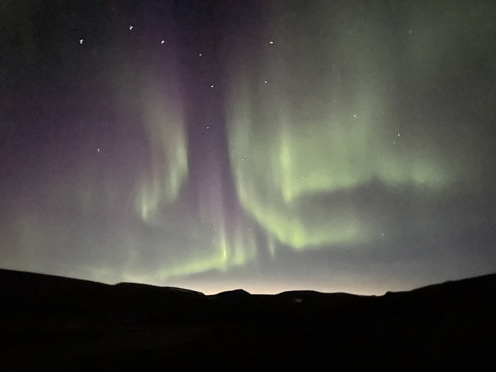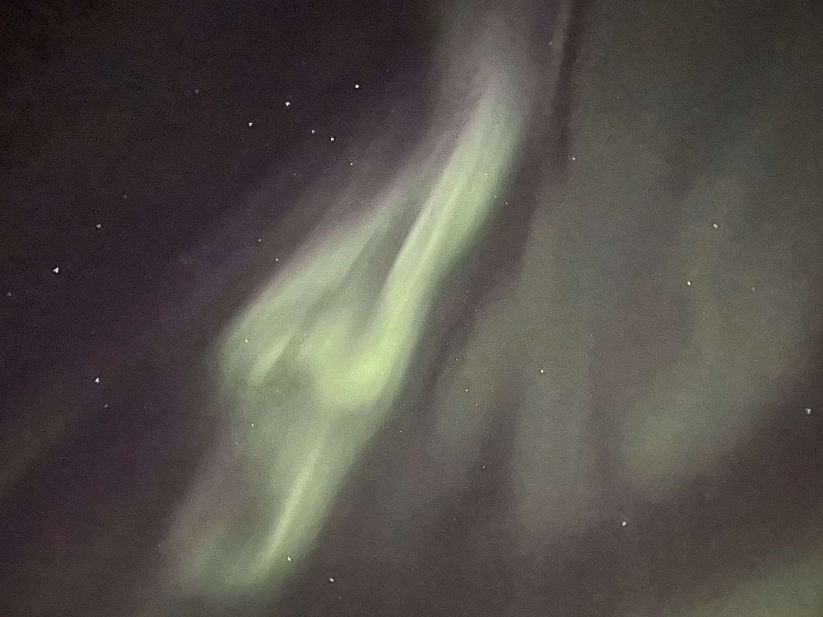 Um ca. 23.00 Uhr wachten wir kältebedingt auf. Chrigi fand wir müssten die Zähne noch putzen, öffnete seinen Schlafsack und verliess das Zelt. Ich wünschte, ich hätte seine Willenskraft. Nur schon die schützende Wärme des Schlafsackes zu verlassen erschien mir schier unmöglich. Doch dann sagte Chrigi von aussen, es hätte Nordlichter.