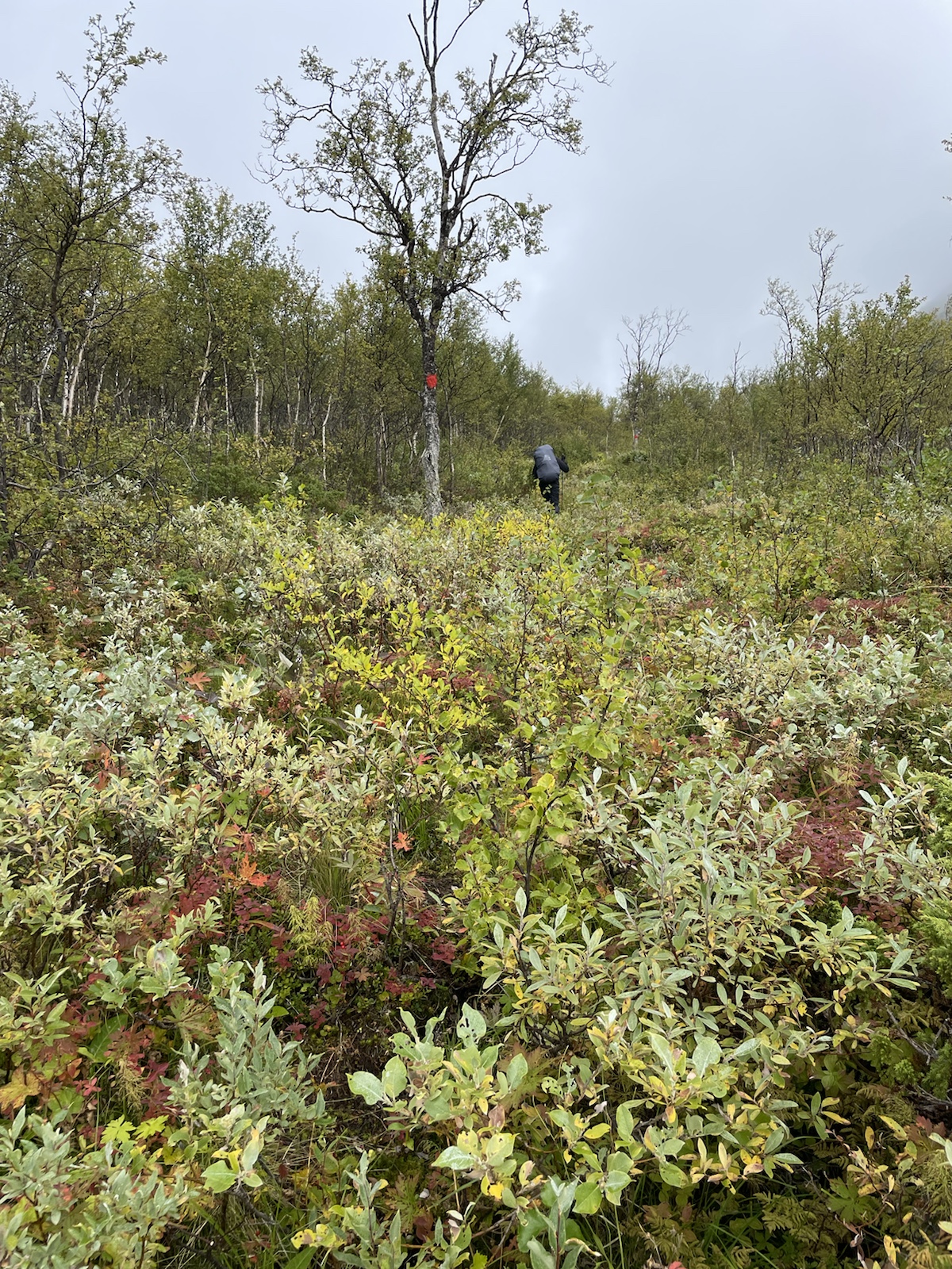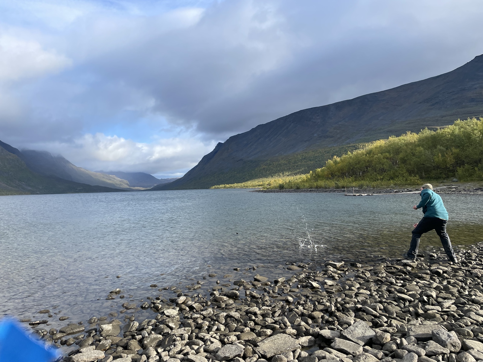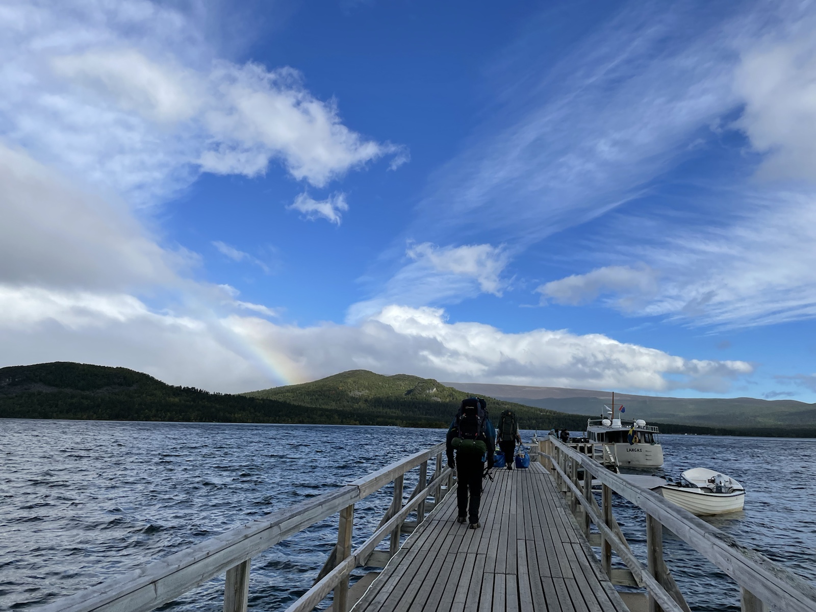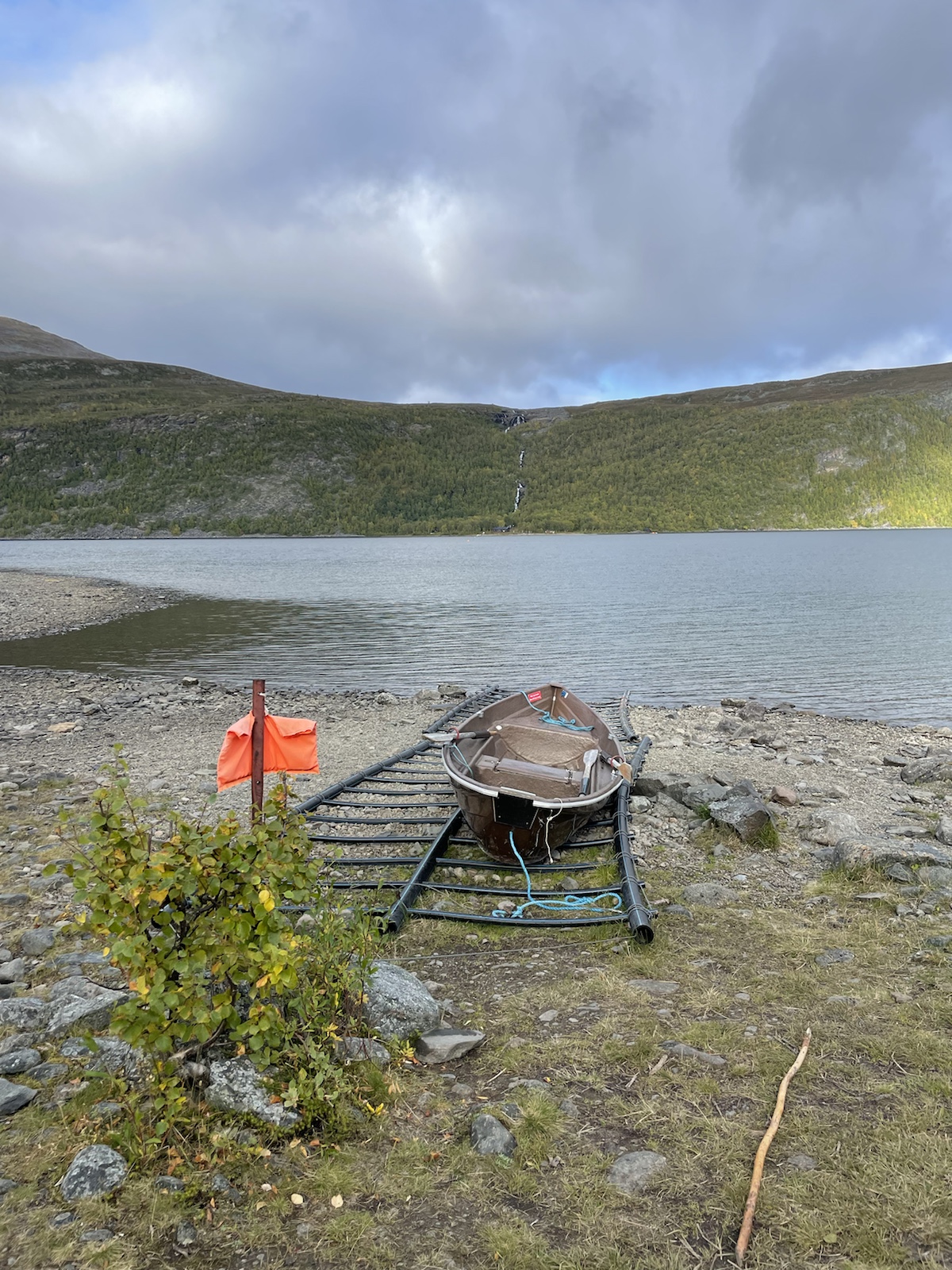 Zuerst aber noch Energie tanken. Es geniessen Käse zu essen (während man den schweizer Käse sehnlichst vermisst).Um 10.10 Uhr fuhr die Fähre. Begleitet von einem Regenbogen, welcher während der Überfahrt zu einem vollen Bogen anwuchs. Auf der anderen Seite angekommen mussten wir 15 Minuten auf den Bus warten. Wir verabschiedeten uns von den drei Schweizerinnen, die ein Taxi in die andere Richtung bestellt hatten und die Heimreise antreten würden. Chrigi war auf der Überfahrt boch aufgefallen, dass der – noch sehr junge – Kapitän einen imposanten auf der Seite nach oben angespitzen Schnauzbart hatte. Er habe in ihm den Eindruck erweckt, Tom Hardy (dem er glich) zu sein, der sich als Schauspieler auf eine Rolle vorbereitet und sich als Kapitän verkleidet hatte. Ich musste ihm zustimmen.Wir hatten einen extrem netten Busfahrer, der uns mehrfach darauf hinwies, dass uns später ein sehr steiler Aufstieg erwarten würde. In einem Kaffee machten wir mit dem Bus eine Pause und nahmen eine Fika. Gut genährt, starteten wir die nächste Etappe. Alle Leute, die aus dem Bus gestiegen waren, schienen darauf zu warten, dass ein amderer losgeht. Keiner wollte der Erste sein. Also gingen Chrigi und ich selbstbewusst voran. Schliesslih kommen wir aus einer Wandernation und wir hatten auch schon ein paar Wochen Erfahrung.So viel zur Erfahrung. Irgendwo sind wir falsch abgebogen und prompt auf dem Winterpfad gelangt. Dieser war zunächsz nicht als solcher gekennzeichnet gewesen (das Winterzeichen ist ein Rotes X auf einem Stab, der Sommer ist eon Rot angemalter Stein oder Baumstamm). Erst hier merkten wir, dass wir auf dem Winterpfad waren. Ich war noch überrascht, wie feucht, buschig und schlechz ausgetrampelt der Weg war. Es wirse immer schlammiger und unwegsamer und ging ausserdem schnurgerade den Berg hoch. Wir überlegten, ob wir zurückgehen sollten, ich fand, wir sollten zunächsz weiter gehen, da der Abstoeg sehr rutschig und steil mithin gefärlich sein könnte.Also go gen wir weiter. Teilweise hatte es nicht einmal mehr einen Trampelpfad. Auf meiner InReach App sah ich jedoch, dass wir später wieder zum Fluss und damit wieder näher zum sich auf der anderen Seite befindlichen Sommerwanderweg, kommen würden.Irgendwann kamen wir wieder in die Nähe des Flusses und folgtem dem Ufer in der Hoffnung auf eine passierbare Stelle oder auf eine Brücke. Ersteres fanden wir irgendwann und kletterten auf der anderen seite einen buschigen Hügel hoch, um auf den Sommerkungsleden zurückzukommen. Irgendwoe hatteb Chrigi und ich dann einen Energieschub – evt weil es jetzt einfach ein Wanderweg ohne Hindernisse war – und wir schritten zügig voran und überholten alle, welche uns in dee Zwischenzeit überholt hatten. Eigentlich ja nicht wirklich überholt, weil wir ja auf einem anderen Weg waren. Chrigi und ich bestehen darauf, das wir nach wie cor nie überholt wurden, wobei wir beide wissen, dass es daran liegen könnte, dass wir morgens später losgehen, als die wirklich schnellen Wanderer.Eine Ode an meine Kindheit. Wir gingen jeweils im Herbst in Wallis. Wanderferien. Ich erinnere mich, dass wir als Snacks jeweils Rittersport (?!) und Riesen dabei hatten. Während dem Essen wurde ich richtig nostalgisch. Ausserdem bin ich davon überzeugt, dass es mich in diesem Huddelwetter innen gewärmt hat.Und einfach so, war plötzlich der Herbst da.Von oben sahen wir schliesslich den See, an dem man entweder selber rudern, oder um 17.15 Uhr mit einem Motorboot rüberfahren würden können. Wir hatten Pech. auf dem Kungsleden muss es bei den Ruderbooten immer ein Boot pro Seite haben. Dies bedeutet, dass wir hier auf die andere Seite hätten rudern müssen, dort eines der beiden Boote an unser Boot hätten anmachen müssen, mit beiden zurückrudern und schliesslich mit einem ein drittes Mal den See hätten überqueren müssen. Der Deutsche und der Belgier kamen kurz nach uns an und erkundigten sich, ob sie das Boot nehmen dürften, im Wissen darum, die Reise dreimal machen zu müssen. Sie hatten für eine Überfahrt infolge Strömung und Wind etwa 25 Minuten. Dort hatten sie jedoch das Glück, dass jemand von der anderen Seite kam und mit dem Boot zurückruderte. Zu diesem Zeitpunkt mussten wir nur noch etwa 40 Minuten waren, was für uns beide in Ordnung war.Chrigi begann in der spektakulären Landschaft Steine übers Wasser zu spicken.Irgendwann kam eine weitere Person beim See an. Er sprach uns an und erkundigte sich, ob wir gemeinsam mit dem Boot rüber geheb wollten. Die Leute der anderen Seite waren noch nicht losgerudert. Wir erklärten ihm das Problem mit den Booten und dass in ca. 20 Minuten ein Motorboot kommen würde, das wohl schneller sein würde, als wir für die Überquerung benötigen würden. Es stellte sich heraus, dass er ein kn Bern lebender Emmentaler war. Er war erst heute Morgen gestartet und plante nur den nördlichsten Teil des Kungsleden zu wandern. Ein Zelt hatte er nicht. Er würde biwakieren. Chrigi und ich fanden das angesichts der kalten Nächte mutig. Jedoch sollten die kommenden Nächte zum Glück wärmer werden.Das Boot kam um 17.15 Uhr. In der Zwischenzeit waren alle Personen, die mit uns mit dem Bus angereist waren am See angekommen. Bis wir unsere Rucksäcke wieder abgezogen hatten, sassen schon vier Leute im Boot und uns wurde gesagt, dass wir warten müssten, er werde ein zeites Mal kommen. Ich fand dies ziemlich unfair, da wir bereits mehr als 1h 15min gewartet hatten und die andern erst vor etwa 15min angekommen waren. Im Nachhinein stellte sich heraus, dass drei der vier Leute in unserem Boot weitergewandert sind und diejenigen im ersten Boot alle bei der Hütte geblieben sind. Ich war wirklich wütend und beklagte mich bei Chrigi, dass sie uns Lichtzeit gestohlen hätten. Er nahm das Ganze sehr gelassen und sagte, es werde schon klappen. Am Abend begann es, als wir endlich einen Zeltplatz mit Wasser gefunden hatten, bereits einzudunkeln.Nach dem Abstieg,
