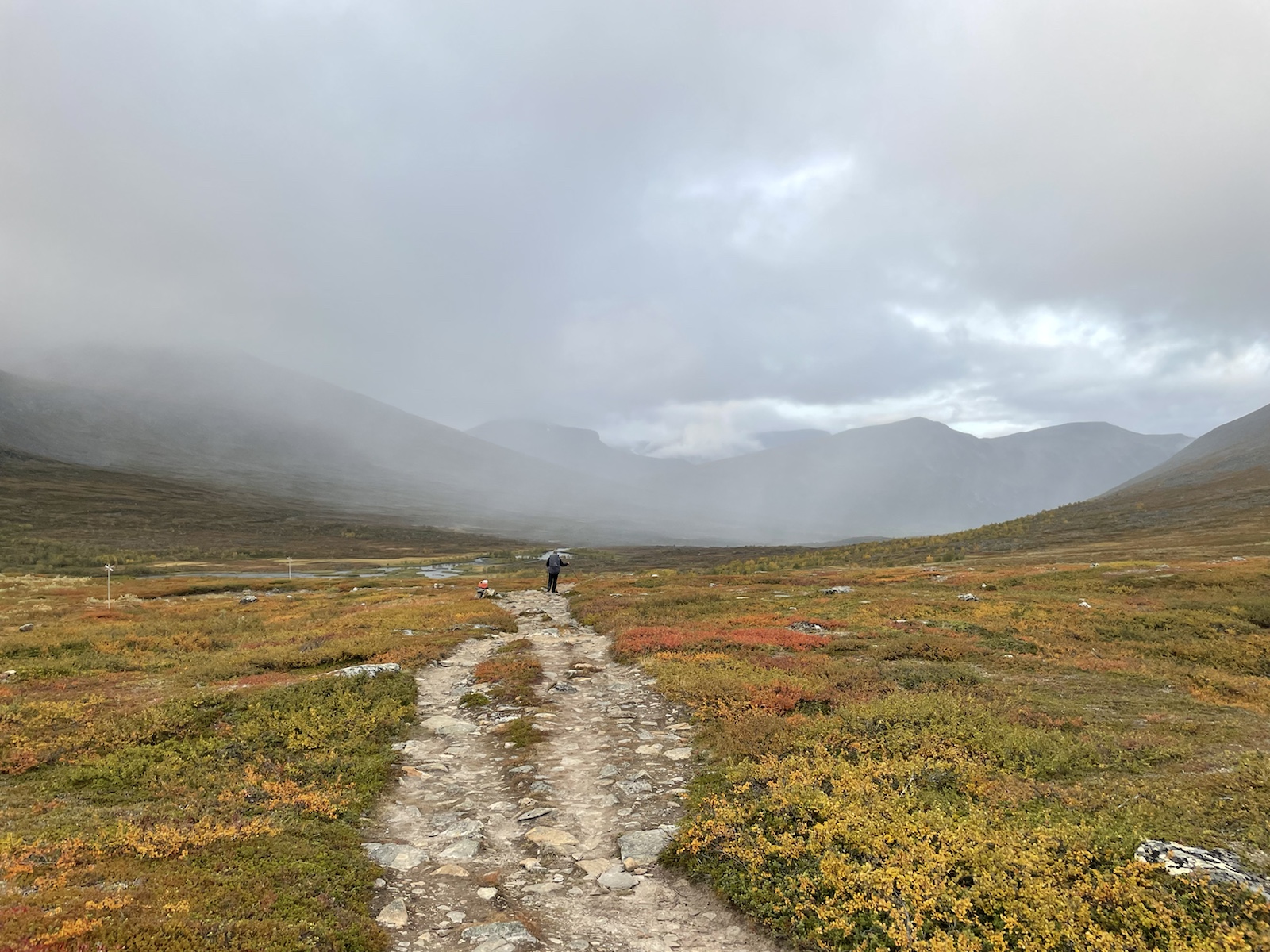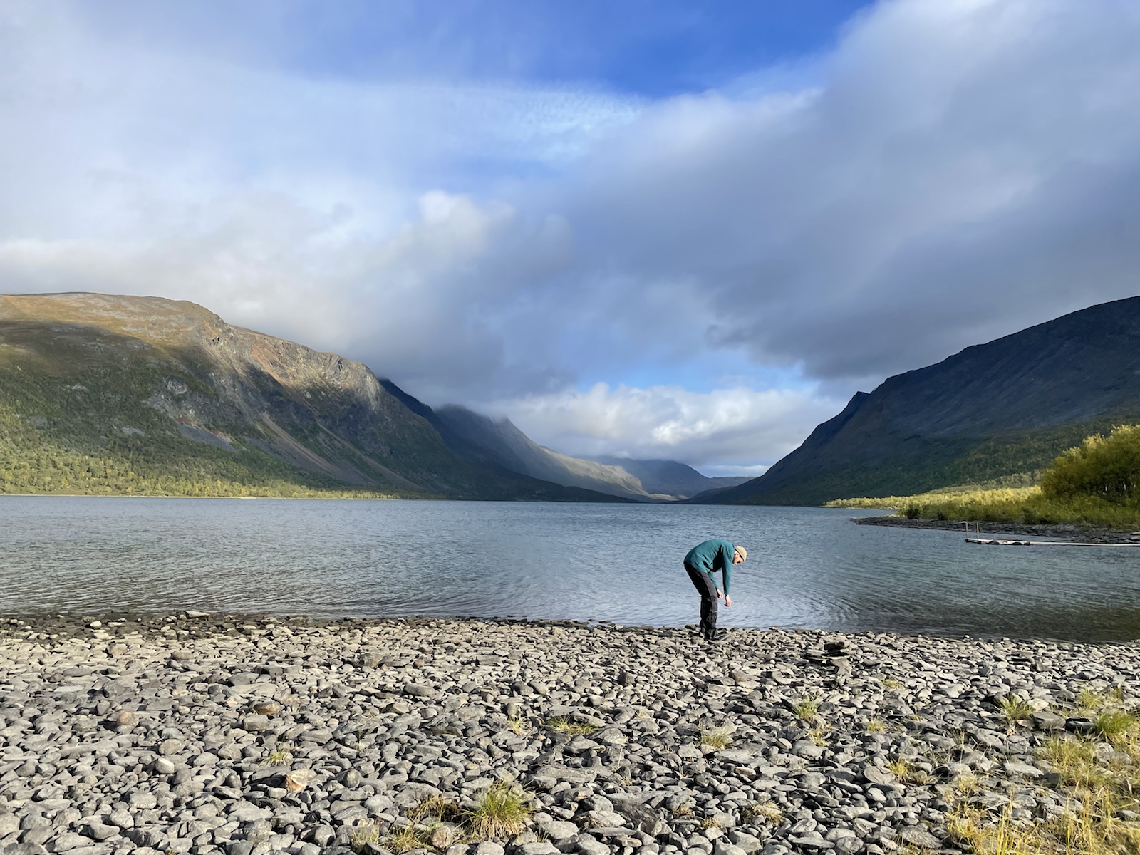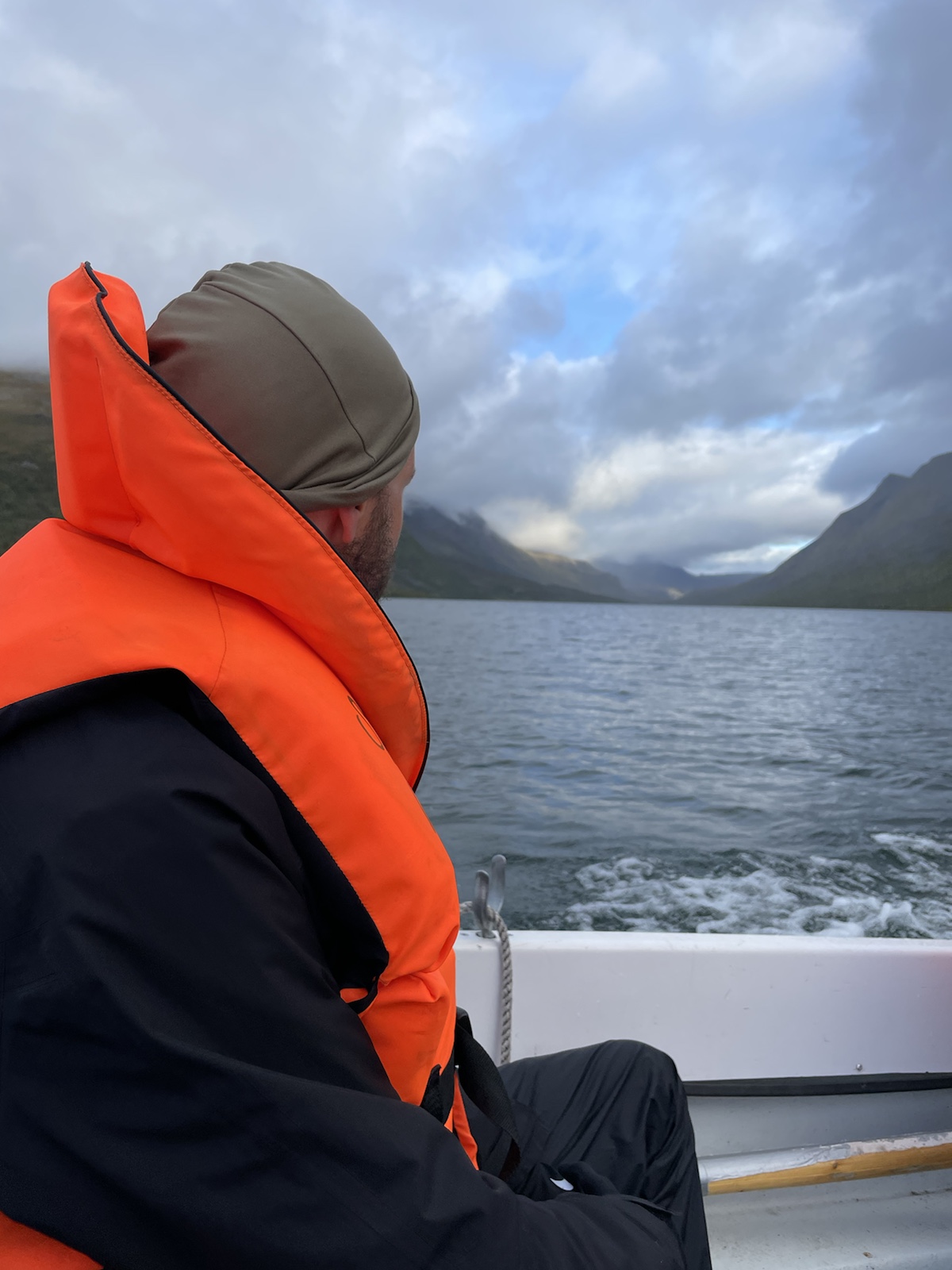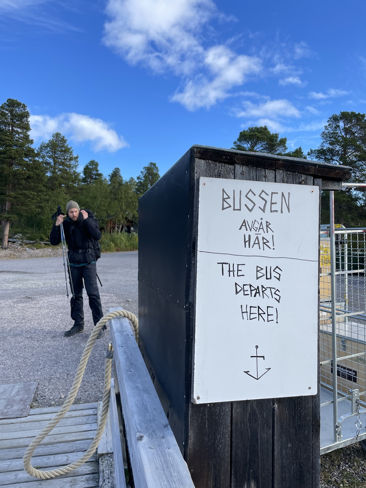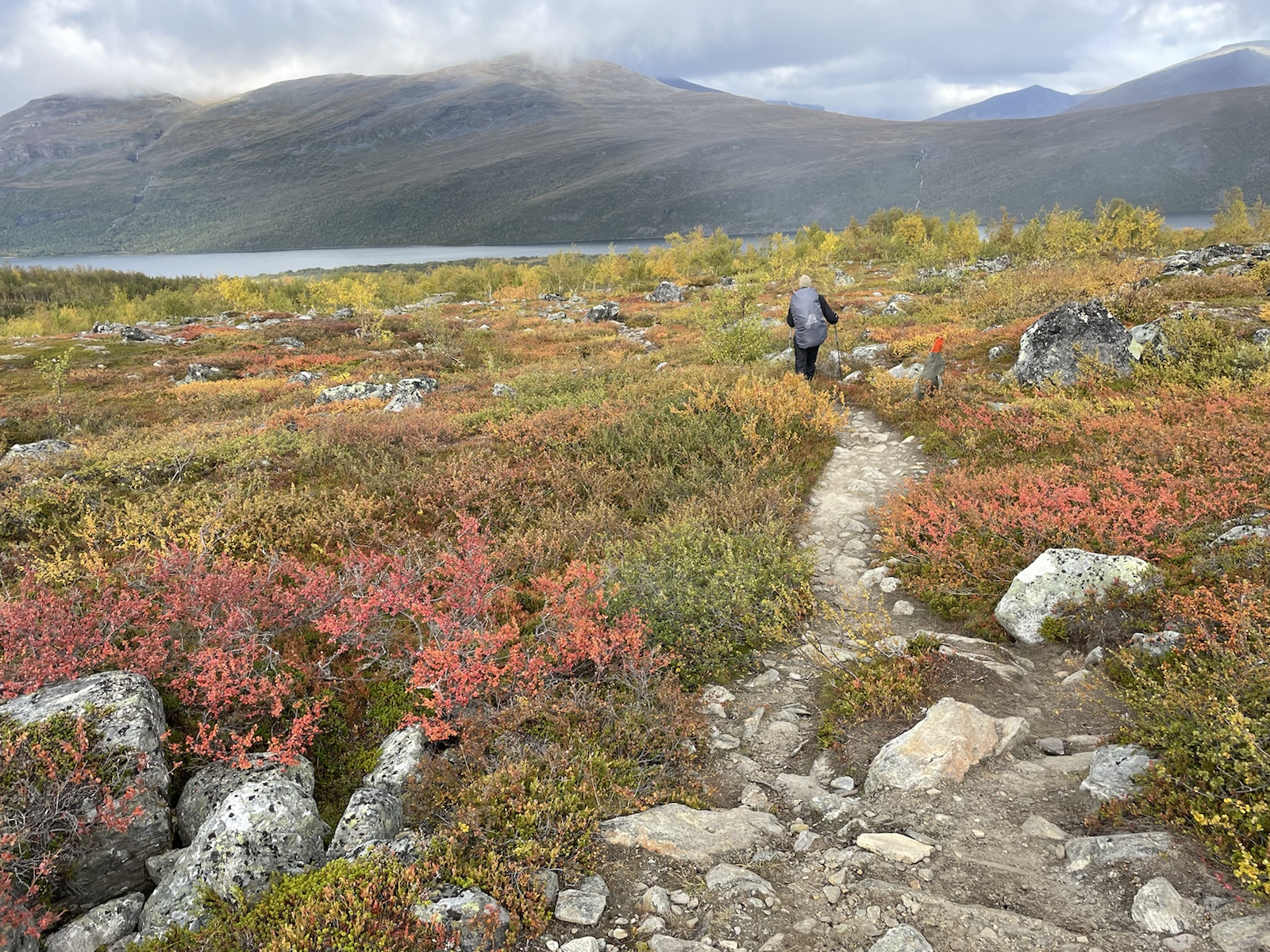 Zuerst aber noch Energie tanken. Es geniessen Käse zu essen (während man den schweizer Käse sehnlichst vermisst).Um 10.10 Uhr fuhr die Fähre. Begleitet von einem Regenbogen, welcher während der Überfahrt zu einem vollen Bogen anwuchs. Auf der anderen Seite angekommen mussten wir 15 Minuten auf den Bus warten. Wir verabschiedeten uns von den drei Schweizerinnen, die ein Taxi in die andere Richtung bestellt hatten und die Heimreise antreten würden. Chrigi war auf der Überfahrt boch aufgefallen, dass der – noch sehr junge – Kapitän einen imposanten auf der Seite nach oben angespitzen Schnauzbart hatte. Er habe in ihm den Eindruck erweckt, Tom Hardy (dem er glich) zu sein, der sich als Schauspieler auf eine Rolle vorbereitet und sich als Kapitän verkleidet hatte. Ich musste ihm zustimmen.Wir hatten einen extrem netten Busfahrer, der uns mehrfach darauf hinwies, dass uns später ein sehr steiler Aufstieg erwarten würde. In einem Kaffee machten wir mit dem Bus eine Pause und nahmen eine Fika. Gut genährt, starteten wir die nächste Etappe. Alle Leute, die aus dem Bus gestiegen waren, schienen darauf zu warten, dass ein amderer losgeht. Keiner wollte der Erste sein. Also gingen Chrigi und ich selbstbewusst voran. Schliesslih kommen wir aus einer Wandernation und wir hatten auch schon ein paar Wochen Erfahrung.So viel zur Erfahrung. Irgendwo sind wir falsch abgebogen und prompt auf dem Winterpfad gelangt. Dieser war zunächsz nicht als solcher gekennzeichnet gewesen (das Winterzeichen ist ein Rotes X auf einem Stab, der Sommer ist eon Rot angemalter Stein oder Baumstamm). Erst hier merkten wir, dass wir auf dem Winterpfad waren. Ich war noch überrascht, wie feucht, buschig und schlechz ausgetrampelt der Weg war. Es wirse immer schlammiger und unwegsamer und ging ausserdem schnurgerade den Berg hoch. Wir überlegten, ob wir zurückgehen sollten, ich fand, wir sollten zunächsz weiter gehen, da der Abstoeg sehr rutschig und steil mithin gefärlich sein könnte.Also go gen wir weiter. Teilweise hatte es nicht einmal mehr einen Trampelpfad. Auf meiner InReach App sah ich jedoch, dass wir später wieder zum Fluss und damit wieder näher zum sich auf der anderen Seite befindlichen Sommerwanderweg, kommen würden.Irgendwann kamen wir wieder in die Nähe des Flusses und folgtem dem Ufer in der Hoffnung auf eine passierbare Stelle oder auf eine Brücke. Ersteres fanden wir irgendwann und kletterten auf der anderen seite einen buschigen Hügel hoch, um auf den Sommerkungsleden zurückzukommen. Irgendwoe hatteb Chrigi und ich dann einen Energieschub – evt weil es jetzt einfach ein Wanderweg ohne Hindernisse war – und wir schritten zügig voran und überholten alle, welche uns in dee Zwischenzeit überholt hatten. Eigentlich ja nicht wirklich überholt, weil wir ja auf einem anderen Weg waren. Chrigi und ich bestehen darauf, das wir nach wie cor nie überholt wurden, wobei wir beide wissen, dass es daran liegen könnte, dass wir morgens später losgehen, als die wirklich schnellen Wanderer.Eine Ode an meine Kindheit. Wir gingen jeweils im Herbst in Wallis. Wanderferien. Ich erinnere mich, dass wir als Snacks jeweils Rittersport (?!) und Riesen dabei hatten. Während dem Essen wurde ich richtig nostalgisch. Ausserdem bin ich davon überzeugt, dass es mich in diesem Huddelwetter innen gewärmt hat.Und einfach so, war plötzlich der Herbst da.Von oben sahen wir schliesslich den See, an dem man entweder selber rudern, oder um 17.15 Uhr mit einem Motorboot rüberfahren würden können. Wir hatten Pech. auf dem Kungsleden muss es bei den Ruderbooten immer ein Boot pro Seite haben. Dies bedeutet, dass wir hier auf die andere Seite hätten rudern müssen, dort eines der beiden Boote an unser Boot hätten anmachen müssen, mit beiden zurückrudern und schliesslich mit einem ein drittes Mal den See hätten überqueren müssen. Der Deutsche und der Belgier kamen kurz nach uns an und erkundigten sich, ob sie das Boot nehmen dürften, im Wissen darum, die Reise dreimal machen zu müssen. Sie hatten für eine Überfahrt infolge Strömung und Wind etwa 25 Minuten. Dort hatten sie jedoch das Glück, dass jemand von der anderen Seite kam und mit dem Boot zurückruderte. Zu diesem Zeitpunkt mussten wir nur noch etwa 40 Minuten waren, was für uns beide in Ordnung war.Chrigi begann in der spektakulären Landschaft Steine übers Wasser zu spicken.Irgendwann kam eine weitere Person beim See an. Er sprach uns an und erkundigte sich, ob wir gemeinsam mit dem Boot rüber geheb wollten. Die Leute der anderen Seite waren noch nicht losgerudert. Wir erklärten ihm das Problem mit den Booten und dass in ca. 20 Minuten ein Motorboot kommen würde, das wohl schneller sein würde, als wir für die Überquerung benötigen würden. Es stellte sich heraus, dass er ein kn Bern lebender Emmentaler war. Er war erst heute Morgen gestartet und plante nur den nördlichsten Teil des Kungsleden zu wandern. Ein Zelt hatte er nicht. Er würde biwakieren. Chrigi und ich fanden das angesichts der kalten Nächte mutig. Jedoch sollten die kommenden Nächte zum Glück wärmer werden.Das Boot kam um 17.15 Uhr. In der Zwischenzeit waren alle Personen, die mit uns mit dem Bus angereist waren am See angekommen. Bis wir unsere Rucksäcke wieder abgezogen hatten, sassen schon vier Leute im Boot und uns wurde gesagt, dass wir warten müssten, er werde ein zeites Mal kommen. Ich fand dies ziemlich unfair, da wir bereits mehr als 1h 15min gewartet hatten und die andern erst vor etwa 15min angekommen waren. Im Nachhinein stellte sich heraus, dass drei der vier Leute in unserem Boot weitergewandert sind und diejenigen im ersten Boot alle bei der Hütte geblieben sind. Ich war wirklich wütend und beklagte mich bei Chrigi, dass sie uns Lichtzeit gestohlen hätten. Er nahm das Ganze sehr gelassen und sagte, es werde schon klappen. Am Abend begann es, als wir endlich einen Zeltplatz mit Wasser gefunden hatten, bereits einzudunkeln.Nach dem Abstieg,