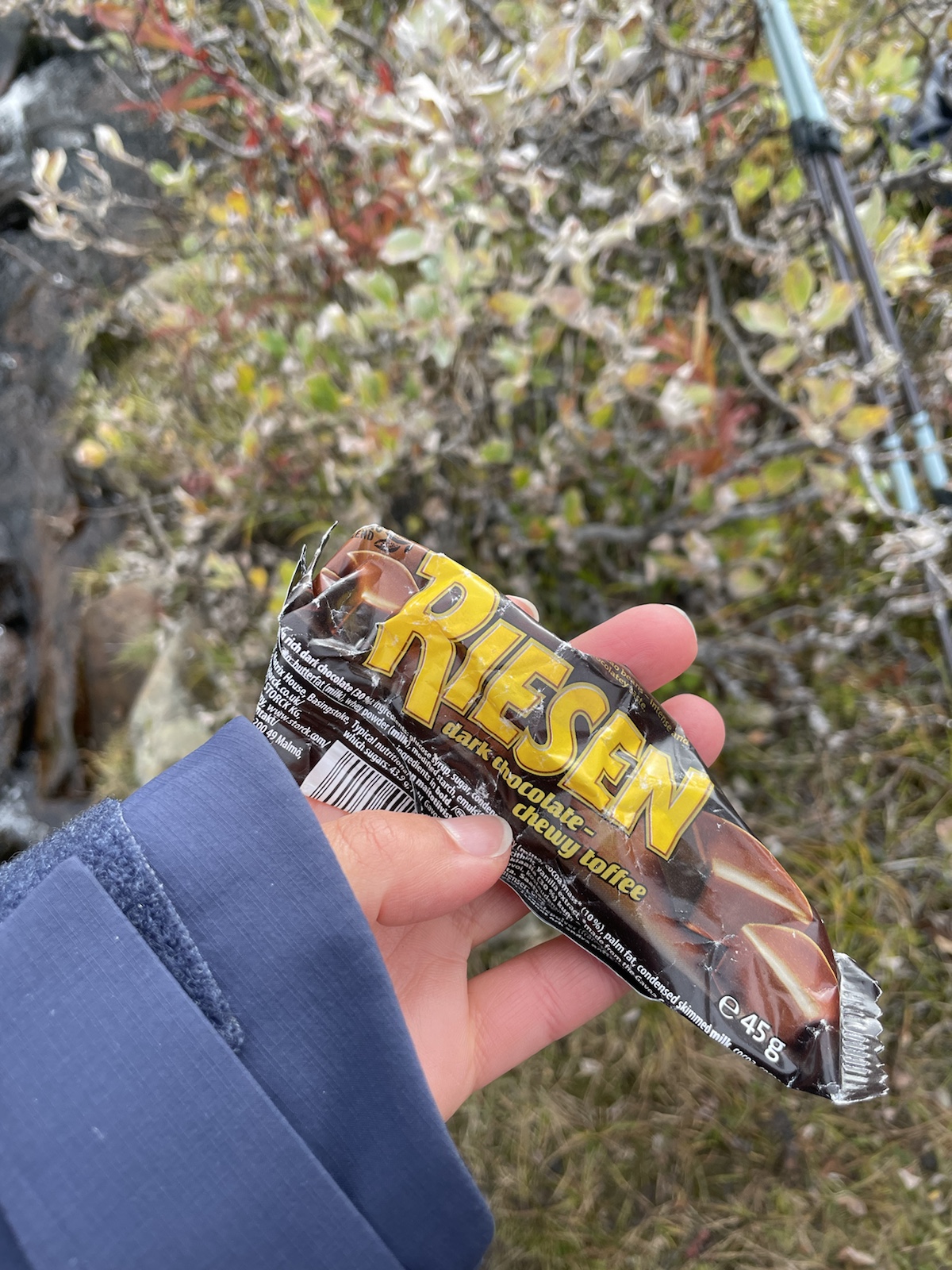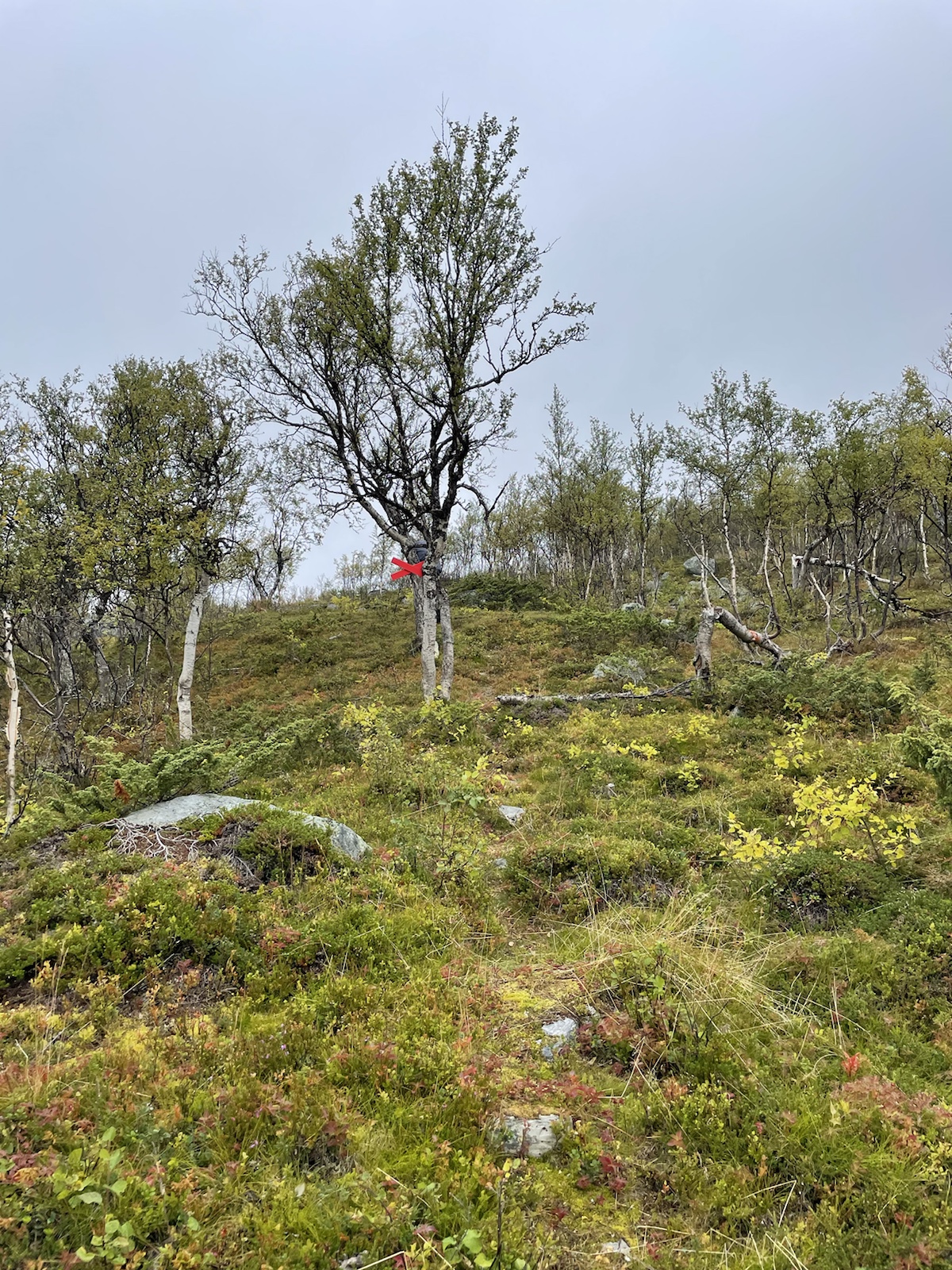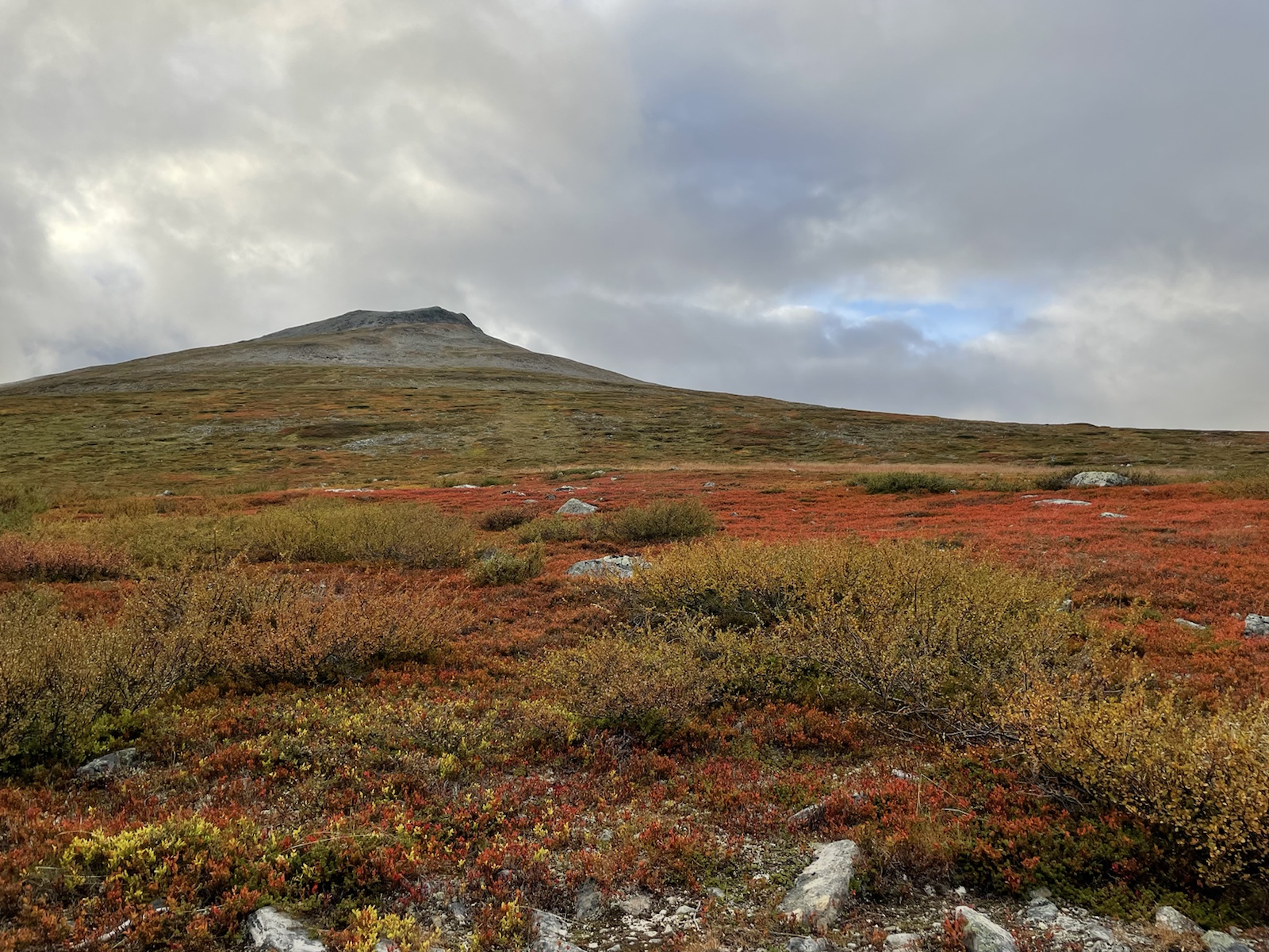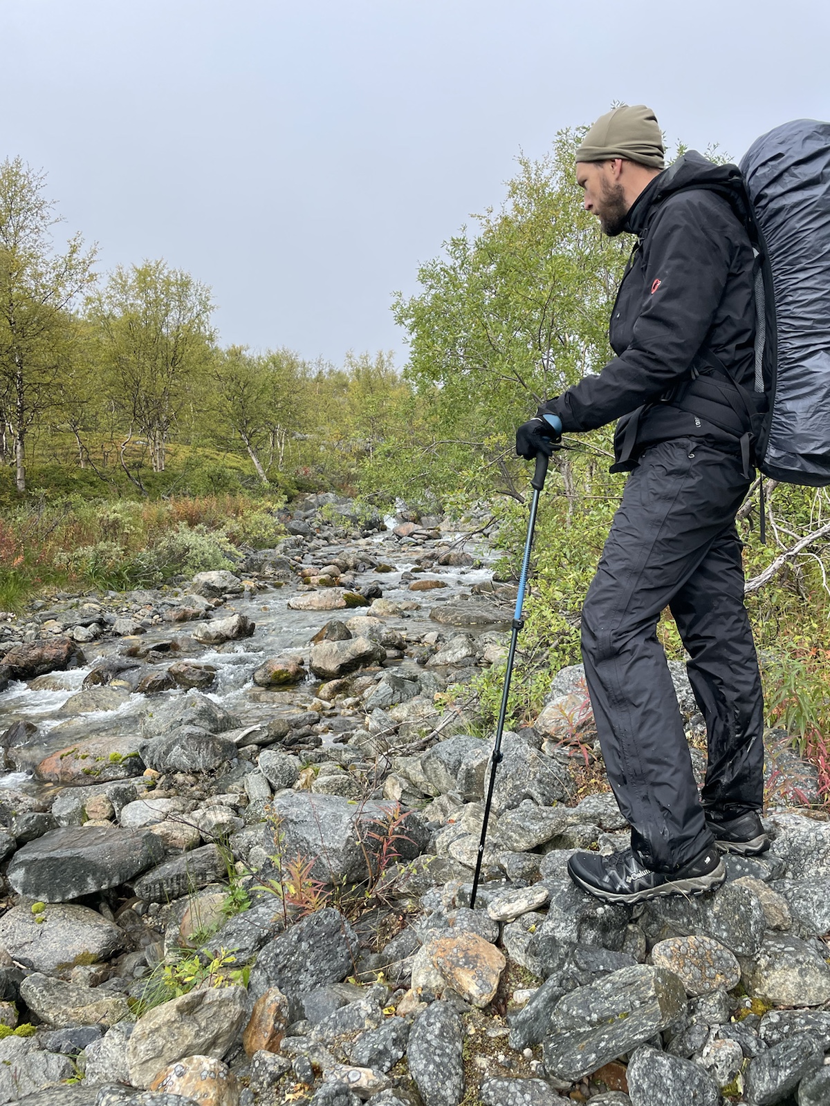 Zuerst aber noch Energie tanken. Es geniessen Käse zu essen (während man den schweizer Käse sehnlichst vermisst).Um 10.10 Uhr fuhr die Fähre. Begleitet von einem Regenbogen, welcher während der Überfahrt zu einem vollen Bogen anwuchs. Auf der anderen Seite angekommen mussten wir 15 Minuten auf den Bus warten. Wir verabschiedeten uns von den drei Schweizerinnen, die ein Taxi in die andere Richtung bestellt hatten und die Heimreise antreten würden. Chrigi war auf der Überfahrt boch aufgefallen, dass der – noch sehr junge – Kapitän einen imposanten auf der Seite nach oben angespitzen Schnauzbart hatte. Er habe in ihm den Eindruck erweckt, Tom Hardy (dem er glich) zu sein, der sich als Schauspieler auf eine Rolle vorbereitet und sich als Kapitän verkleidet hatte. Ich musste ihm zustimmen.Wir hatten einen extrem netten Busfahrer, der uns mehrfach darauf hinwies, dass uns später ein sehr steiler Aufstieg erwarten würde. In einem Kaffee machten wir mit dem Bus eine Pause und nahmen eine Fika. Gut genährt, starteten wir die nächste Etappe. Alle Leute, die aus dem Bus gestiegen waren, schienen darauf zu warten, dass ein amderer losgeht. Keiner wollte der Erste sein. Also gingen Chrigi und ich selbstbewusst voran. Schliesslih kommen wir aus einer Wandernation und wir hatten auch schon ein paar Wochen Erfahrung.So viel zur Erfahrung. Irgendwo sind wir falsch abgebogen und prompt auf dem Winterpfad gelangt. Dieser war zunächsz nicht als solcher gekennzeichnet gewesen (das Winterzeichen ist ein Rotes X auf einem Stab, der Sommer ist eon Rot angemalter Stein oder Baumstamm). Erst hier merkten wir, dass wir auf dem Winterpfad waren. Ich war noch überrascht, wie feucht, buschig und schlechz ausgetrampelt der Weg war. Es wirse immer schlammiger und unwegsamer und ging ausserdem schnurgerade den Berg hoch. Wir überlegten, ob wir zurückgehen sollten, ich fand, wir sollten zunächsz weiter gehen, da der Abstoeg sehr rutschig und steil mithin gefärlich sein könnte.Also go gen wir weiter. Teilweise hatte es nicht einmal mehr einen Trampelpfad. Auf meiner InReach App sah ich jedoch, dass wir später wieder zum Fluss und damit wieder näher zum sich auf der anderen Seite befindlichen Sommerwanderweg, kommen würden.Irgendwann kamen wir wieder in die Nähe des Flusses und folgtem dem Ufer in der Hoffnung auf eine passierbare Stelle oder auf eine Brücke. Ersteres fanden wir irgendwann und kletterten auf der anderen seite einen buschigen Hügel hoch, um auf den Sommerkungsleden zurückzukommen. Irgendwoe hatteb Chrigi und ich dann einen Energieschub – evt weil es jetzt einfach ein Wanderweg ohne Hindernisse war – und wir schritten zügig voran und überholten alle, welche uns in dee Zwischenzeit überholt hatten. Eigentlich ja nicht wirklich überholt, weil wir ja auf einem anderen Weg waren. Chrigi und ich bestehen darauf, das wir nach wie cor nie überholt wurden, wobei wir beide wissen, dass es daran liegen könnte, dass wir morgens später losgehen, als die wirklich schnellen Wanderer.Eine Ode an meine Kindheit. Wir gingen jeweils im Herbst in Wallis. Wanderferien. Ich erinnere mich, dass wir als Snacks jeweils Rittersport (?!) und Riesen dabei hatten. Während dem Essen wurde ich richtig nostalgisch. Ausserdem bin ich davon überzeugt, dass es mich in diesem Huddelwetter innen gewärmt hat.Und einfach so, war plötzlich der Herbst da.Von oben sahen wir schliesslich den See, an dem man entweder selber rudern, oder um 17.15 Uhr mit einem Motorboot rüberfahren würden können. Wir hatten Pech. auf dem Kungsleden muss es bei den Ruderbooten immer ein Boot pro Seite haben. Dies bedeutet, dass wir hier auf die andere Seite hätten rudern müssen, dort eines der beiden Boote an unser Boot hätten anmachen müssen, mit beiden zurückrudern und schliesslich mit einem ein drittes Mal den See hätten überqueren müssen. Der Deutsche und der Belgier kamen kurz nach uns an und erkundigten sich, ob sie das Boot nehmen dürften, im Wissen darum, die Reise dreimal machen zu müssen. Sie hatten für eine Überfahrt infolge Strömung und Wind etwa 25 Minuten. Dort hatten sie jedoch das Glück, dass jemand von der anderen Seite kam und mit dem Boot zurückruderte. Zu diesem Zeitpunkt mussten wir nur noch etwa 40 Minuten waren, was für uns beide in Ordnung war.Chrigi begann in der spektakulären Landschaft Steine übers Wasser zu spicken.Irgendwann kam eine weitere Person beim See an. Er sprach uns an und erkundigte sich, ob wir gemeinsam mit dem Boot rüber geheb wollten. Die Leute der anderen Seite waren noch nicht losgerudert. Wir erklärten ihm das Problem mit den Booten und dass in ca. 20 Minuten ein Motorboot kommen würde, das wohl schneller sein würde, als wir für die Überquerung benötigen würden. Es stellte sich heraus, dass er ein kn Bern lebender Emmentaler war. Er war erst heute Morgen gestartet und plante nur den nördlichsten Teil des Kungsleden zu wandern. Ein Zelt hatte er nicht. Er würde biwakieren. Chrigi und ich fanden das angesichts der kalten Nächte mutig. Jedoch sollten die kommenden Nächte zum Glück wärmer werden.Das Boot kam um 17.15 Uhr. In der Zwischenzeit waren alle Personen, die mit uns mit dem Bus angereist waren am See angekommen. Bis wir unsere Rucksäcke wieder abgezogen hatten, sassen schon vier Leute im Boot und uns wurde gesagt, dass wir warten müssten, er werde ein zeites Mal kommen. Ich fand dies ziemlich unfair, da wir bereits mehr als 1h 15min gewartet hatten und die andern erst vor etwa 15min angekommen waren. Im Nachhinein stellte sich heraus, dass drei der vier Leute in unserem Boot weitergewandert sind und diejenigen im ersten Boot alle bei der Hütte geblieben sind. Ich war wirklich wütend und beklagte mich bei Chrigi, dass sie uns Lichtzeit gestohlen hätten. Er nahm das Ganze sehr gelassen und sagte, es werde schon klappen. Am Abend begann es, als wir endlich einen Zeltplatz mit Wasser gefunden hatten, bereits einzudunkeln.Nach dem Abstieg,