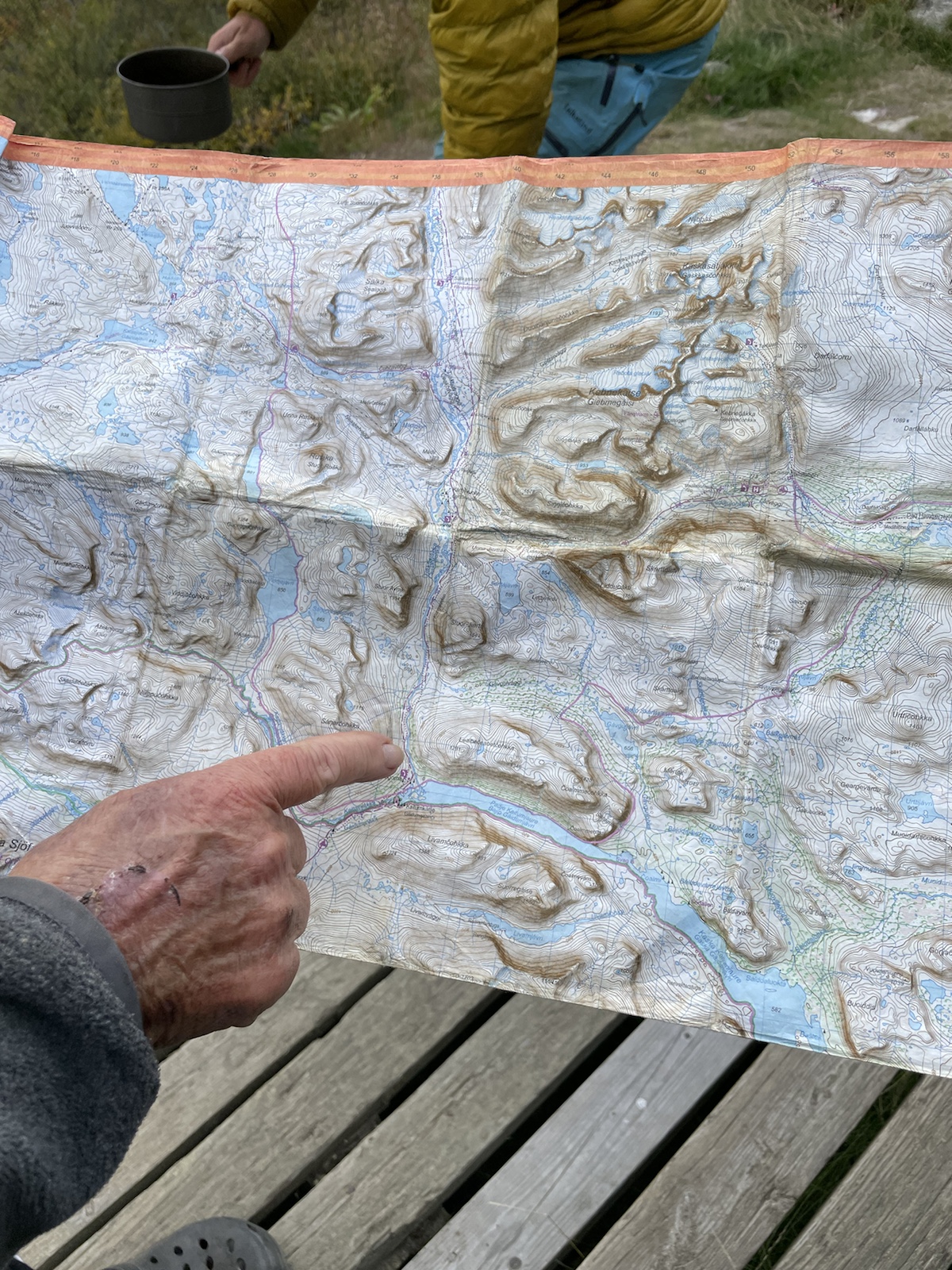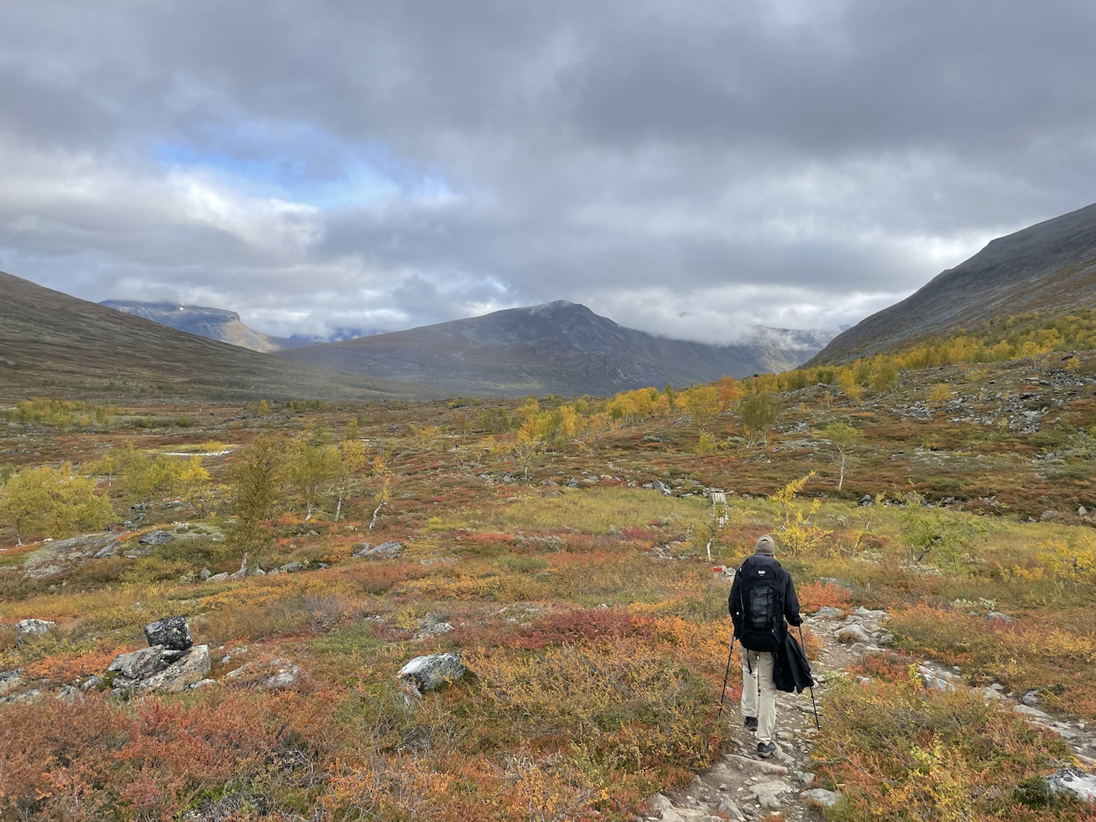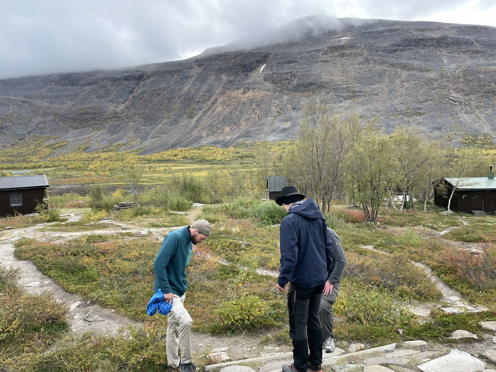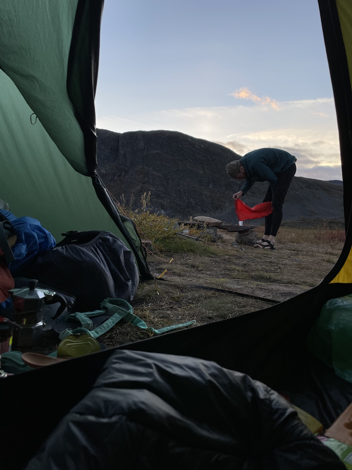 Morgenaussichten.Morgenessen. Jeder Tag. Seit dem Beginn. Ich mag es nach wie vor. Je nachdem mit Zimt oder mit Schokolade.Nach ca. 5 km kamen wir bei der Kaitumjaure an. Diese heisst wie unser Zelt (Kaitum) oder unser Zelt wie sie. Ich wollte unbedingt dort eine Pause machen, da es einen Shop hatte. Wir trafen auf die nettesten Hüttenwirte der ganzem Reise. Monika und ihr Mann (der eine Zeitlang als Banker einer schwedischer Bank an der Zürcher Bahnhofstrasse gesrbeitet hatte und Zahlen auf Züridptsch sagen konnte) waren so nett. Sie brachten uns Saft, erklärten Döös und dem Berner, welcher kurz nach uns ankam, welche Beeren essbar waren und welche nicht. Der Berner hatte bereits drei Sorren ei fach mal probiert, danihm Schweden im Zug gesagt hätten, man könne alle essen. Hiervon riet der Hüttenwart bei zweien davon ab. Eine sei gar giftig. Der Laden war leider fast leer. Wir kauften eine Handvoll Hörnli und Kartoffelstock. Hier probieren sie diverse Beeren, die bei der Hütte wachsen. Der Berner hatte in seinem Biwak gut geschlafen, jedoch etwas kalt gehabt.Die Hüttenwartin war früher Bergführerin. Wir erkundigten uns, ob sie den Vistas Trail gemacht habe. Sie bejahte und schwärmte davon, dass es ein wunderbarer Wanderweg sein. Da ich nicht sicher war, welchen Weg wir nehmen sollten, holte sie ihre Papierkarte hervor und erklärte uns, welchen Weg wir nehmen sollten. Ausserdem sollten wir Ulla grüssen (ich nahm an, diese sei in der Vistas Hütte, sie war jedoch in der Nallo Hütte, wo wir keine Pause gemacht haben) habe ihr den Gruss also nicht weitergegeben.