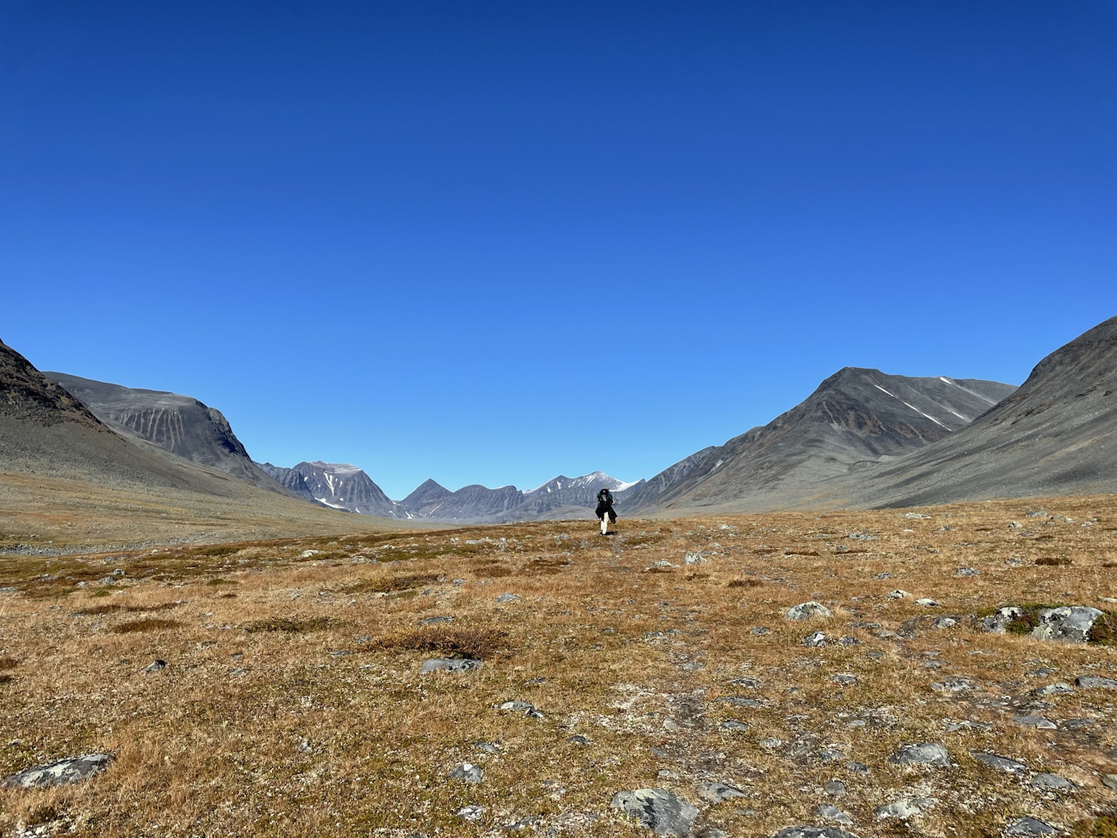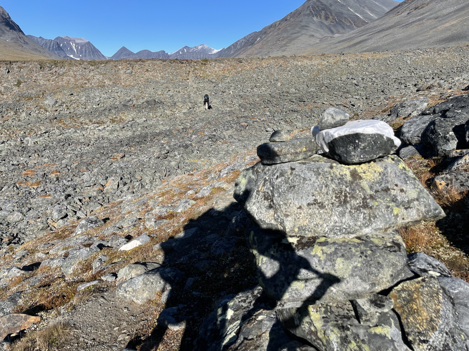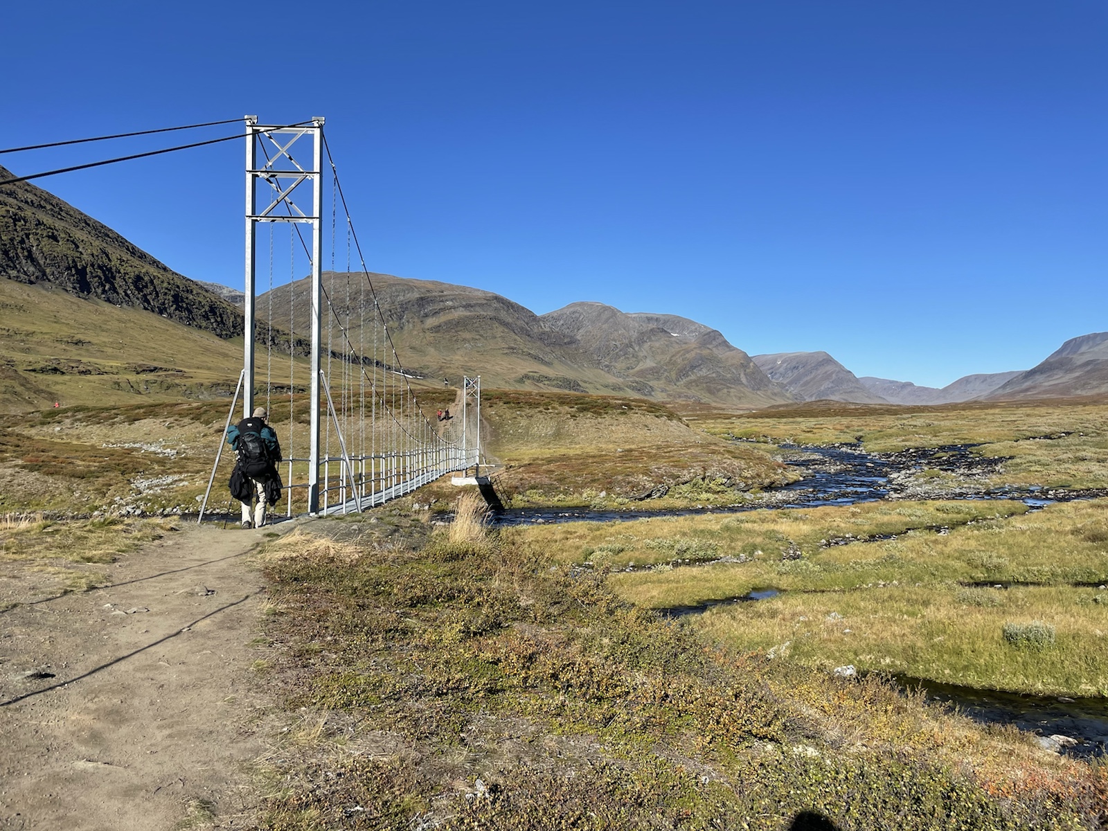 Der Morgen was kalt, zum Glück aber sonnig, weshalb wir unser Zelt in trockenem Zustand abbauen und einpacken konnten, was immer ein Luxus ist.Guten Mutes laufen wir zur Singi Hütte, wissend, dass diese einen Store hat. Nach dieser Hütte soll der Kungsleden erst recht mit Leuten gefüllt sein, da die meisten den nördlichen Teil von Abisko nach Nikkaloutka machen. Die Singi Hütte steht am Anfang des Kebnekeise, den höchsten Berg Schwedens. Wenn man dort – von Oben her gesehen – links abbiegt, kommt man zu einer grösseren STF-Hütte (mit Strom und Duschen). Von dieser aus besteigen viele Wanderer den Kebnekaise und schliessen dann ihre Wanderung in Nikkaluotka ab. Würde man bei der Singi Hütte nicht abbiegen, liefe man unseren Weg südlich weiter.Bei der Hütte hatte es viele Menschen und fast nichts mehr im Store. Anscheinend wurde nur die Alesjaure wieder mit Nahrungsmitteln aufgefüllt. Diese würden wir (wegen unserem Umweg über Vistas) erst in drei Tagen erreichen. Wir kauften Dosen baked Beans, zwei Dosen Cola, ein Bier und Kartoffelstockpulver. Die schweren Dinge assen und tranken wir vor Ort, weshalb wir dort eine längere Pause machten. Immerhin schien das Wetter auf unserer Seite zu sein. Die Nächte waren zwar kalt, jedoch sollte weiterhin die Sonne scheinen.Radfahrer haben an Armen und Beinen Abdrücke.. ich habe das.Auf nach Vistas. Froh, den überlaufenen Kungsleden zumindest kurz verlasseb zu könnten, begannen wir den kurzen Aufstieg..… auf welchen eine schier endlose Gerölllavine. Folgte.Diese war immer wieder von Moos und Flechten durchsetzt und überall flossen kleine Rinnsale.