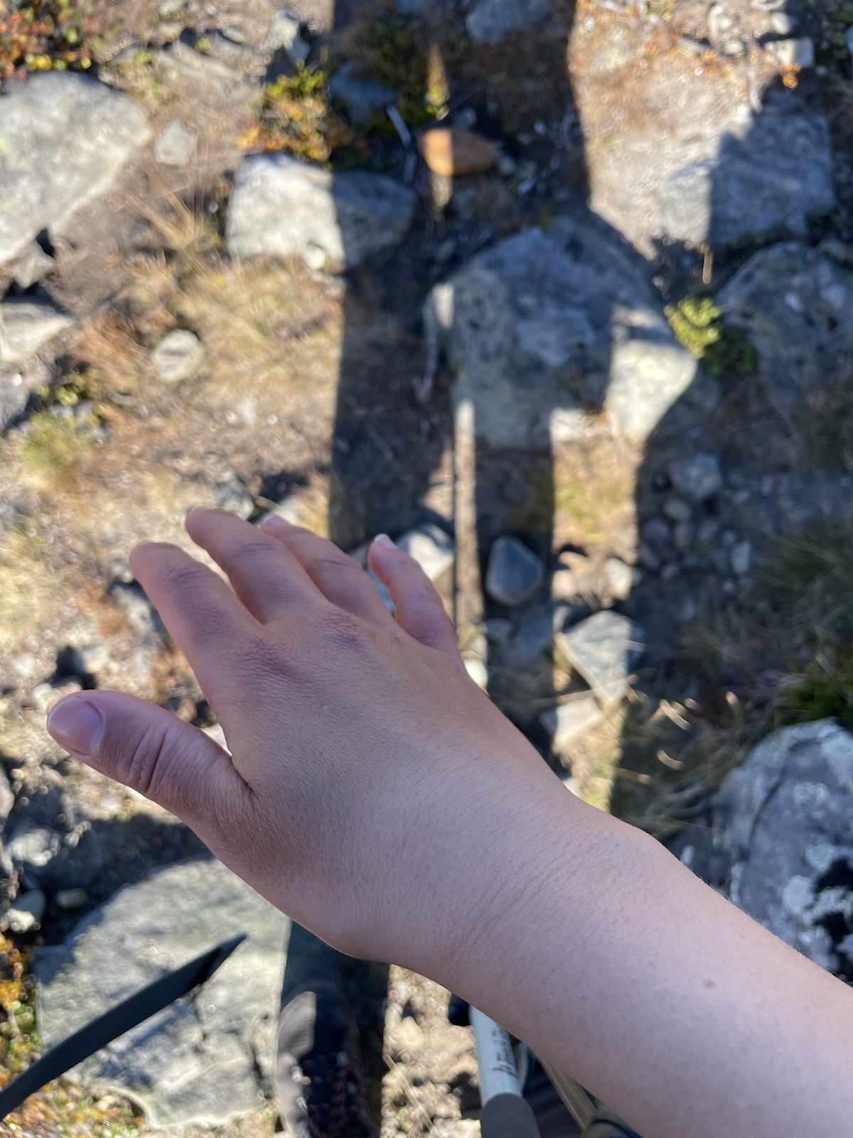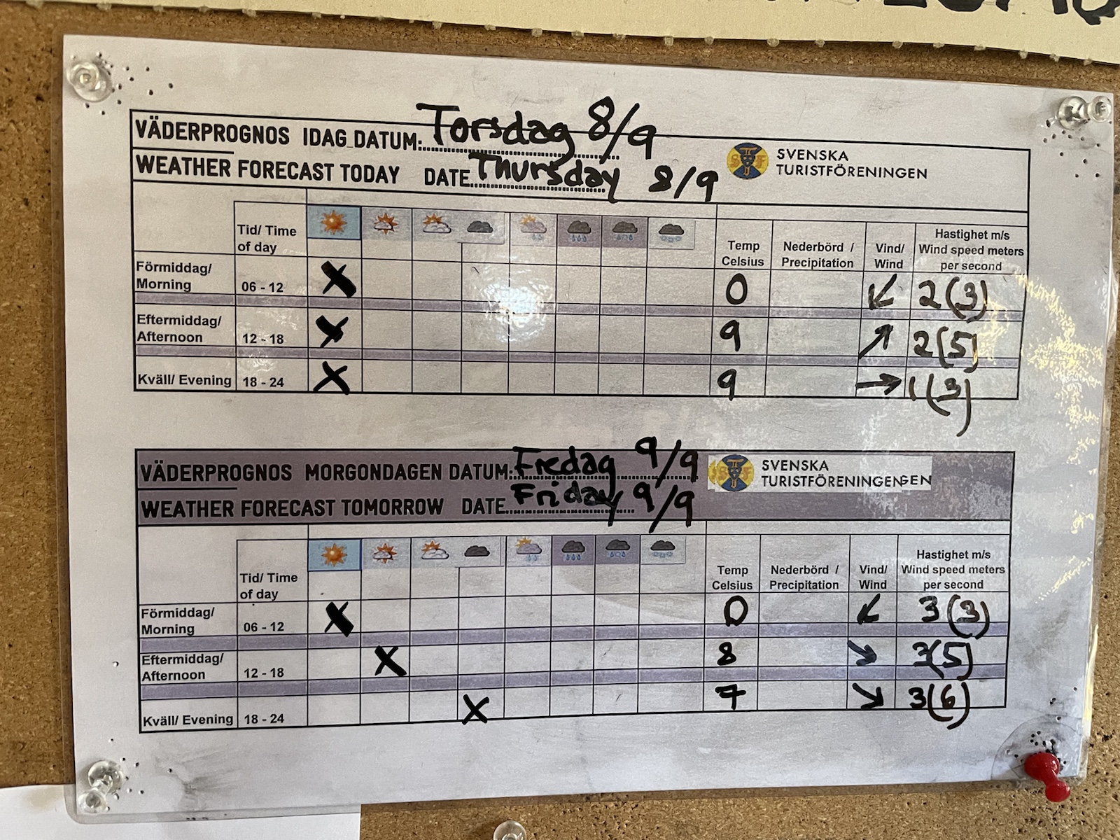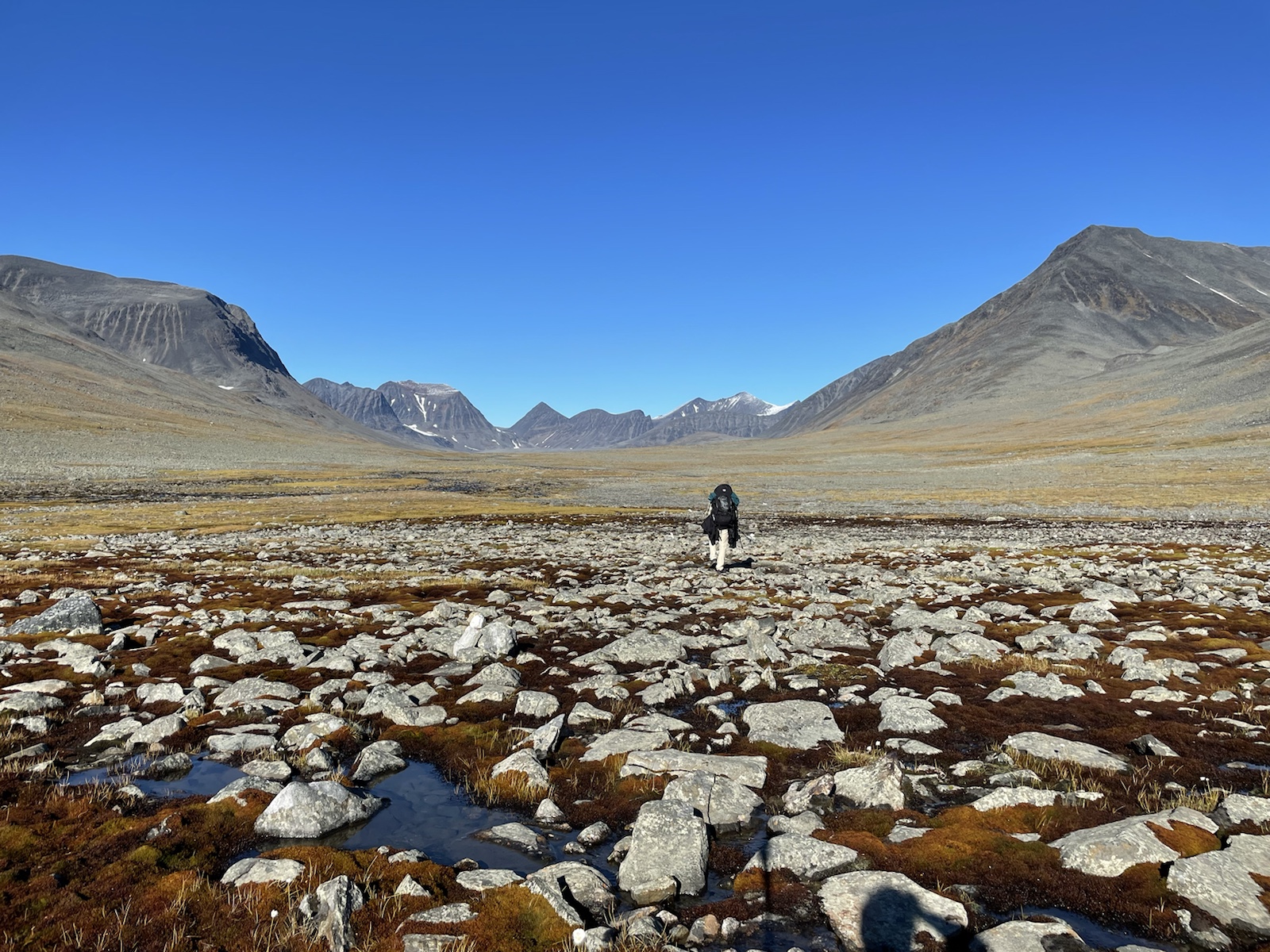 Der Morgen was kalt, zum Glück aber sonnig, weshalb wir unser Zelt in trockenem Zustand abbauen und einpacken konnten, was immer ein Luxus ist.Guten Mutes laufen wir zur Singi Hütte, wissend, dass diese einen Store hat. Nach dieser Hütte soll der Kungsleden erst recht mit Leuten gefüllt sein, da die meisten den nördlichen Teil von Abisko nach Nikkaloutka machen. Die Singi Hütte steht am Anfang des Kebnekeise, den höchsten Berg Schwedens. Wenn man dort – von Oben her gesehen – links abbiegt, kommt man zu einer grösseren STF-Hütte (mit Strom und Duschen). Von dieser aus besteigen viele Wanderer den Kebnekaise und schliessen dann ihre Wanderung in Nikkaluotka ab. Würde man bei der Singi Hütte nicht abbiegen, liefe man unseren Weg südlich weiter.Bei der Hütte hatte es viele Menschen und fast nichts mehr im Store. Anscheinend wurde nur die Alesjaure wieder mit Nahrungsmitteln aufgefüllt. Diese würden wir (wegen unserem Umweg über Vistas) erst in drei Tagen erreichen. Wir kauften Dosen baked Beans, zwei Dosen Cola, ein Bier und Kartoffelstockpulver. Die schweren Dinge assen und tranken wir vor Ort, weshalb wir dort eine längere Pause machten. Immerhin schien das Wetter auf unserer Seite zu sein. Die Nächte waren zwar kalt, jedoch sollte weiterhin die Sonne scheinen.Radfahrer haben an Armen und Beinen Abdrücke.. ich habe das.Auf nach Vistas. Froh, den überlaufenen Kungsleden zumindest kurz verlasseb zu könnten, begannen wir den kurzen Aufstieg..… auf welchen eine schier endlose Gerölllavine. Folgte.Diese war immer wieder von Moos und Flechten durchsetzt und überall flossen kleine Rinnsale.