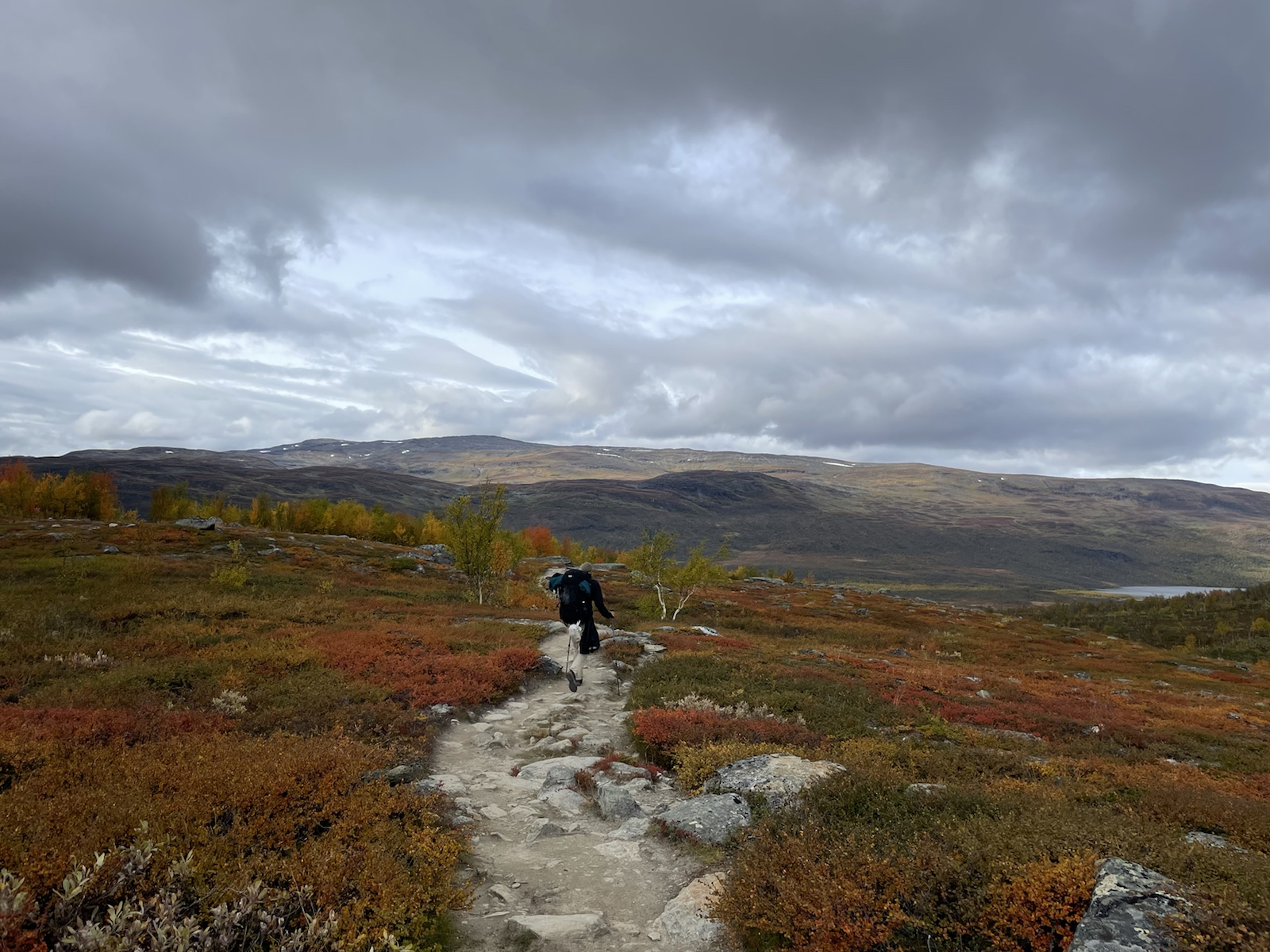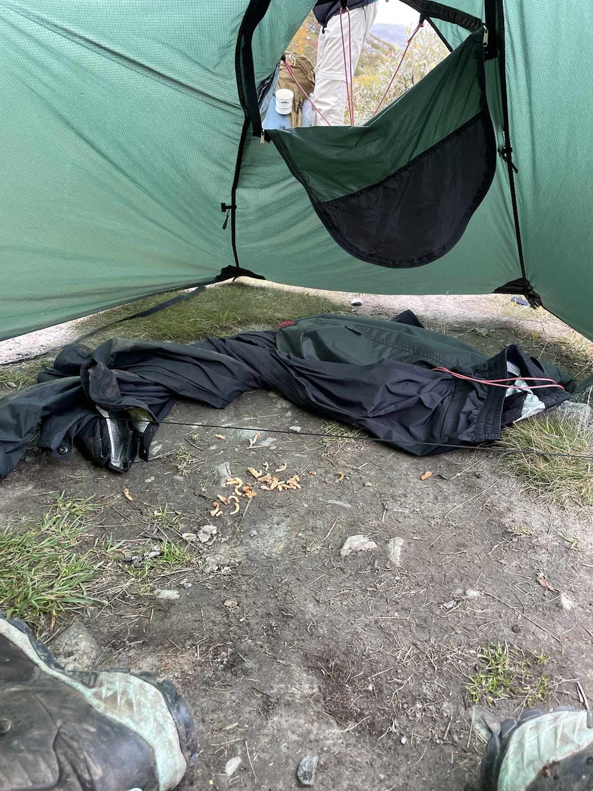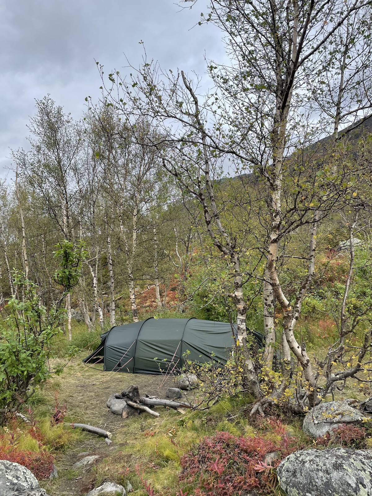 Nach einer kühlen Nacht, wachen wir in einem freuchtem Zelt und bewölktem Himmel auf. Wissend, dass das Zelt so nicht trocknen wird, beschliessen wir zu packen und loszugehen. Meine Lunge schmerzt nicht mehr, ich huste aber noch und ich fühle mich schwach. Im Gegensatz zum gestrigen Tag passt das Wetter wenigsten zu meiner Verfassung. Ich habe keine Motivation.