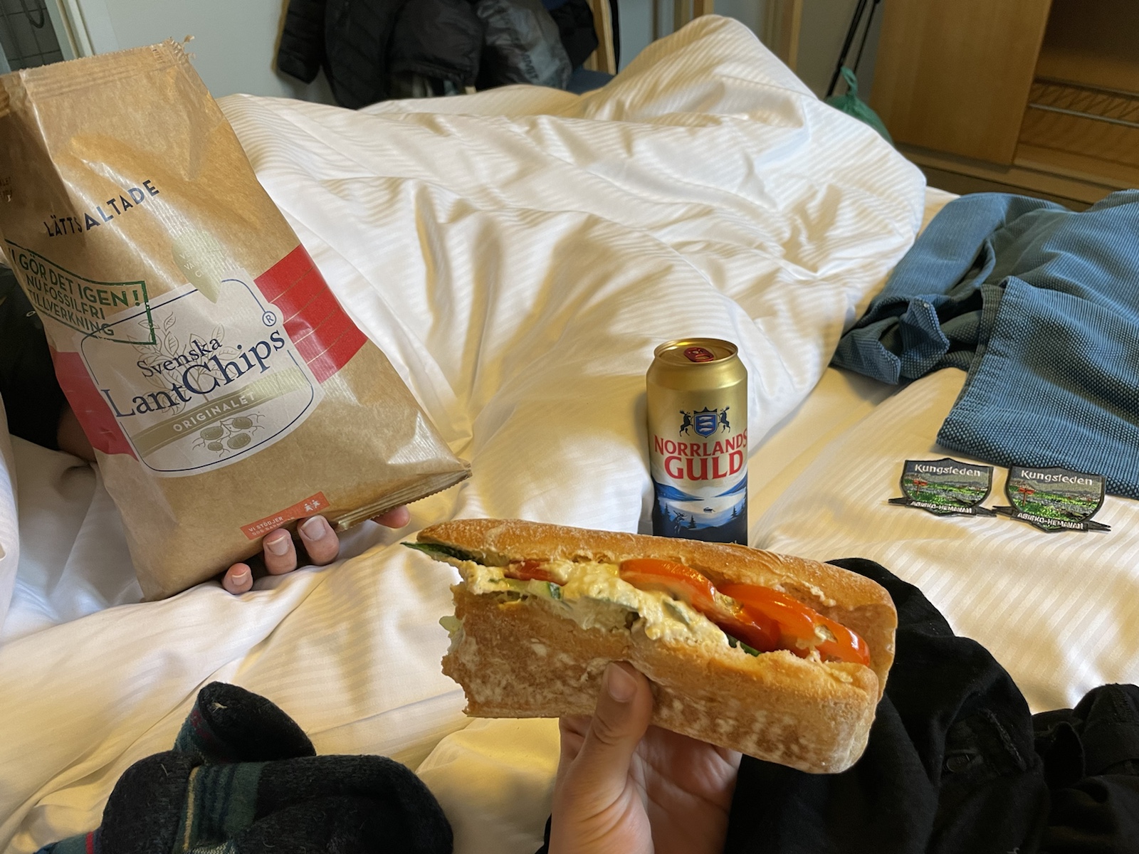 Die E-Mails werden geladen und eine meiner Hauptmotivationen, die Idee am Abend in Abisko in den Zug zu steigen, am nächsten Tag darin aufzuwachen und am frühen Nachmittag in Stockholm anzukommen, wird mir „genommen“. Die Schwedische Bahngesellschaft informiert mich per E-Mail darüber, dass unser Nachtzug ausfallen würde. Es wurden mir neue Tockets ausgestellt. Jetzt mussten wir um 12.30 Uhr bis 17.40 Uhr in einem Regionalzug fahren, dann auf einen Nachtzug umsteigen, aus dem wir um 7.00 Uhr umsteigen und in einen Zug nach Stockholm unsteigen müssen.