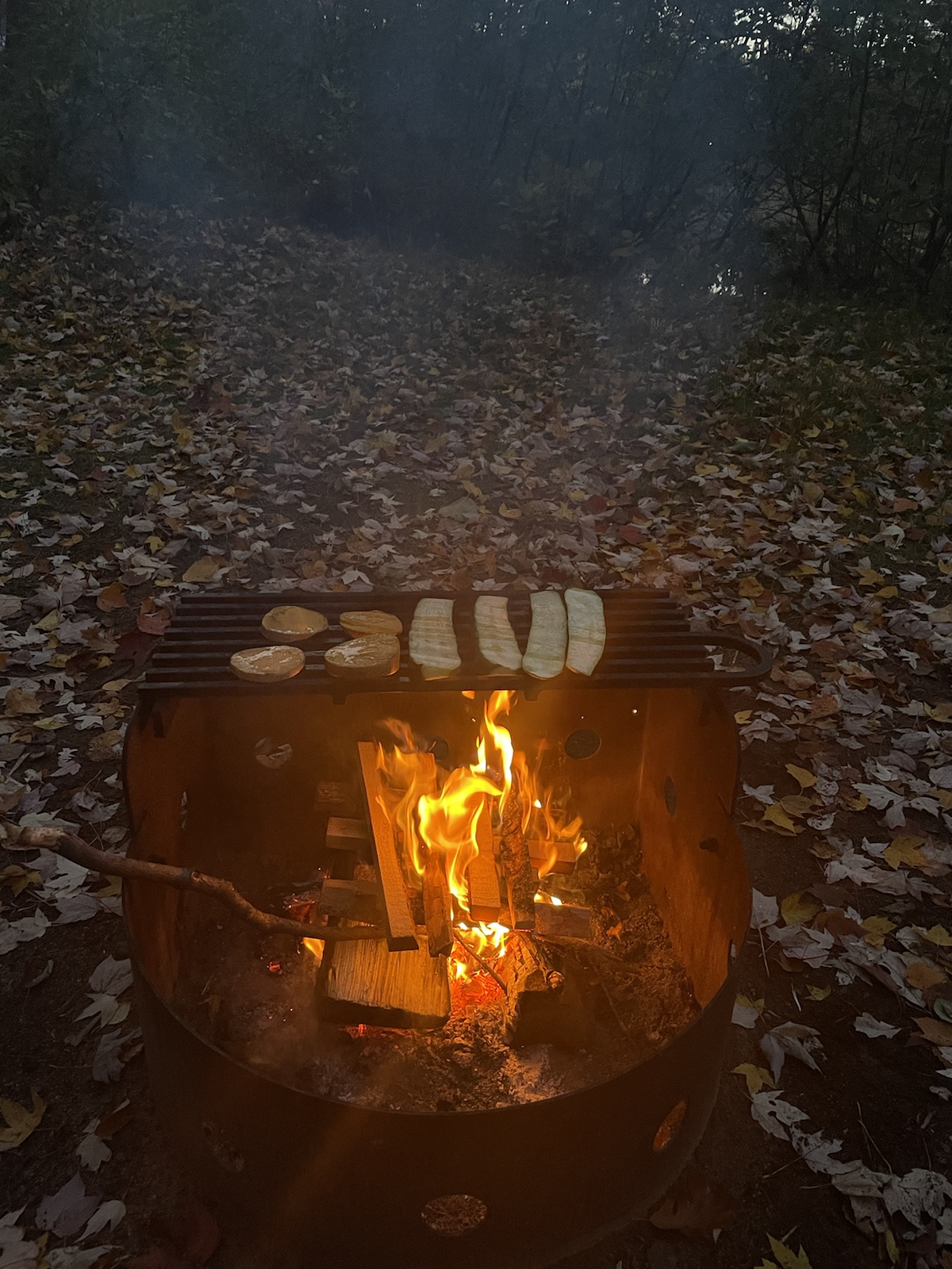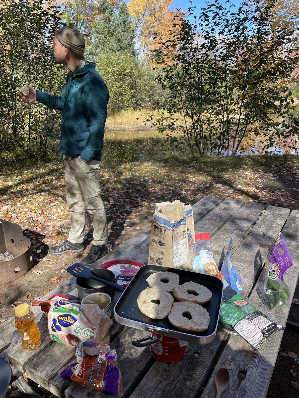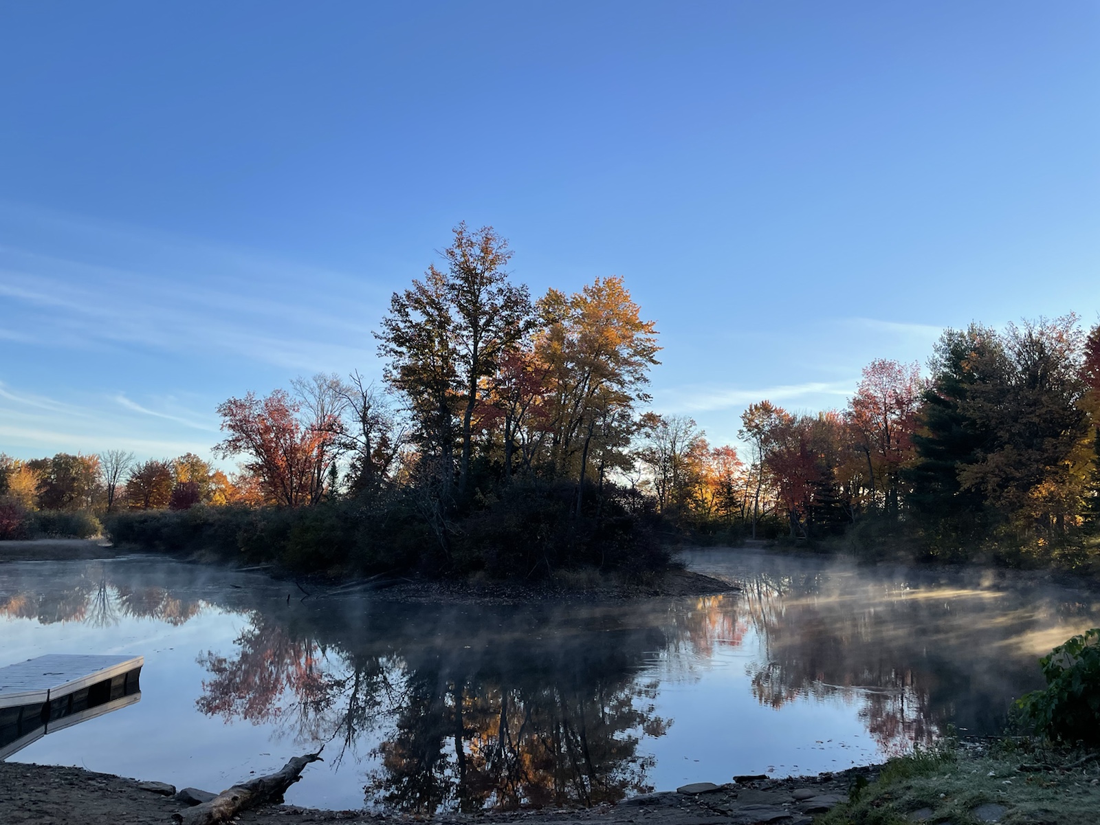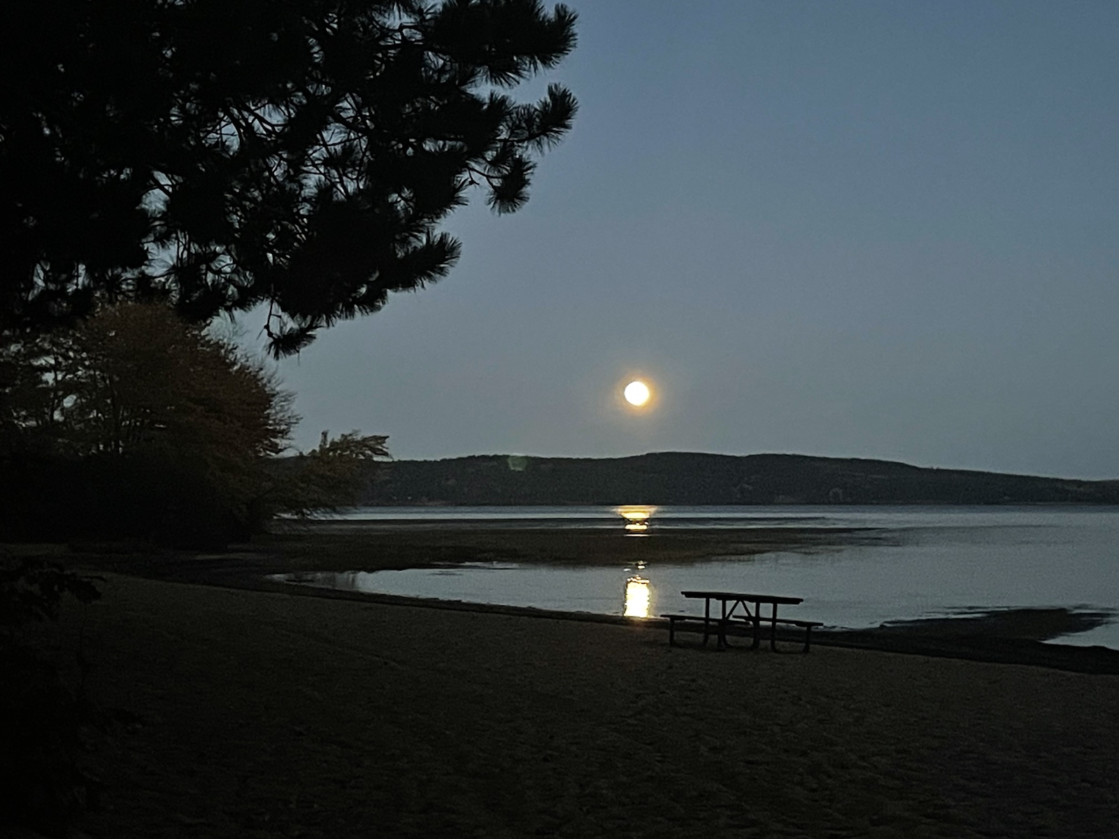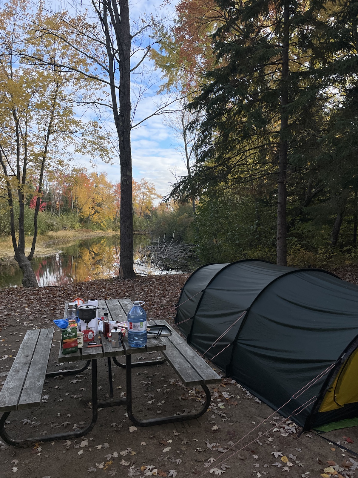 Unterwegs zum Bonnechere Provincial Park. In einem Supermarkt kauften wir erneut ein bischen frisches Gemüse und Früchte ein.Neben dem Supermarkt sahen wir einen Pizzaladen. Ich wollte, da hungrig, ein Slice Pizza kaufen, wie in NYC. Als wir den Laden betrate realisierten wir, dass es ein Restaurant war und wurden an einen Tisch gewiesen. Es hatte nur ganze Pizzen. Ich nahm die kleinste und Chrigi eine Medium (er hatte für den Rest des Tages keinen Hunger mehr, da seine Pizza mit Fleisch und Beilagen überladen war).Wir fuhren unterwegs an einem pittoresken kleinen Städtchen vorbei, in dem leider – da Thankgsgiving war – alle Läden geschlossen und die Strassen menschenleer waren.Wie immer kamen wir auch hier erst kurz vor Sonnenuntergang an (was jedoch, da die Sonne um 18.15 Uhr untergeht, nicht erstaundlich ist). Wunderschöner Platz an einem kleinen Fluss, der kurz weiter vorne in einen See fliesst.An diesem Abend ging der Vollmond orange und riesig auf.Der nächste Morgen war kühl, jedoch hatte es endlich keinen Wind mehr, weshalb wir endlich Kanufahren konnten. Etwas wovon ich seit wir entschieden hatten, nach Kanada zu gehen, geträumt hatte.Am morgen paddelten wir den Fluss entgegen der Strömung nach oben. Dort sah ich plötzlich, wie ein Ast in einer eigenartigen Geschwindigkeit die Strömung hinunterfloss. Ich fragte mich, ob die Strömung weiter vorne zunehmen würde, bis ich etwas braunes vorne am Ast entdeckte. Zuerst ein Panikmoment: Bär?? Es war jedoch ein Biber, der mit einem Ast im Mund an und vorbeischwamm. Was für ein Glück. Es war das erste man für uns beide, einen Biber zu sehen.Es ist etwas verschaukelt, da wir auf dem Kanu waren und ich auch nicht aufs Video, sondern auf den Biber schaute.Am Nachmittag begaben wir uns nach einer kurzen Mittagspause auf den See, wo wir zum ersten Mal seit Tagen warm hatten. Bei der Mündung zum See sagte Chrigi plötzlich Marie lueg. Ich schaute auf die Seite und sah zwei Waschbären am linken Mündungsufer entlanggehen. Wir konnten es beide nicht glauben, an einem Tag ein solches Glück zu haben und zwei Tierarten zu sehen.Man sieht sie nicht so gut und es ist etwas verschaukelt. Auf dem Video sehen sie etwas weiter entfehrnt aus, als in der Realität. Es war spektakulär.Der See war eigenartig, es war bis fast in die Mitte sehr seicht (zum Teil nur einen halben Meter tief) und sandig.Obligate heisse Schoggi.Diese Nacht war sehr kalt. Wir haben es beidi am Abend vor dem zu Bett gehen gemerkt, jedoch nicht in der Nacht. Am Morgen jedoch (als wir bei Minusgraden erwachten, hatte es Raureif).Es war zwar kalt (ich habe mit Habdschuhen das Frühstück vorbereitet), dafür hatte es leichten Nebel auf dem Wasser.Nach diesem Foto war mein Akku leer.Den wir später auf dem Weg nach Ottawa in einem Tim Hortons aufladeten.