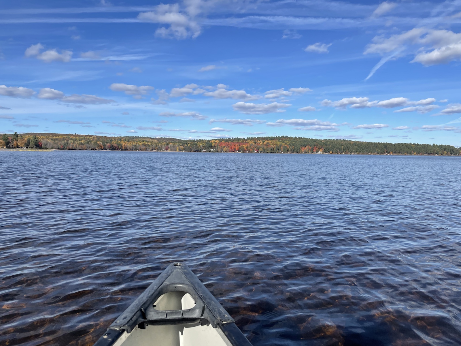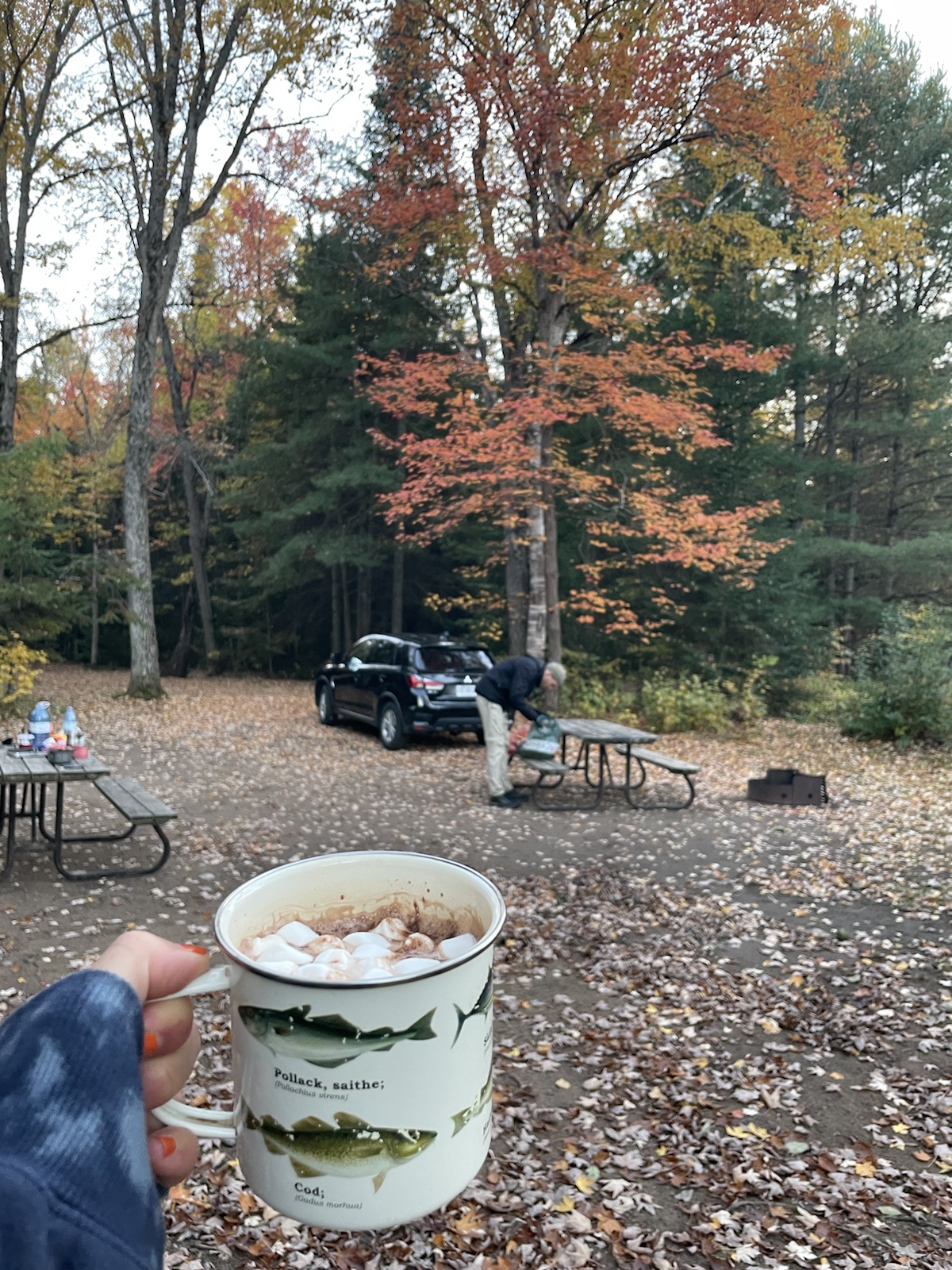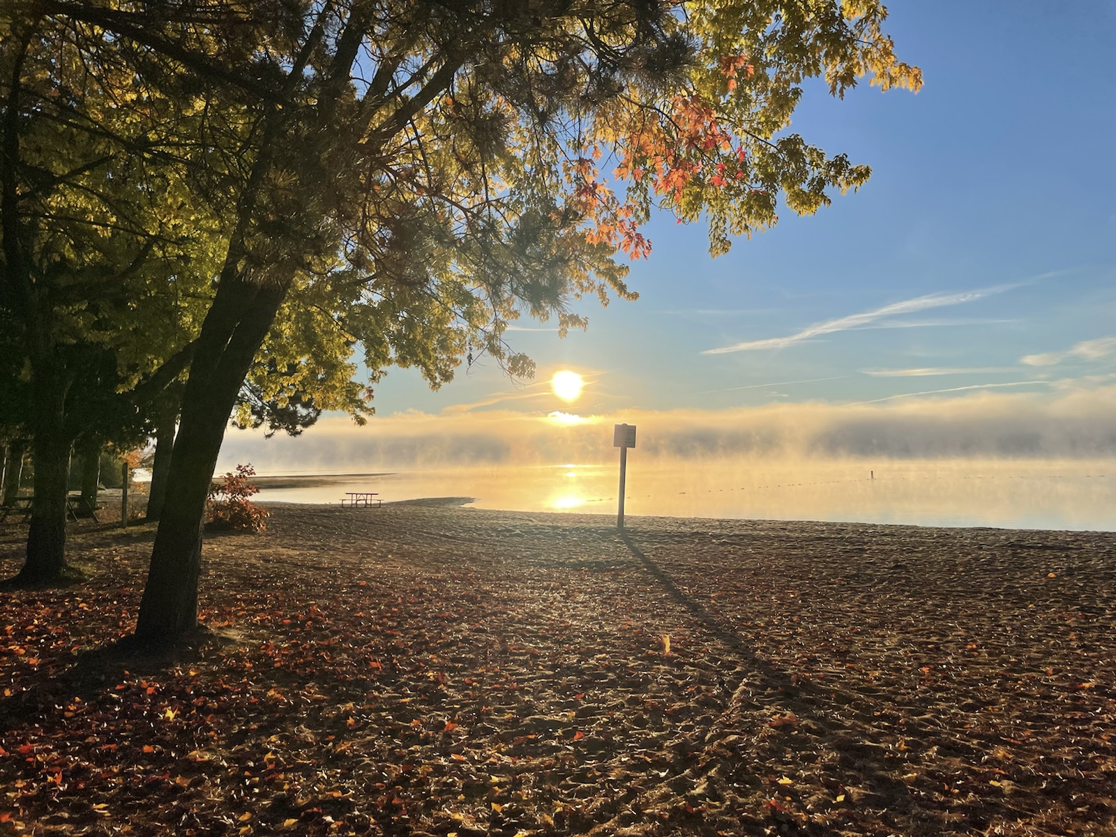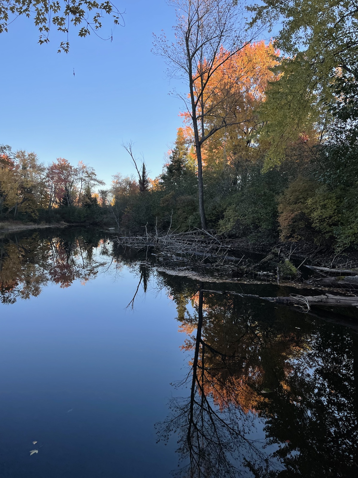 Unterwegs zum Bonnechere Provincial Park. In einem Supermarkt kauften wir erneut ein bischen frisches Gemüse und Früchte ein.Neben dem Supermarkt sahen wir einen Pizzaladen. Ich wollte, da hungrig, ein Slice Pizza kaufen, wie in NYC. Als wir den Laden betrate realisierten wir, dass es ein Restaurant war und wurden an einen Tisch gewiesen. Es hatte nur ganze Pizzen. Ich nahm die kleinste und Chrigi eine Medium (er hatte für den Rest des Tages keinen Hunger mehr, da seine Pizza mit Fleisch und Beilagen überladen war).Wir fuhren unterwegs an einem pittoresken kleinen Städtchen vorbei, in dem leider – da Thankgsgiving war – alle Läden geschlossen und die Strassen menschenleer waren.Wie immer kamen wir auch hier erst kurz vor Sonnenuntergang an (was jedoch, da die Sonne um 18.15 Uhr untergeht, nicht erstaundlich ist). Wunderschöner Platz an einem kleinen Fluss, der kurz weiter vorne in einen See fliesst.An diesem Abend ging der Vollmond orange und riesig auf.Der nächste Morgen war kühl, jedoch hatte es endlich keinen Wind mehr, weshalb wir endlich Kanufahren konnten. Etwas wovon ich seit wir entschieden hatten, nach Kanada zu gehen, geträumt hatte.Am morgen paddelten wir den Fluss entgegen der Strömung nach oben. Dort sah ich plötzlich, wie ein Ast in einer eigenartigen Geschwindigkeit die Strömung hinunterfloss. Ich fragte mich, ob die Strömung weiter vorne zunehmen würde, bis ich etwas braunes vorne am Ast entdeckte. Zuerst ein Panikmoment: Bär?? Es war jedoch ein Biber, der mit einem Ast im Mund an und vorbeischwamm. Was für ein Glück. Es war das erste man für uns beide, einen Biber zu sehen.Es ist etwas verschaukelt, da wir auf dem Kanu waren und ich auch nicht aufs Video, sondern auf den Biber schaute.Am Nachmittag begaben wir uns nach einer kurzen Mittagspause auf den See, wo wir zum ersten Mal seit Tagen warm hatten. Bei der Mündung zum See sagte Chrigi plötzlich Marie lueg. Ich schaute auf die Seite und sah zwei Waschbären am linken Mündungsufer entlanggehen. Wir konnten es beide nicht glauben, an einem Tag ein solches Glück zu haben und zwei Tierarten zu sehen.Man sieht sie nicht so gut und es ist etwas verschaukelt. Auf dem Video sehen sie etwas weiter entfehrnt aus, als in der Realität. Es war spektakulär.Der See war eigenartig, es war bis fast in die Mitte sehr seicht (zum Teil nur einen halben Meter tief) und sandig.Obligate heisse Schoggi.Diese Nacht war sehr kalt. Wir haben es beidi am Abend vor dem zu Bett gehen gemerkt, jedoch nicht in der Nacht. Am Morgen jedoch (als wir bei Minusgraden erwachten, hatte es Raureif).Es war zwar kalt (ich habe mit Habdschuhen das Frühstück vorbereitet), dafür hatte es leichten Nebel auf dem Wasser.Nach diesem Foto war mein Akku leer.Den wir später auf dem Weg nach Ottawa in einem Tim Hortons aufladeten.