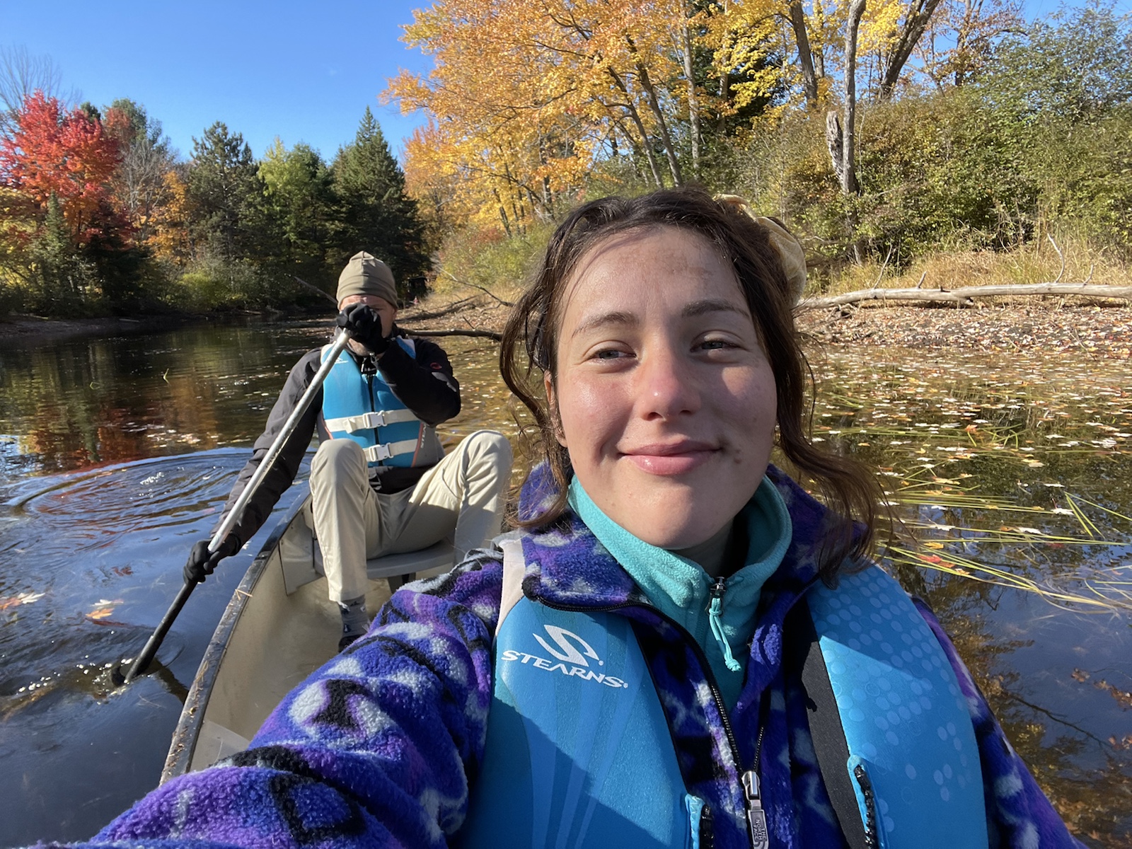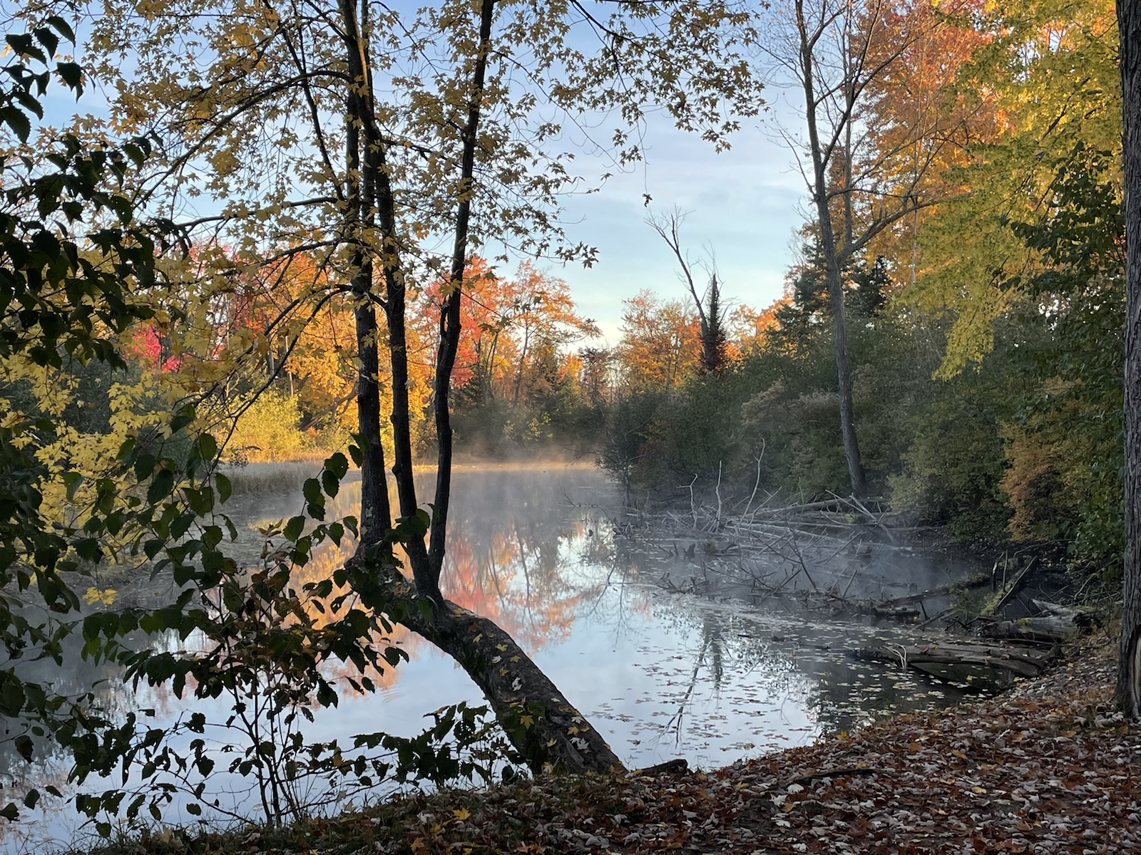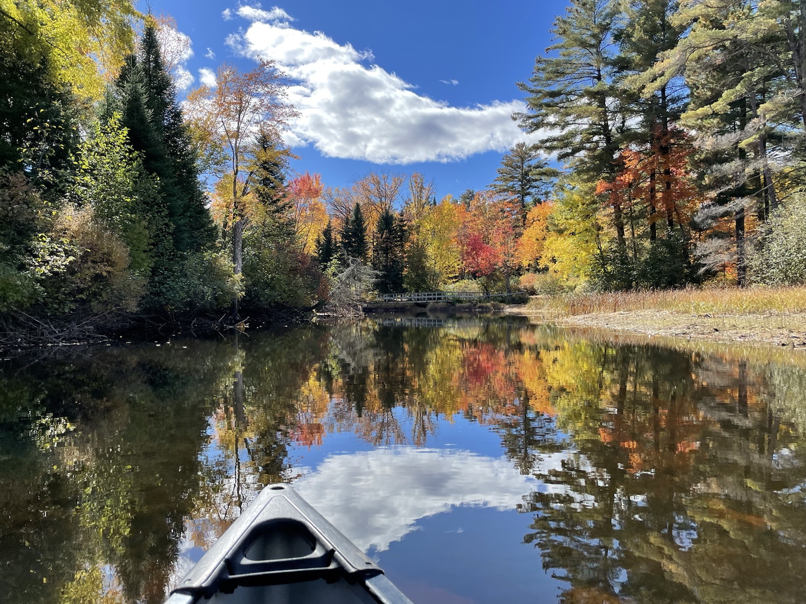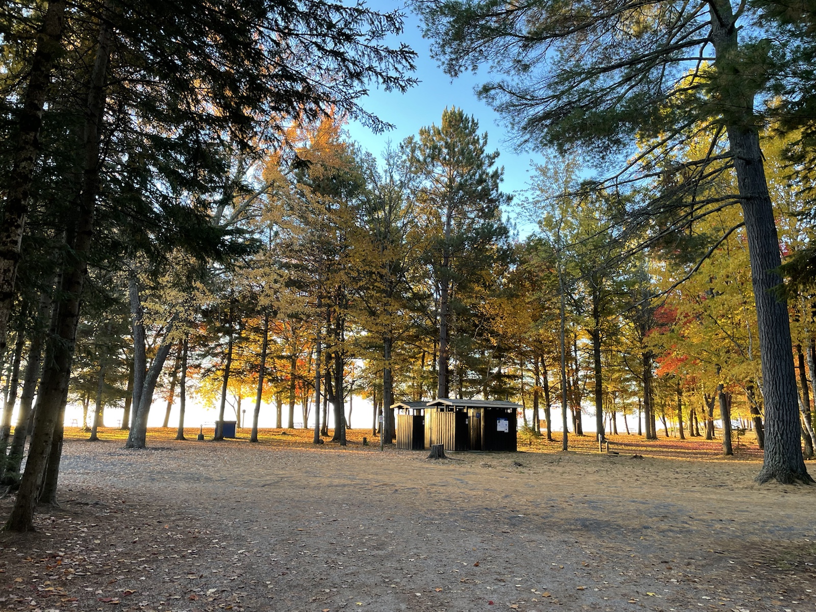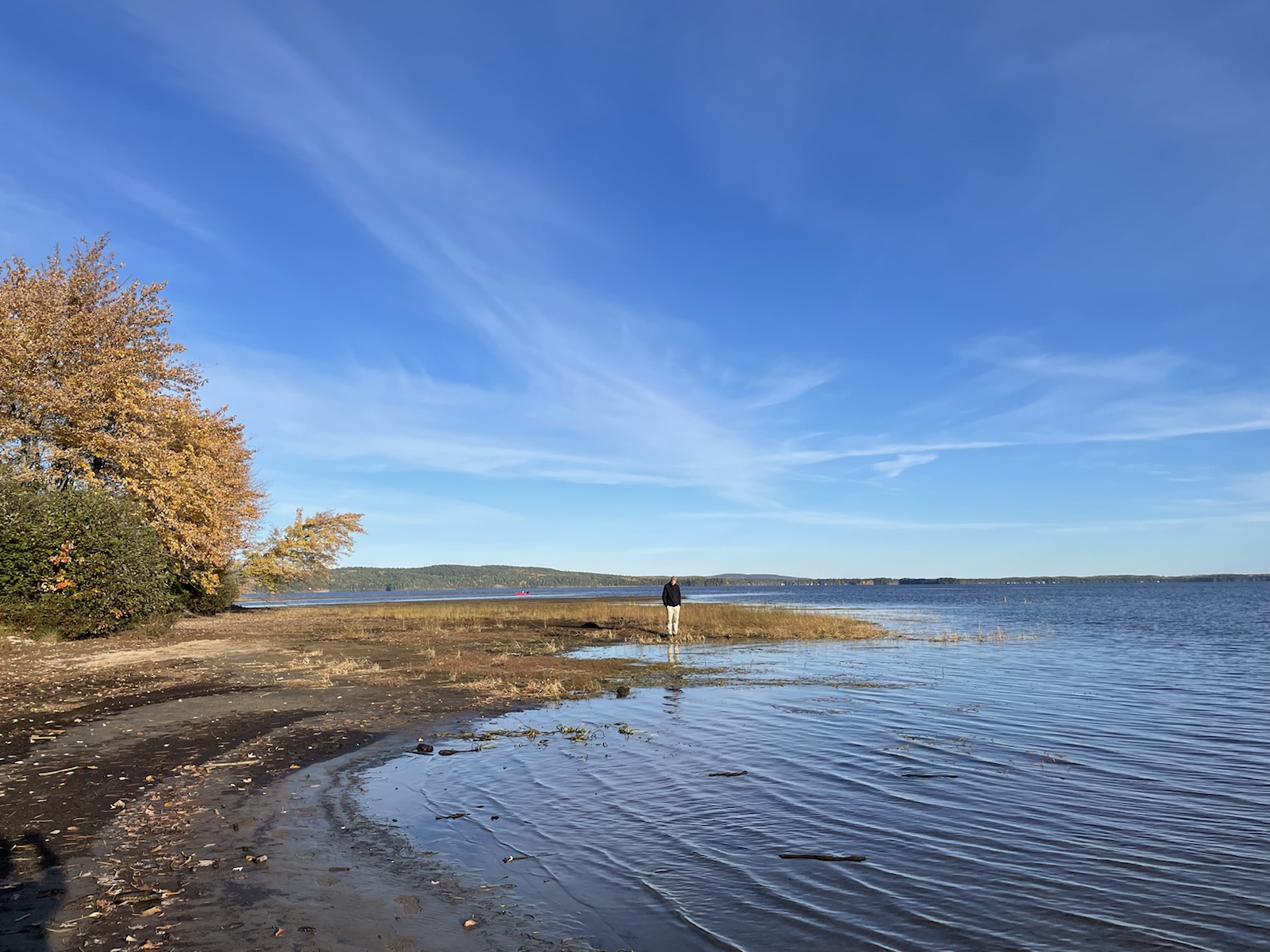 Unterwegs zum Bonnechere Provincial Park. In einem Supermarkt kauften wir erneut ein bischen frisches Gemüse und Früchte ein.Neben dem Supermarkt sahen wir einen Pizzaladen. Ich wollte, da hungrig, ein Slice Pizza kaufen, wie in NYC. Als wir den Laden betrate realisierten wir, dass es ein Restaurant war und wurden an einen Tisch gewiesen. Es hatte nur ganze Pizzen. Ich nahm die kleinste und Chrigi eine Medium (er hatte für den Rest des Tages keinen Hunger mehr, da seine Pizza mit Fleisch und Beilagen überladen war).Wir fuhren unterwegs an einem pittoresken kleinen Städtchen vorbei, in dem leider – da Thankgsgiving war – alle Läden geschlossen und die Strassen menschenleer waren.Wie immer kamen wir auch hier erst kurz vor Sonnenuntergang an (was jedoch, da die Sonne um 18.15 Uhr untergeht, nicht erstaundlich ist). Wunderschöner Platz an einem kleinen Fluss, der kurz weiter vorne in einen See fliesst.An diesem Abend ging der Vollmond orange und riesig auf.Der nächste Morgen war kühl, jedoch hatte es endlich keinen Wind mehr, weshalb wir endlich Kanufahren konnten. Etwas wovon ich seit wir entschieden hatten, nach Kanada zu gehen, geträumt hatte.Am morgen paddelten wir den Fluss entgegen der Strömung nach oben. Dort sah ich plötzlich, wie ein Ast in einer eigenartigen Geschwindigkeit die Strömung hinunterfloss. Ich fragte mich, ob die Strömung weiter vorne zunehmen würde, bis ich etwas braunes vorne am Ast entdeckte. Zuerst ein Panikmoment: Bär?? Es war jedoch ein Biber, der mit einem Ast im Mund an und vorbeischwamm. Was für ein Glück. Es war das erste man für uns beide, einen Biber zu sehen.Es ist etwas verschaukelt, da wir auf dem Kanu waren und ich auch nicht aufs Video, sondern auf den Biber schaute.Am Nachmittag begaben wir uns nach einer kurzen Mittagspause auf den See, wo wir zum ersten Mal seit Tagen warm hatten. Bei der Mündung zum See sagte Chrigi plötzlich Marie lueg. Ich schaute auf die Seite und sah zwei Waschbären am linken Mündungsufer entlanggehen. Wir konnten es beide nicht glauben, an einem Tag ein solches Glück zu haben und zwei Tierarten zu sehen.Man sieht sie nicht so gut und es ist etwas verschaukelt. Auf dem Video sehen sie etwas weiter entfehrnt aus, als in der Realität. Es war spektakulär.Der See war eigenartig, es war bis fast in die Mitte sehr seicht (zum Teil nur einen halben Meter tief) und sandig.Obligate heisse Schoggi.Diese Nacht war sehr kalt. Wir haben es beidi am Abend vor dem zu Bett gehen gemerkt, jedoch nicht in der Nacht. Am Morgen jedoch (als wir bei Minusgraden erwachten, hatte es Raureif).Es war zwar kalt (ich habe mit Habdschuhen das Frühstück vorbereitet), dafür hatte es leichten Nebel auf dem Wasser.Nach diesem Foto war mein Akku leer.Den wir später auf dem Weg nach Ottawa in einem Tim Hortons aufladeten.