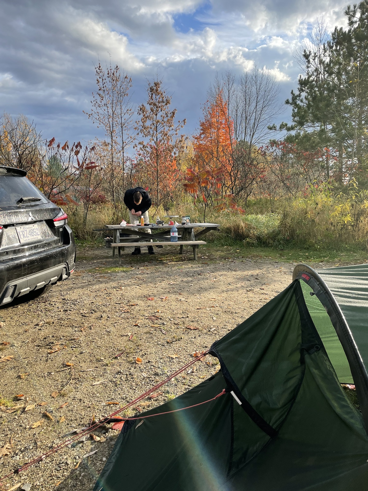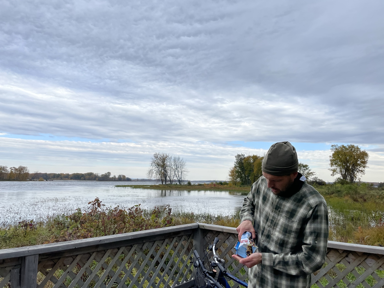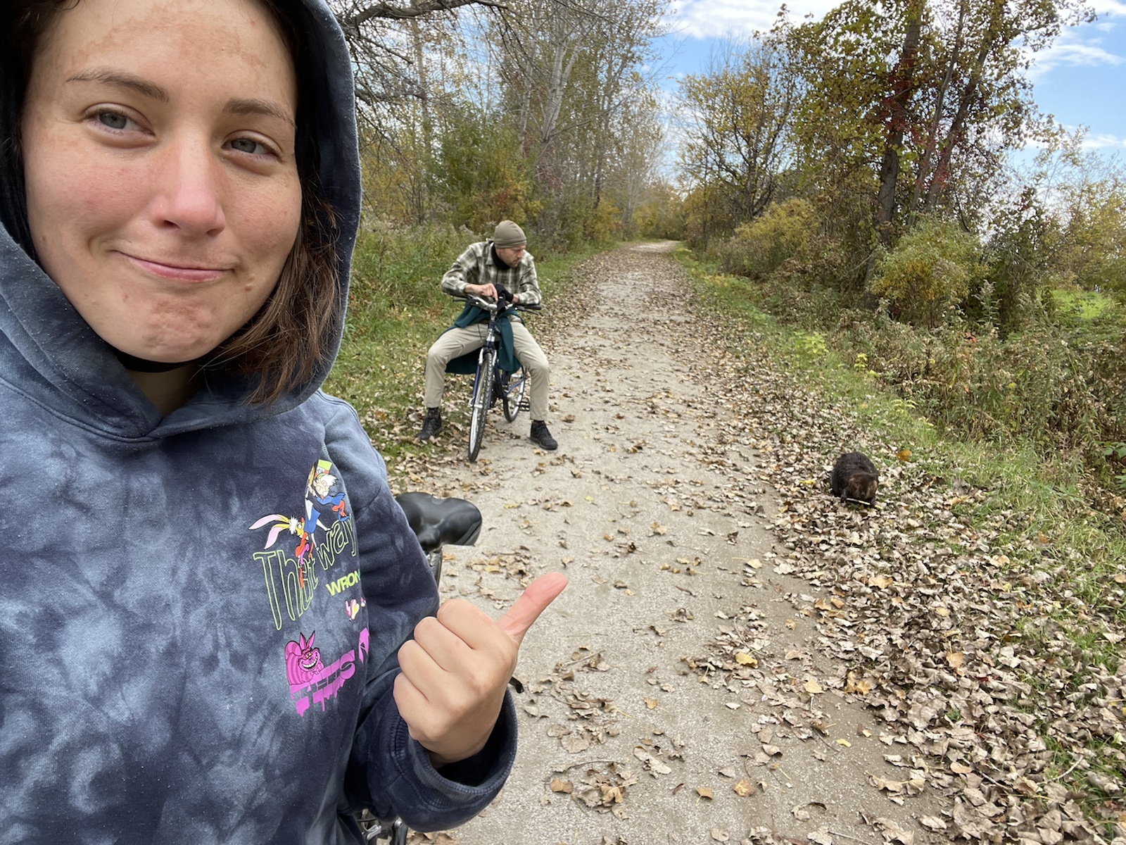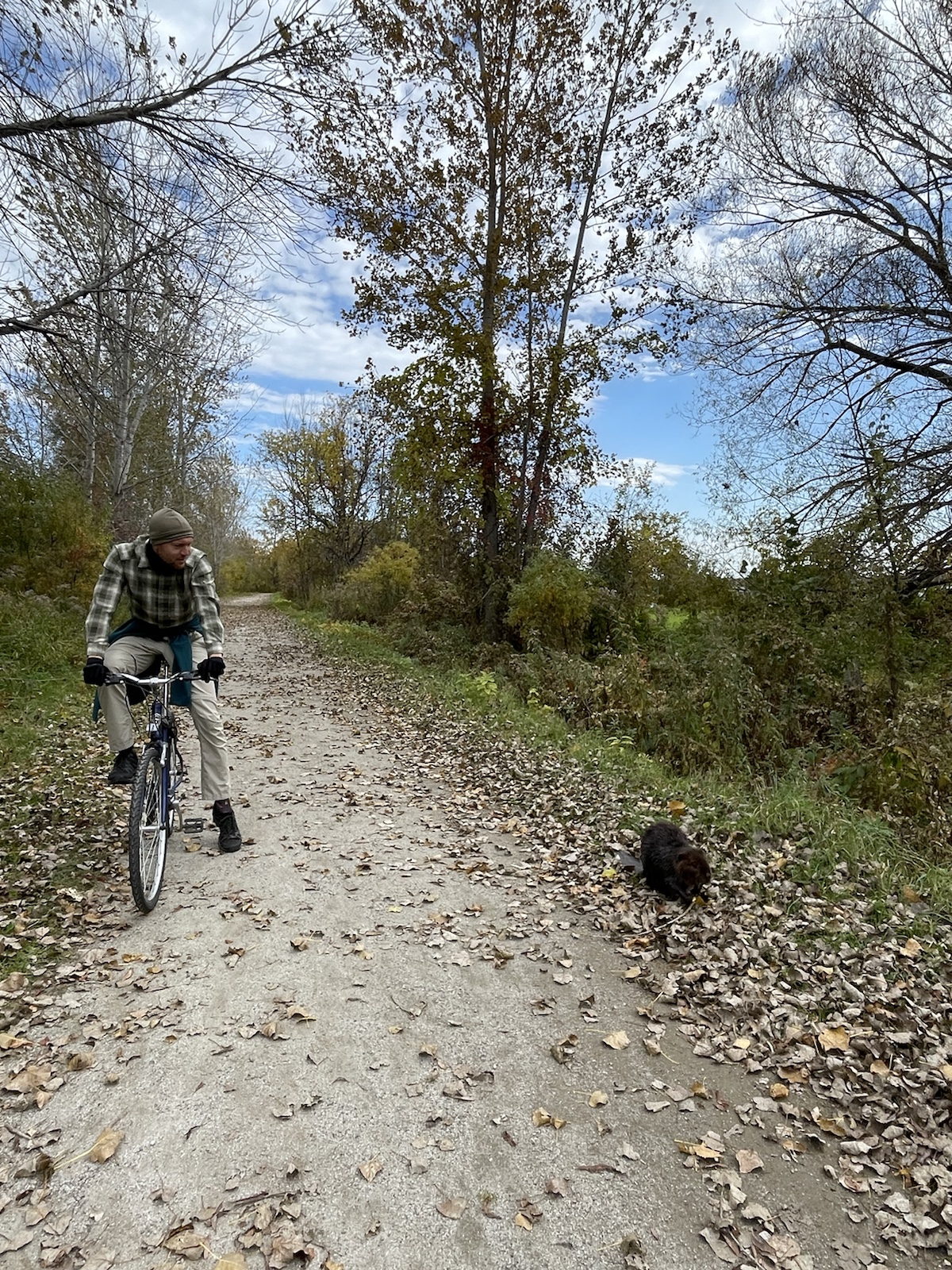 Am dritten Morgen wachten wir mit bewölktem Himmel auf. Am Vortag hatten wir beschlossen, für den zweiten Tag ein Fahrrad zu mieten, um weitere Teile des Parks zu besuchen.In diesem Park hörten wir die ganze Zeit, auch Nachts, Kanadagänse. Am Tag flogen sie dann teilweise in kleinen, aber auch in grossen Gruppen über unsere Köpfe.Unterwegs sahen wir von weitem einen kleinen braunen Punkt. Ich hatte kurz Angst, es könnte sich dabei um einen jungen Bären handeln (wo ist die Mutter?). Beim Näherkommen glaubten wir, es handle sich womöglich um einen Waschbären. Es war jedoch ein Biber. Nachdem wir bereits vor ein paar Tagen einen im Wasser gesehen hatten, konnten wir unser Glück kaum fassen. Der Biber sah und kurz an und widmete sich daraufhin wieder dem Ast, von dem er die Rinde verspies. Wir konnten ihn lange beobachten, da er sich durch uns überhaupt nicht gestört fühlte.Biberfans. Irgendwann kamen zwei weitere Fahrradfahrer hinzu. Der Biber sah sie an, sah uns an und hatte wohl genug, da er daraufhin langsam davontrottete.Auf diesem Foto sieht es aus, als würde der Himmel brennen. Es war ein schöner Sonnenuntergang, jedoch nicht so spektakulär wie auf dem Foto.Währen wir unser Abendfeuer entfachten und kochten, kam einer unserer Nachbarn und erkundigte sich, ob wir Holz benötigten, da er zu viel Holz habe, würde er uns gerne davon abgeben. Die Nationalparks (ausser diejenigen die das ganze Jahr über geöffnet haben) würden am Folgetag (dem 16. Oktober) schliessen. Wir nahmen das Angebot gerne an und konnten mit seinem Holz ein (fast zu) grosses Feuer entfachen. Wir haben jedoch nicht das ganze Holz gebraucht, da einzelte Holzstücke Lack und Leim hatten. Dank diesem Mann konnten wir an einem kühlen Abend lange draussen bleiben und die Wärme geniessen.
