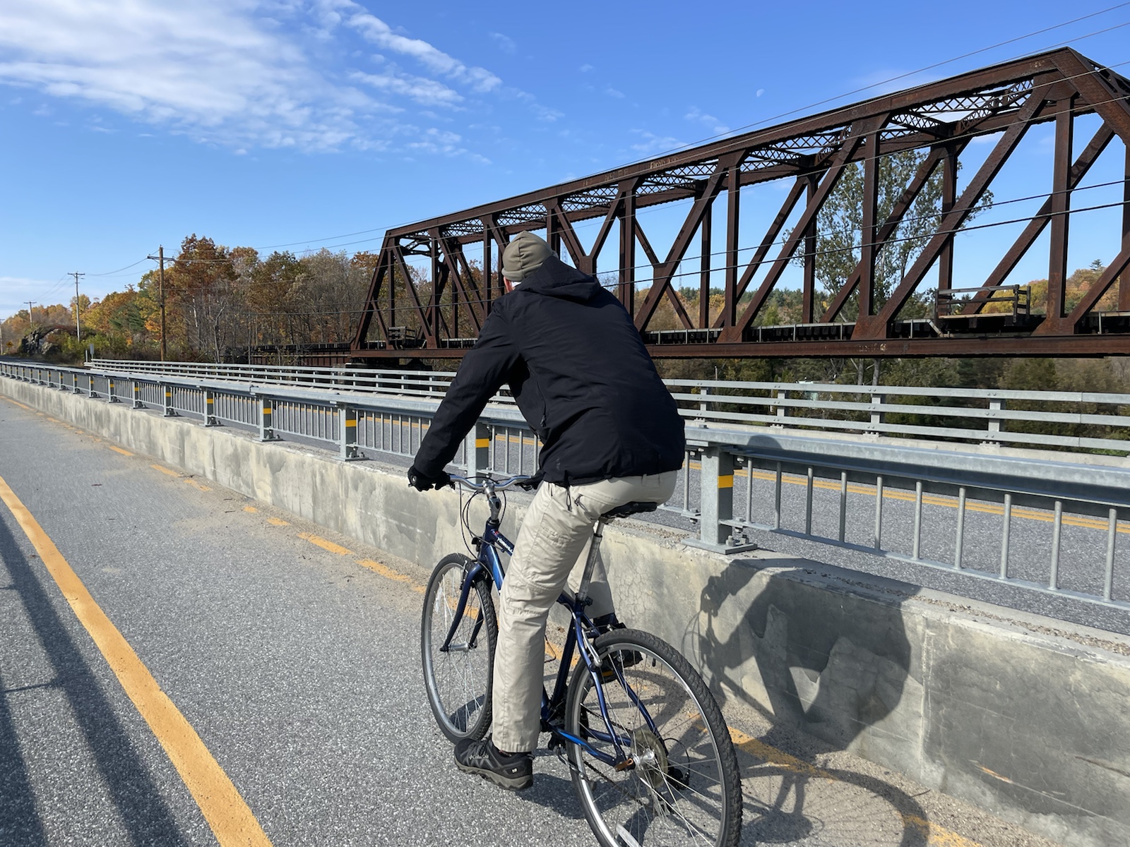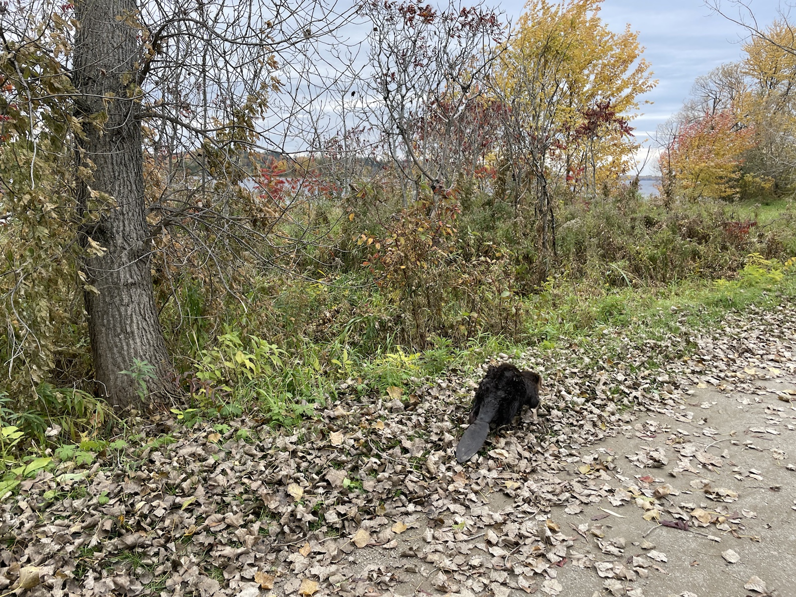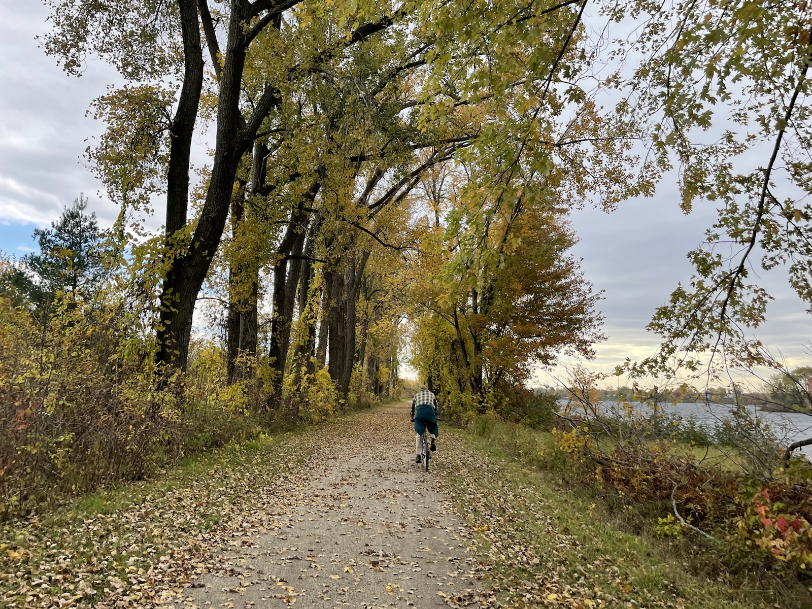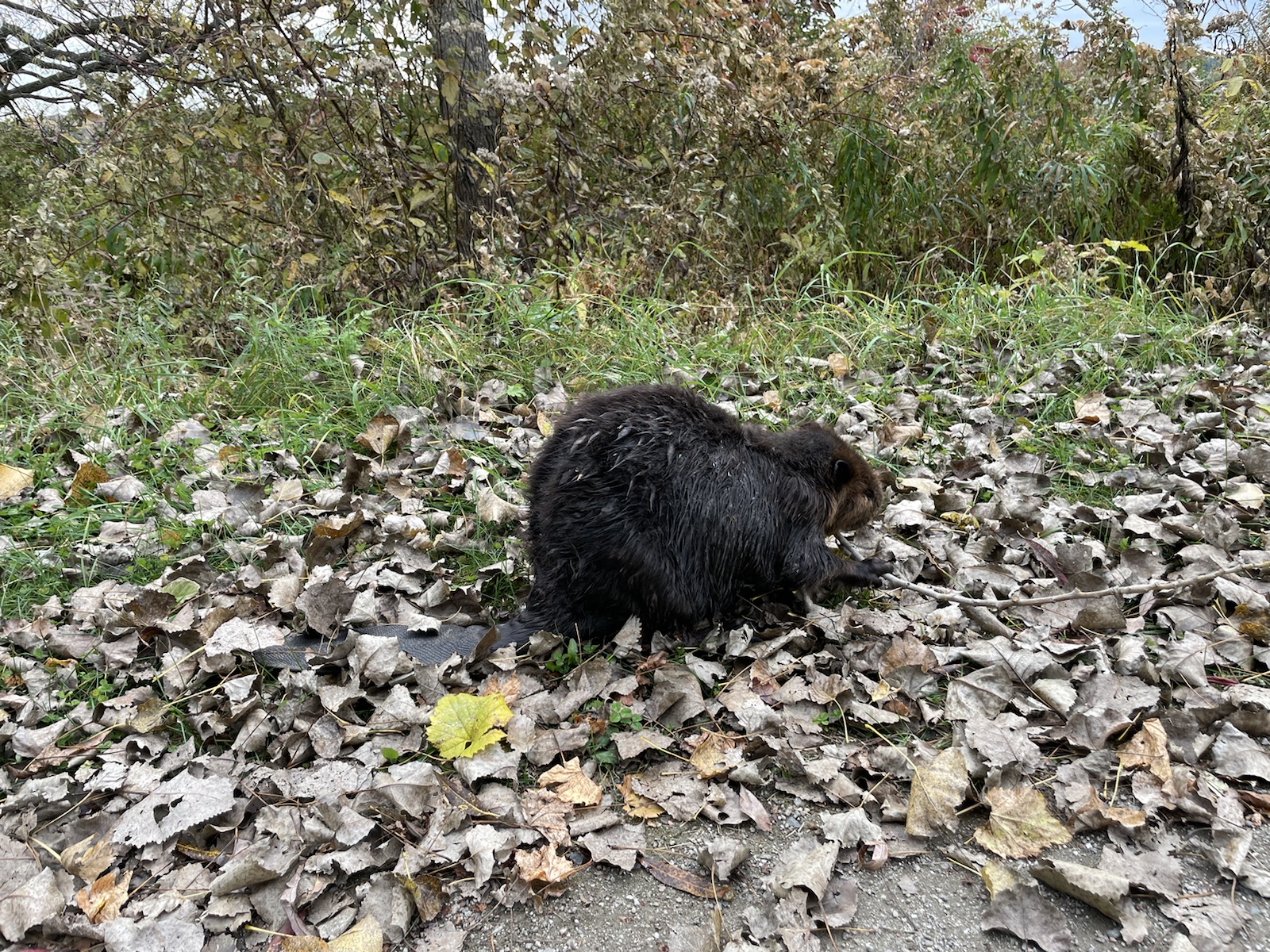 Am dritten Morgen wachten wir mit bewölktem Himmel auf. Am Vortag hatten wir beschlossen, für den zweiten Tag ein Fahrrad zu mieten, um weitere Teile des Parks zu besuchen.In diesem Park hörten wir die ganze Zeit, auch Nachts, Kanadagänse. Am Tag flogen sie dann teilweise in kleinen, aber auch in grossen Gruppen über unsere Köpfe.Unterwegs sahen wir von weitem einen kleinen braunen Punkt. Ich hatte kurz Angst, es könnte sich dabei um einen jungen Bären handeln (wo ist die Mutter?). Beim Näherkommen glaubten wir, es handle sich womöglich um einen Waschbären. Es war jedoch ein Biber. Nachdem wir bereits vor ein paar Tagen einen im Wasser gesehen hatten, konnten wir unser Glück kaum fassen. Der Biber sah und kurz an und widmete sich daraufhin wieder dem Ast, von dem er die Rinde verspies. Wir konnten ihn lange beobachten, da er sich durch uns überhaupt nicht gestört fühlte.Biberfans. Irgendwann kamen zwei weitere Fahrradfahrer hinzu. Der Biber sah sie an, sah uns an und hatte wohl genug, da er daraufhin langsam davontrottete.Auf diesem Foto sieht es aus, als würde der Himmel brennen. Es war ein schöner Sonnenuntergang, jedoch nicht so spektakulär wie auf dem Foto.Währen wir unser Abendfeuer entfachten und kochten, kam einer unserer Nachbarn und erkundigte sich, ob wir Holz benötigten, da er zu viel Holz habe, würde er uns gerne davon abgeben. Die Nationalparks (ausser diejenigen die das ganze Jahr über geöffnet haben) würden am Folgetag (dem 16. Oktober) schliessen. Wir nahmen das Angebot gerne an und konnten mit seinem Holz ein (fast zu) grosses Feuer entfachen. Wir haben jedoch nicht das ganze Holz gebraucht, da einzelte Holzstücke Lack und Leim hatten. Dank diesem Mann konnten wir an einem kühlen Abend lange draussen bleiben und die Wärme geniessen.
