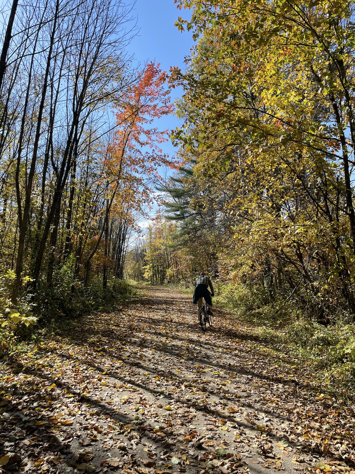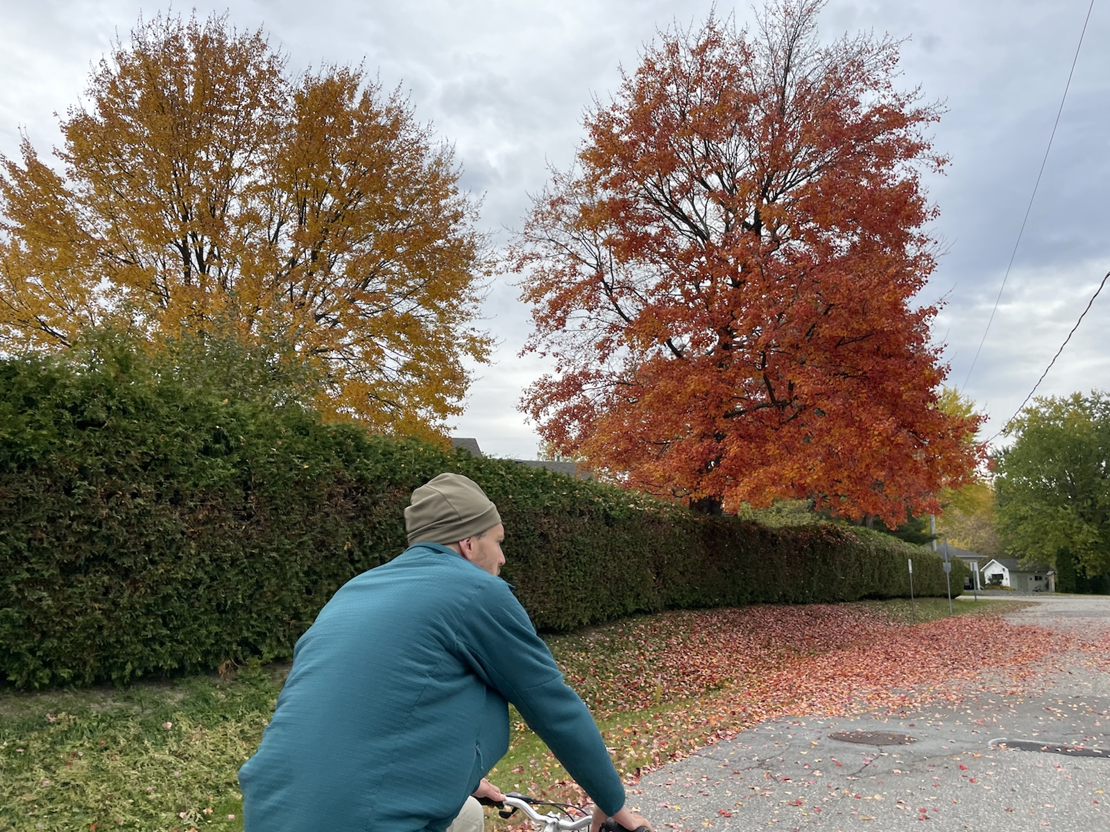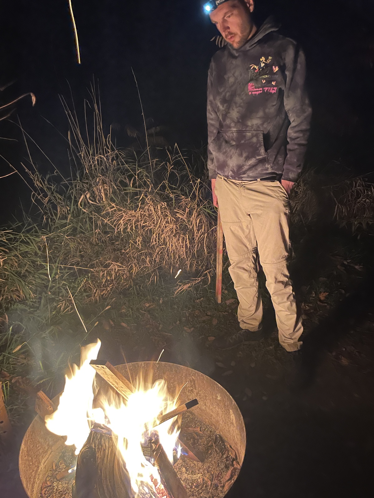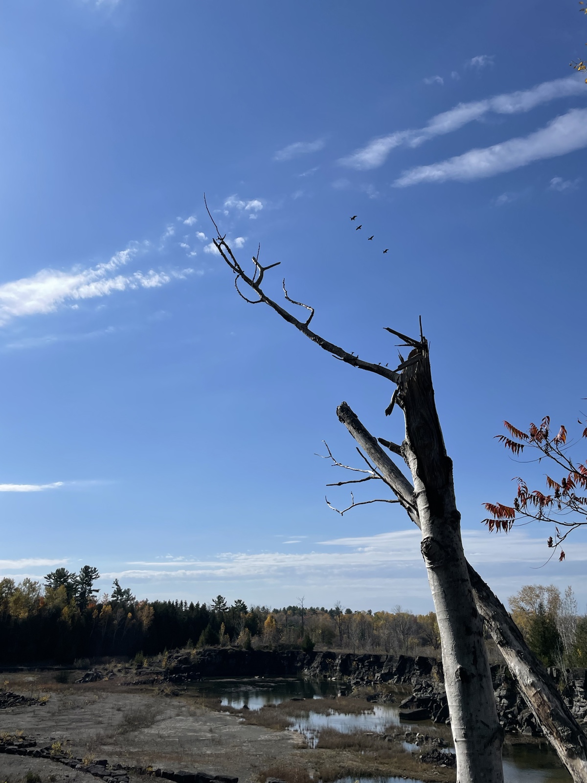 Am dritten Morgen wachten wir mit bewölktem Himmel auf. Am Vortag hatten wir beschlossen, für den zweiten Tag ein Fahrrad zu mieten, um weitere Teile des Parks zu besuchen.In diesem Park hörten wir die ganze Zeit, auch Nachts, Kanadagänse. Am Tag flogen sie dann teilweise in kleinen, aber auch in grossen Gruppen über unsere Köpfe.Unterwegs sahen wir von weitem einen kleinen braunen Punkt. Ich hatte kurz Angst, es könnte sich dabei um einen jungen Bären handeln (wo ist die Mutter?). Beim Näherkommen glaubten wir, es handle sich womöglich um einen Waschbären. Es war jedoch ein Biber. Nachdem wir bereits vor ein paar Tagen einen im Wasser gesehen hatten, konnten wir unser Glück kaum fassen. Der Biber sah und kurz an und widmete sich daraufhin wieder dem Ast, von dem er die Rinde verspies. Wir konnten ihn lange beobachten, da er sich durch uns überhaupt nicht gestört fühlte.Biberfans. Irgendwann kamen zwei weitere Fahrradfahrer hinzu. Der Biber sah sie an, sah uns an und hatte wohl genug, da er daraufhin langsam davontrottete.Auf diesem Foto sieht es aus, als würde der Himmel brennen. Es war ein schöner Sonnenuntergang, jedoch nicht so spektakulär wie auf dem Foto.Währen wir unser Abendfeuer entfachten und kochten, kam einer unserer Nachbarn und erkundigte sich, ob wir Holz benötigten, da er zu viel Holz habe, würde er uns gerne davon abgeben. Die Nationalparks (ausser diejenigen die das ganze Jahr über geöffnet haben) würden am Folgetag (dem 16. Oktober) schliessen. Wir nahmen das Angebot gerne an und konnten mit seinem Holz ein (fast zu) grosses Feuer entfachen. Wir haben jedoch nicht das ganze Holz gebraucht, da einzelte Holzstücke Lack und Leim hatten. Dank diesem Mann konnten wir an einem kühlen Abend lange draussen bleiben und die Wärme geniessen.