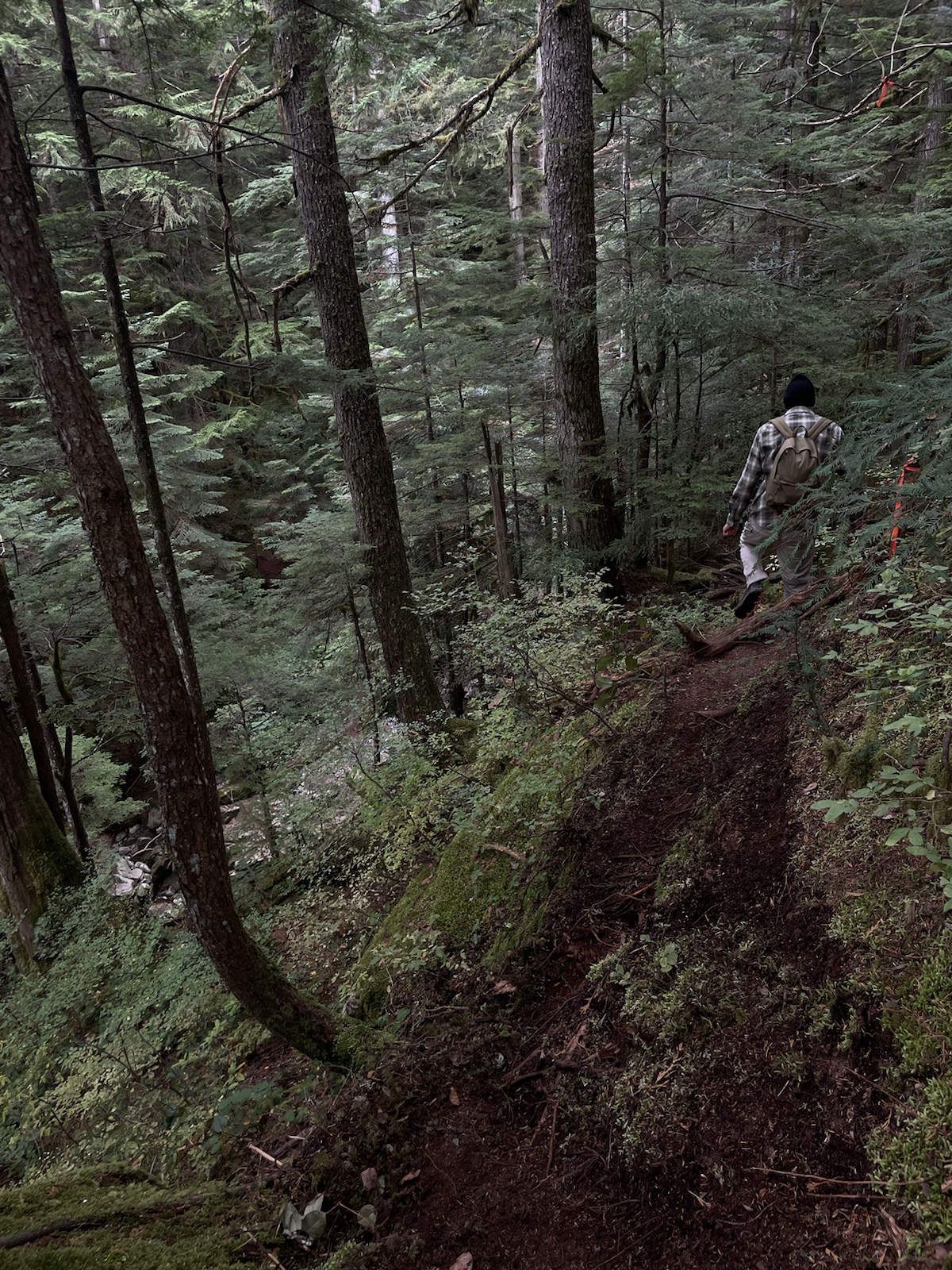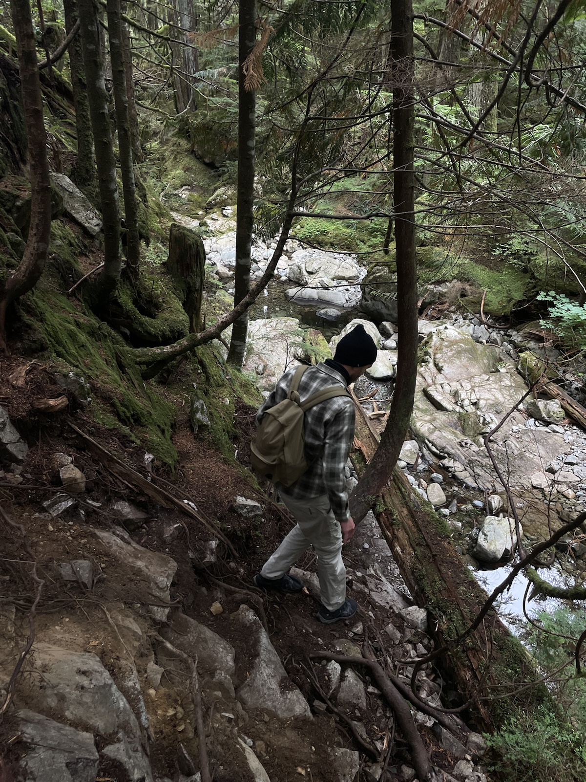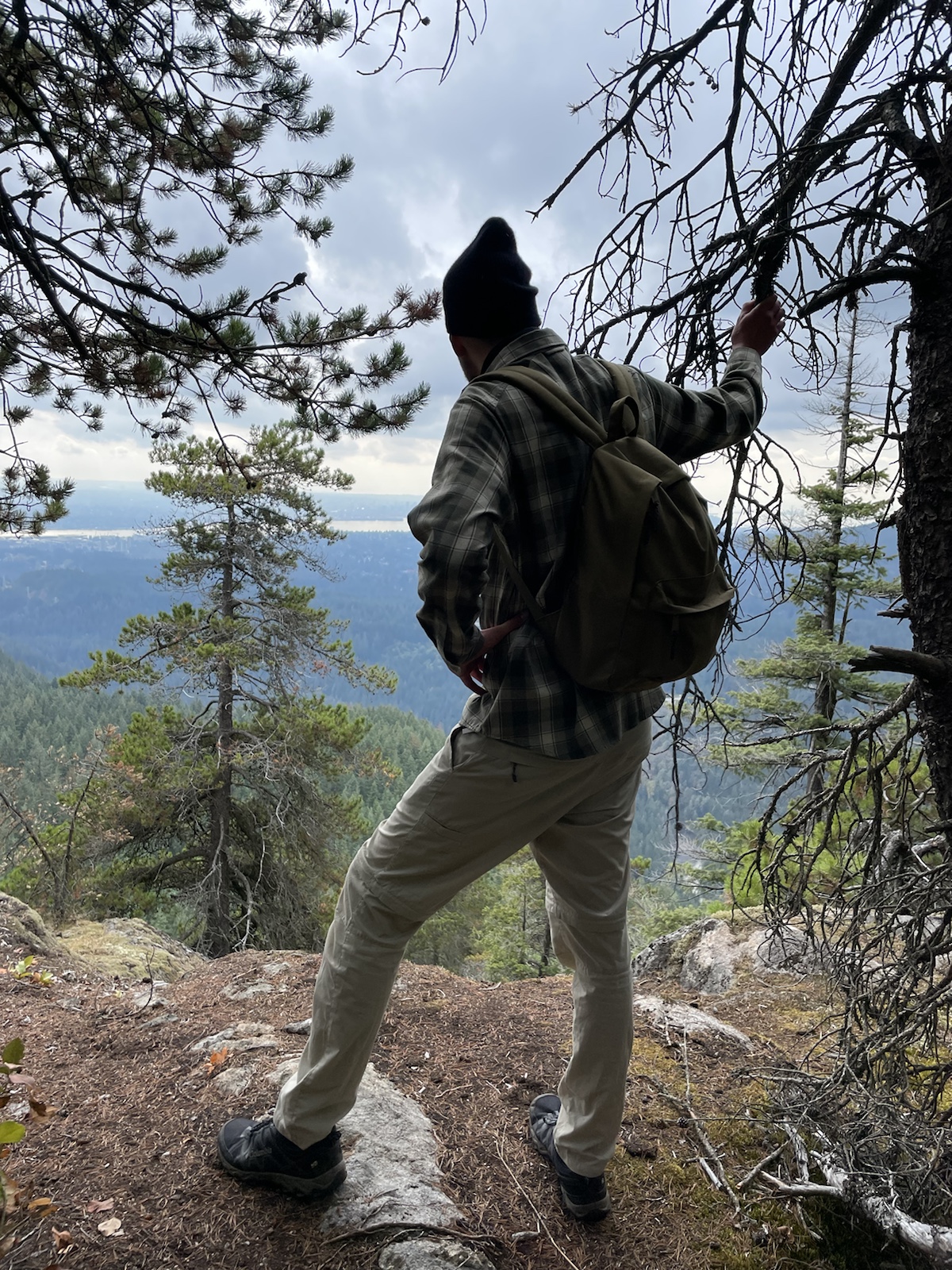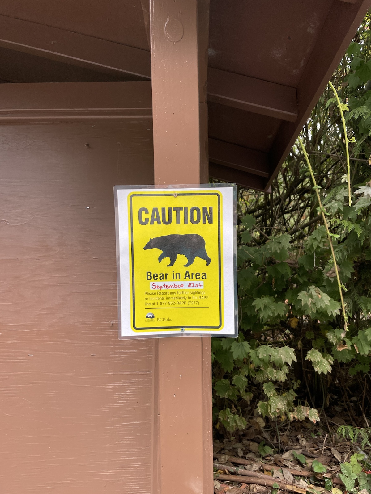 Vor der (ungefähr) geplanten Wanderung (mithilfe der App AllTrails, die ich jetzt eigentlich immer nutze, da man darauf jeden Wanderweg sehen kann), gingen wir zunächst zum Safeway. Dort kal es zu einem Kräftemessen, zwischen zwei grossen Geschöpfen.Beim Eingang zur Wanderung, fand ich diese beruhigende Mitteilung, welche nicht dazu geführt hat, dass ich mich den ganzen Tag panisch umgesehen und mich kaum getraute, Essen aus dem Rucksack zu nehmen.Der Wald war offenbar bei Mountainbikern sehr beliebt und irgendwie haben wir es geschafft (da ich den direktesten Weg bergauf gewählt hatte), auf einem Mountainbikeweg zu landen. Zweimal wurde ich fast überfahrten, weshalb Chrigi fortan vor mir ging.Irgendwann ging es nach links in Richtung des „devils Peak“. Der Weg wurde von einem stark ausgetretenen Pfad immer wilder.Immer wieder kamen wir an Spuren vergangener Menschen im Wald.Chrigi nahm ab, es handle sich dabei um alte Gegenstände von Holzfällern. Teilweise bestand der Weg aus ziemlich vermoderten Holzplanken. Wir machten, aus Angst einzubrechen, einen grossen Bogen um diese.Abgesehen von diesem kleinen Unterbruch, gingen wir nonstop (und unerwartet weit) durch Wald. Der devils peak hätte eigentlich eine Aussicht auf Vancouver bieten sollen. Jedoch ging es ziemlich lange Zeit einbach steil bergauf, dann bergab und dichter Wald umgab uns. Kurz bevor wir labgsam zum Rand kamen, wo die Aussicht kommen würde, überlegten wir uns ernsthaft, umzukehren, weil ich ziemlich erschöpft und wir beide hungrig waren.Zum Glück haben wir nicht aufgegeben.Wir wurden nämlich mit einer wunderschönen Aussicht belohnt, welche wir mit niemandem teilen mussten. Man sah auf das Downtown und auch aufs Meer. Bei dieser Aussicht assen wir Snacks (wobei ich immer nervös hinter mich schaute).Auf dem Rückweg wollte ich elnen anderen Weg nehmen, da der Hinweg teilweise ziemlich wild gewesen war und ich glaubte, es könnte eine Abkürzung sein.War es natürlich nicht.Wir merkten irgendwann, dass wir ein gewisses Tempo beibehalten müssen, da wir nicht mehr so viel Tageslicht haben würde. Zum Glück hatte ich vorsorglich unsere Tascheblampe mitgenommen.Und wieder landeten wir auf einem Weg, der wohl mehrheitlich von Bikern genutzt wurde.Diese Baum erinnerte mich stark an ein Hochhaus, welches wir am Vortag in der Innenstadt gesehen hatten.Und plötzlich trafen wir wieder auf Menschen und fer Weg wurde breiter und die Ahornblätter grösser.Meine Hände waren von dwe kälte etwas angeschwollen und fühlten sich steif an.Etwas unterkühlt und sehr erschöpft kamen wir schliesslich wieder beim Safeway an und kauften und Tees im Starbucks, der sich im Safeway befand. Ausserdem kauften wir eine pumpkin Pie, einfach, weil ich unbedingt eine probieren wollte. Unfallmässig hatten wir eine ziemlich lange Wanderung gemacht. Jedoch hat sich diese auf jeden Fall gelohnt.