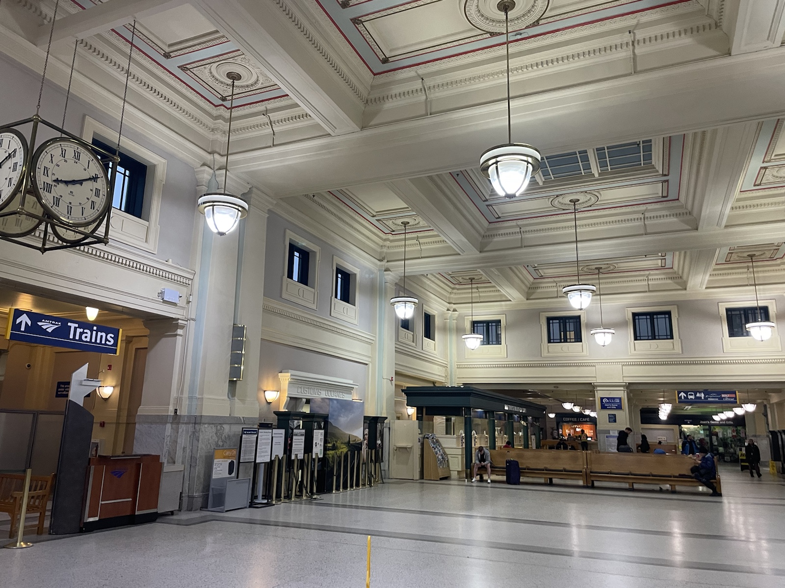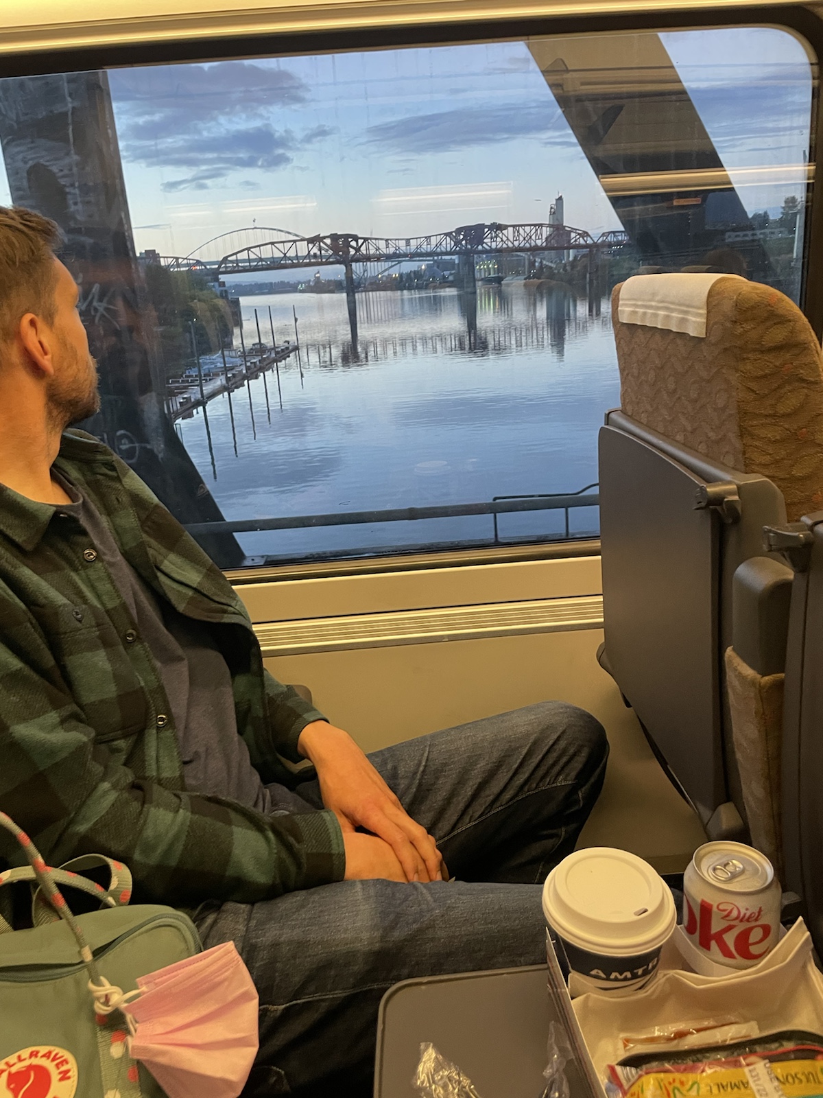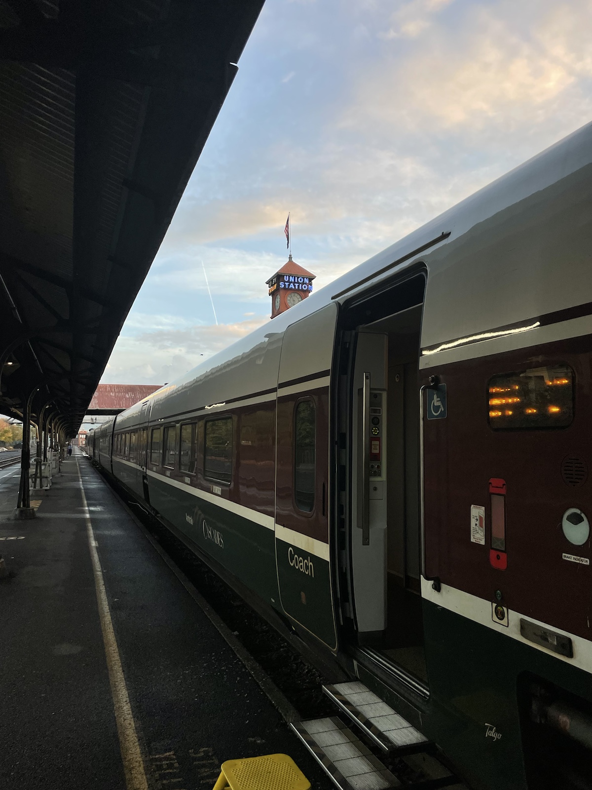 Wir kamen tatsächlich um 7.00 Uhr bei einem sehr leeren Bahnhof an. Dort wurden wir von einem sehr netten sicherheitsmann und einem Busfahrer begrüsst, die uns erklärten, wo unser Bus fahren würde (bis Seattle mussten wir mit dem Bus fahren, da derzeit – wegen Personalmangels – nur ein Zug pro Tag nach Seatlle fährt, danach mit dem Zug nach Eugene).Eine fast leere Bahnhofshalle. Chrigi und ich entschiede daher zum nebenan gelegenen Tim Hortons zu gehen.Vor der Abfahrt fanden wir zum Glück noch einen Briefkasten, um unsere Briefe zu verschicken, da wir bereits Kanadische Marke gekauft hatten.Dann kamen wir zur Anerikanisch/kanadischen Grenze. Ich bin immer etwas nervös, dass ich nicht in ein Land gelassen werde. Hier war ich speziell nervös, da wir keine Lebensmittel einführen dürfen und ich im grossen Koffer noch Salz hatte und Ramen Nudlen und Kakaopulver und Tee etc.Und wir sind in Amerika, im Pacific Northwest und ich bin glücklich.Seattle mit der Spaceneedle. Fast da.In Seattle hatten wir 1.5 Stunden aufenthalt in dieser schönen Halle.Schöne Halle, jedoch ohne Restaurants/Kaffe, weshalb ich zu Fuss zum nächstgelegenen Kaffee ging, um Kaffee für uns zu besorgen. Das Kaffee hiess Zeitgeist. Gefiel mir.Ein längerer Zwischenstop in Portland.Goodbye Portland.Eugene!Endlich kamen wir gegen 21.00 Uhr bei unserem Hotel an. Eines der Graduate-Kette, welche immer in Universitätsstädten sind und deren Einrichtung an diese anlehenen. Die University of Oregon hat als Maskottchen offensichtlich eine Ente. Die Gründer der Marke Nike waren Stundeten an der heusigen Uni und operierten zunächst aud Eugene heraus, weswegen der ganze Eingangsbereich mit Nike-Sachen dekoriert war.Wir verliessen unser Hotelzimmer nach unserer Ankunft sogleich wieder, um zum Vodoo Donuts zu gehen. Verständlicherweise.