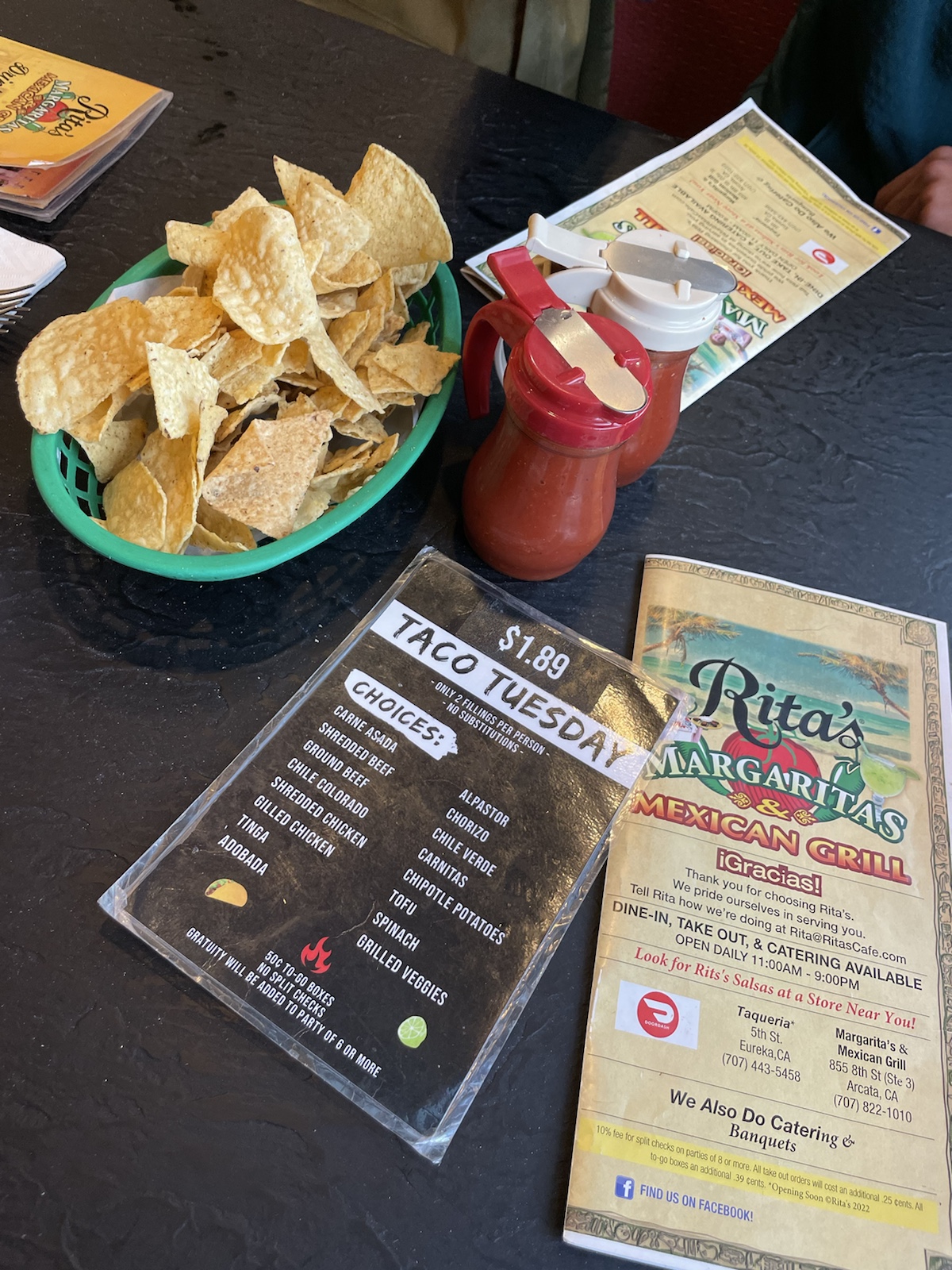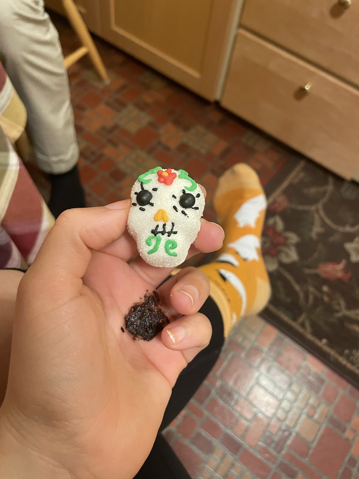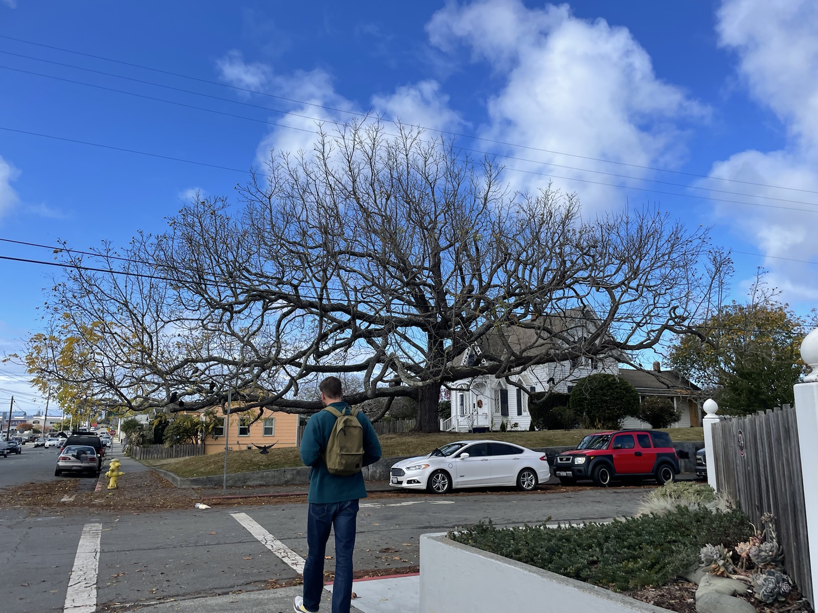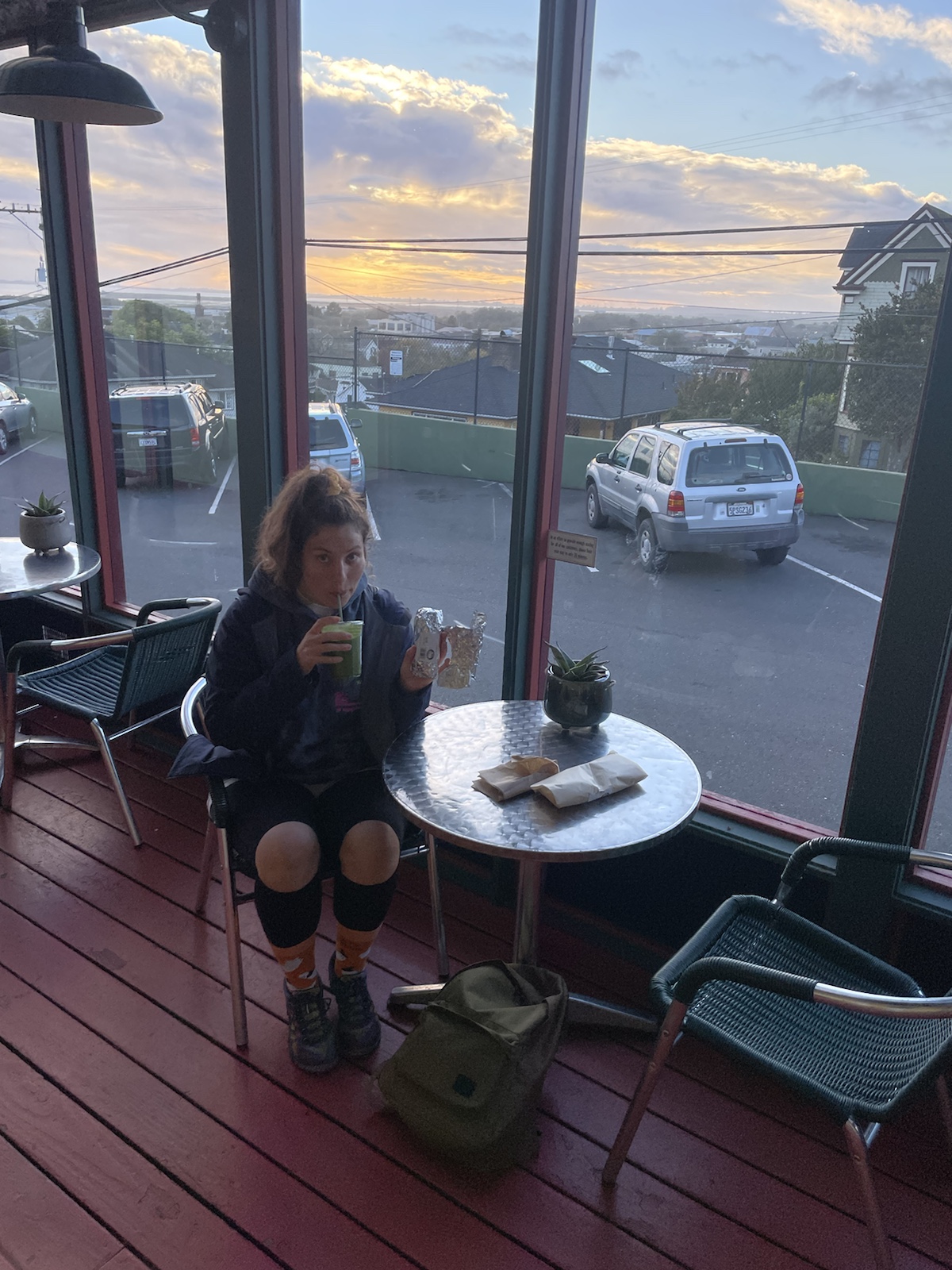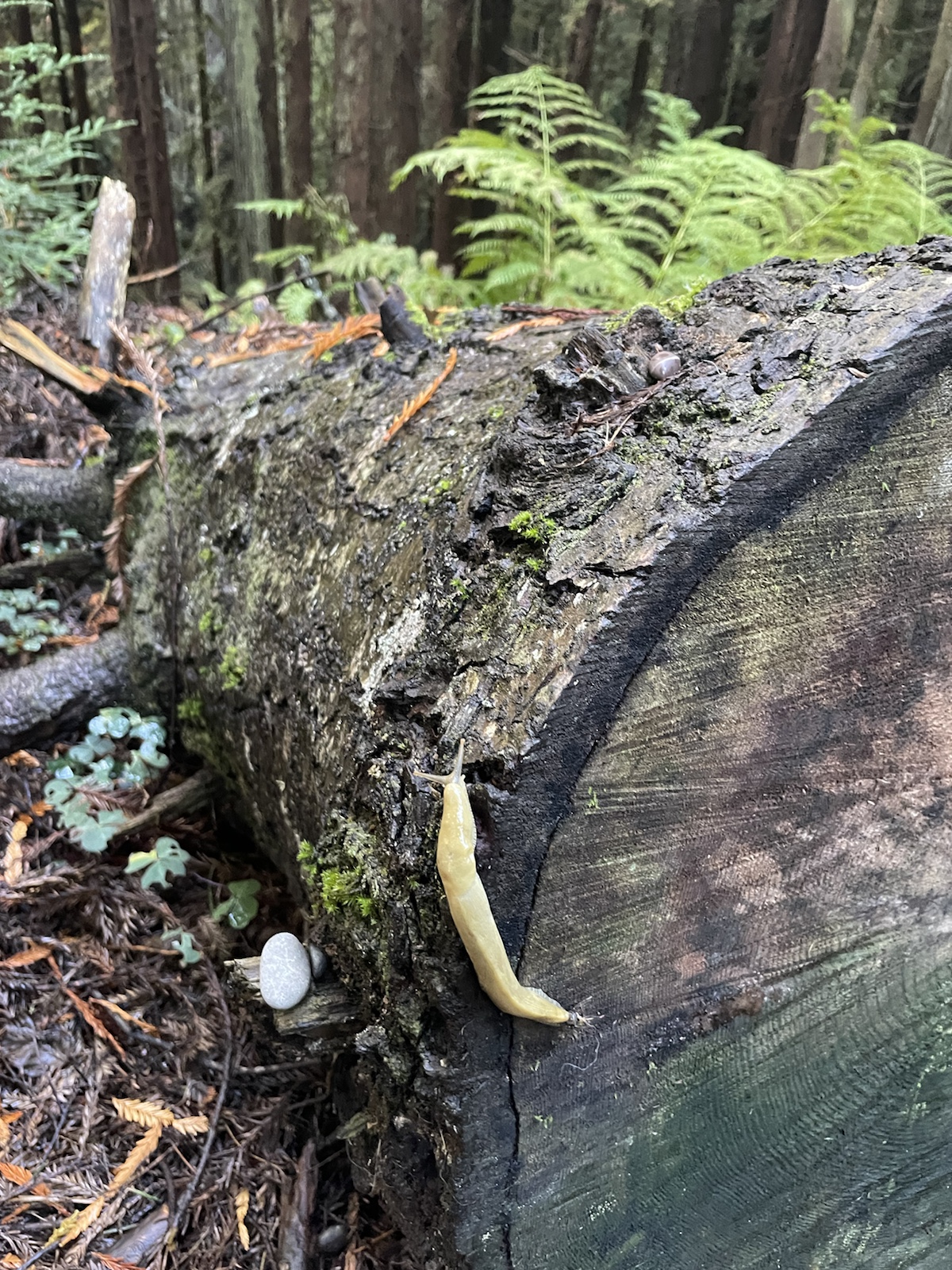Da ich schon immer einmal in eine Kletter- resp. Boulderhalle wollte, war ich begeistert, als ich herausfand, dass sich in Arcata eine Halle befindet.Chrigi war natürlich von beginn weg dynamisch und kraftvoll unterwegs..Und ich versuchte mein Bestes.Chrigi krabbelte hoch.... und ich versuchte mich festzuhalten.Es war ein super Erlebnis, welches ich unbedingt wiederholen wollte, obwohl ich nach dem Bouldern drei aufgeplatzte Blatern an den Handinnenflächen hatte.Wunderbarer Baum.Kleiner Kolibri.Taco Tuesday!Danach ein Besuch eines Altars, den ein ansässiges Bagelunternehmen (los Bagels) für den dia de Muertos eingerichtet hatte.Der nächste Morgen war verregnet, weshalb wor entschieden in den nahegelegenen Redwoodwald spazieren zu gehen, wo wir besser vom Regen geschützt sein würden.Banana Slug!BANANA SLUG!Nach rund 10km beendeten wir den Spazierganz, da ich vom Klettern ziemlichen Muskelkater hatte und uns auch das Tageslicht davonrannte.Da wir beide hungrig waren, entschieden wir im Wildberries eine Zwischenmalzeit einzubehmen. Dort fanden wir an der Aussenseite vom Wildberries einen kleinen Raum, von dem aus man auf die Lagune sehen konnte.Zum Znacht gab es Gemüse vom Samstagmarkt.Ausserdem Marshmallows. Meine aufgeplatzen Blatern an den Händen behandelte Karen mit Comfrey (echter Beinwell: https://de.wikipedia.org/wiki/Echter_Beinwell) aus ihrem Garten. Leider liess ich ihn zu lange trocknen und musste ihn danach von meinen Händen abreissen, was die Wunden wieder aufriss.Am nächsten Tag erschien die Sonne wiedee. Wir beschlossen noch einmal ans Meer zu gehen. Zunächst fanden wir den Zugang zum Meer nicht, dafür tausende von Kanadagänsen.Wir fanden es schliesslich und assen am kühlen und windigen aber sonnigen Strand unsere Sandwiches.Chrigi ging dann auf Schatzsuche und ich stand bis zu den Knien ins Wasser.Auf dem Rückweg kamen wie noch an einer schönen Brücke und…… einem Banana Slug (!!) vorbei. Meine Socken sind wegen dem vielen Sand an den Füssen verlehrt herum angezogen.Zum Teil trafen wir auch nach Halloween auf Halloweend-Dekorationen, was mich jedes mal freute.