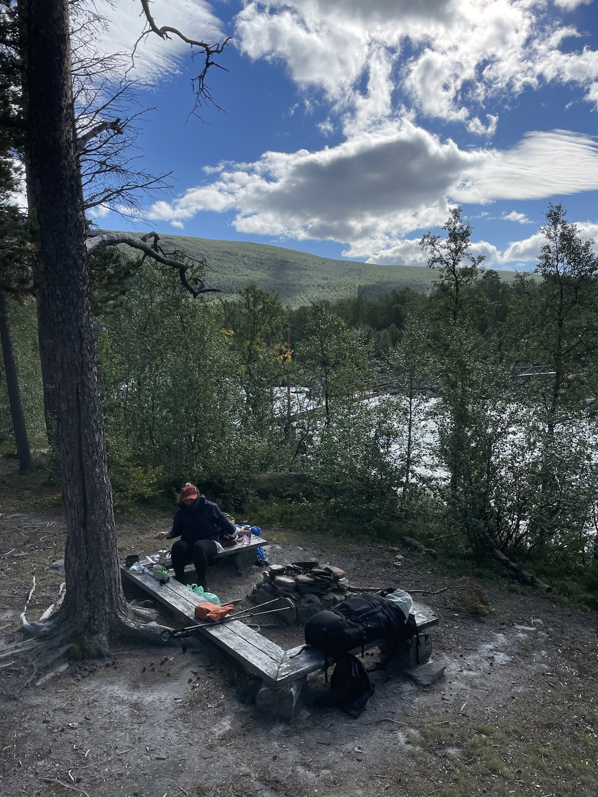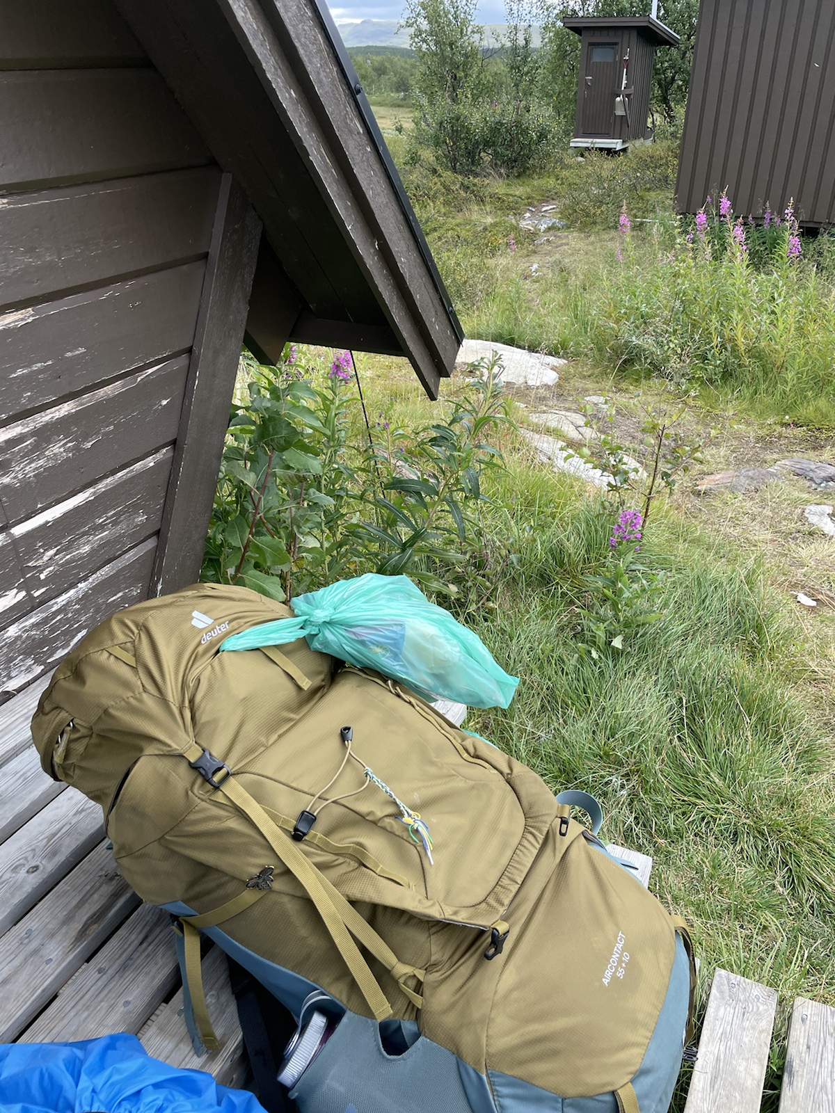 Dort „resupplieten“ wir. Wir füllten also unsere Vorräte auf, wobei wir essen für vier Tage einkaufen. (Wir platen zwar, am vierten Tag in Jäkkvik anzukommen, jwdoch wird generell geraten, immer esse für einen Extratag mitzunehmen, weil man ja nie weiss). Es hatte nur 800 Gramm Packungen Haferflocken, weshalb wir viel zuviel Porridge mitnehmen mussten (wir befinden und in der Zwischenzeit in Jäkkvik und haben noch immer für ungefähr vier Zmorgen Porridge. Neu dabei hatten wir heisse Schokolade, welche an kalten Abenden wunder vollbringen kann. Was mich beim Wandern sehr stört, ist, dass man extrem viel plastik benötigt. Wir versuchen so wenig wie möglich zu benutzen nur ist alles einfach Plastik…
