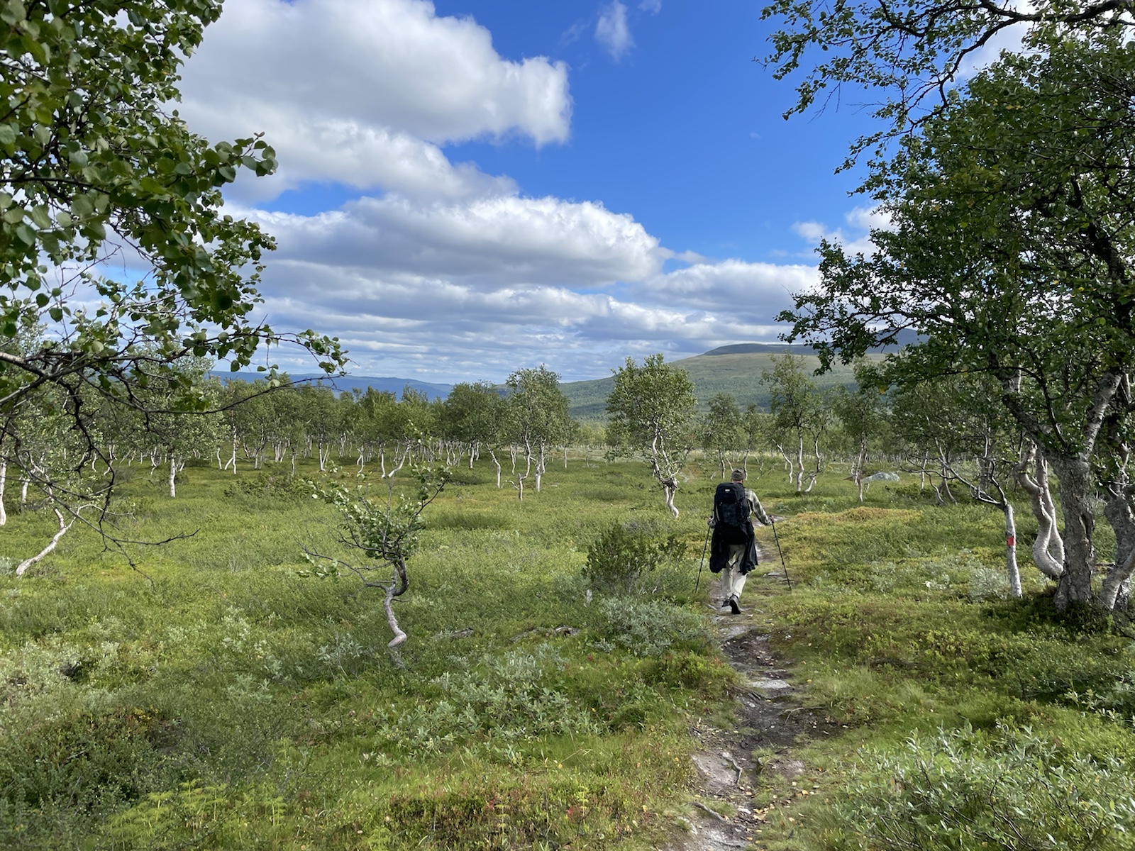 Am zweiten Tag trafen wir bei einer Pause vor dem Gewitter, bei der wir unsrre Regensachen bereitstellten und unsere Rucksäcke mit dem Regenschutz abdeckten, auf zwei Schweden. Die beiden waren Brüder, wobei der eine sehr gesprächig und den andere extrem schweigsam war. Wir machten sie auf das nahende Gewitter aufmerksam, wobei der eine meinte, er beibachte die Wolken und es werde nicht kommen. Kurz daraugf begann der Regen, wobei das Gewitter uns nur streifte. Am Folgetag begegneten wir ihnen am Morgen in der Hütte (in der wir uns aufwärmten) erneut. Dort erklärte ef, dass sie vom Regen überrascht worden seien. Von ihm erhielt ich die Information, dass die STF Hütten jeweils Wettervorhersagen beim Eingang aufliegen haben. Am Abend trafen wir in der nächsteb STF Hütte erneut auf sie, nachdem wir sie unterwegs überholt hatten. Die beiden erklärten uns, dass sie eine Abkürzung nach Ammarnäs nehmen würden, damit sie noch am selben Abend dort ankommen und ein Bier trinken können (wir nahmen den längeren Weg und hatten deswegen eine Übernachtung mehr im Zelt). Der schweigsame Bruder wollte dann in Ammarnäs nach Stockholm zurück und der gesprächigere wollte nach Jäkkvik weiterwandern (ca. 91 km). Da wir eine Nacht länger haben würden, verabschiedeten wir uns von ihnen, da wir erst gegen Mittag in Ammarnäs ankommen würden und der eine dann beteits im Bus und der anderr auf dem Wanderweg sein würde. In Ammarnäs trafen wir jedoch in der Herberge erneut auf sie. Zuerst auf den schweigsamen, welche zum ersten Mal mit uns sprach. Die beiden erklärten uns dann, dass beide nach Stockholm zurückreisen würden, zumal die Knie des gesprächigeren nach der letzten Etappe stark zu schmerzen begonnen hätten.