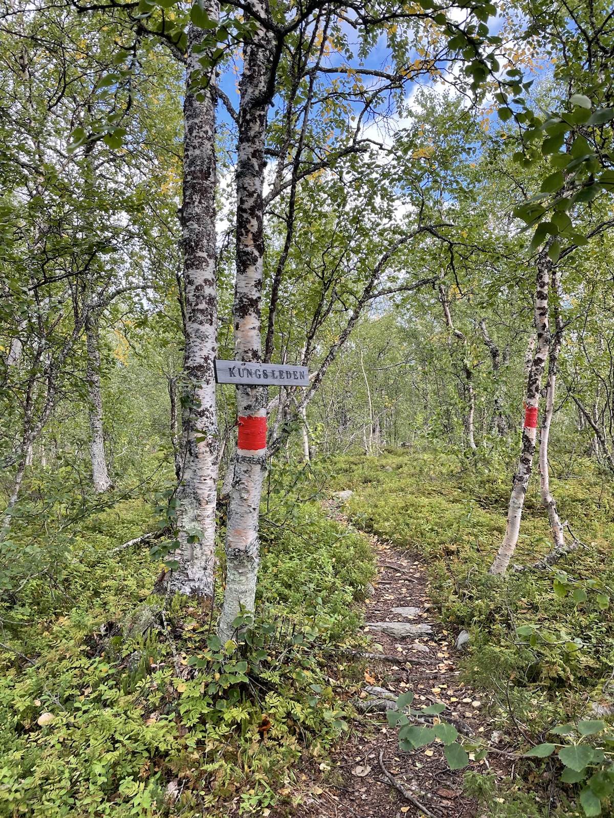 An diesem Tag sahen wir wetterbedingt ca 7 Regenbögen, wobei dieser der mit Abstand am beeindruckendste war. Wie auch bei den Rentieren fotografierten wir die ersten 3 mit begeisterung und die letzen nahem wir nur noch zur Kenntnis. Dies könnte jedoch auch an der Erschöpfung liegen, da der zunehmende ab uns zehrte. Die orangen Steine sind die Wegmarkierungen des Sommerkungsleden. Links auf dem Bild die Holzpfosten markieren den Winterkungsleden (der teilweise einen anderen Steckenverlauf hat und auch bei Schnee sichtbar sein muss, obwohl die Holzpfosten auf den Fotos etwas unästhetisch sind und den Eindruck von Zivilisation vermitteln – wobei Letztere nicht vorhanden war).